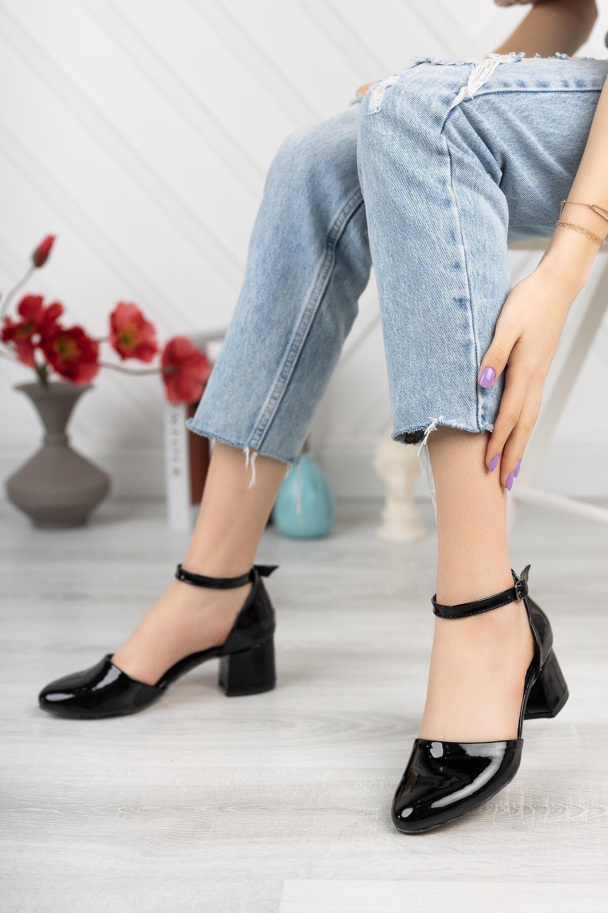 Klasik tasarımıyla her ortama uyum sağlayan siyah deri topuklu ayakkabı, şıklığınızı tamamlar