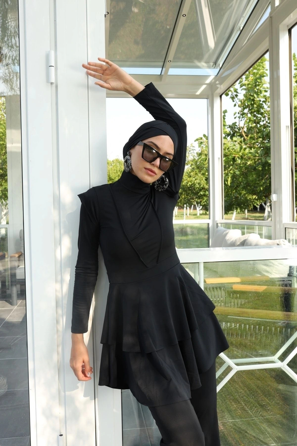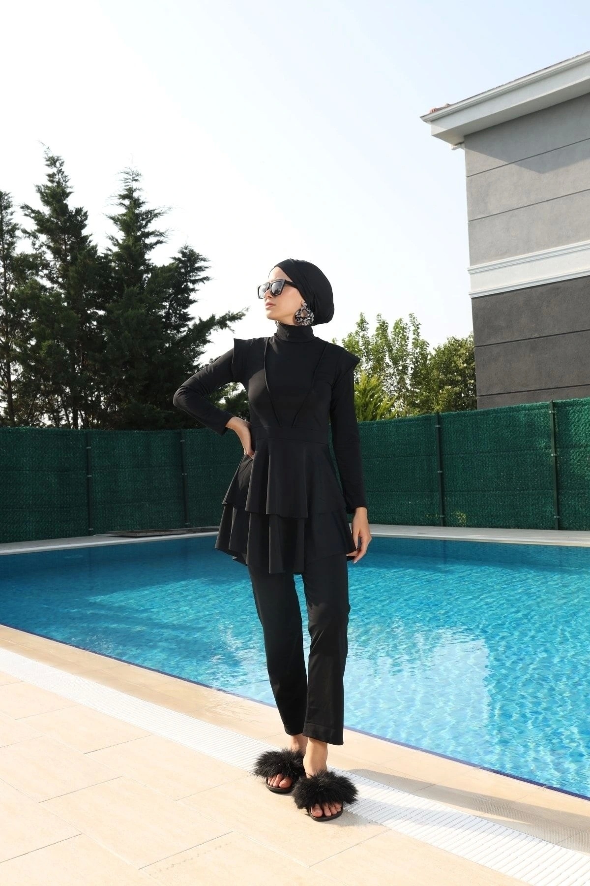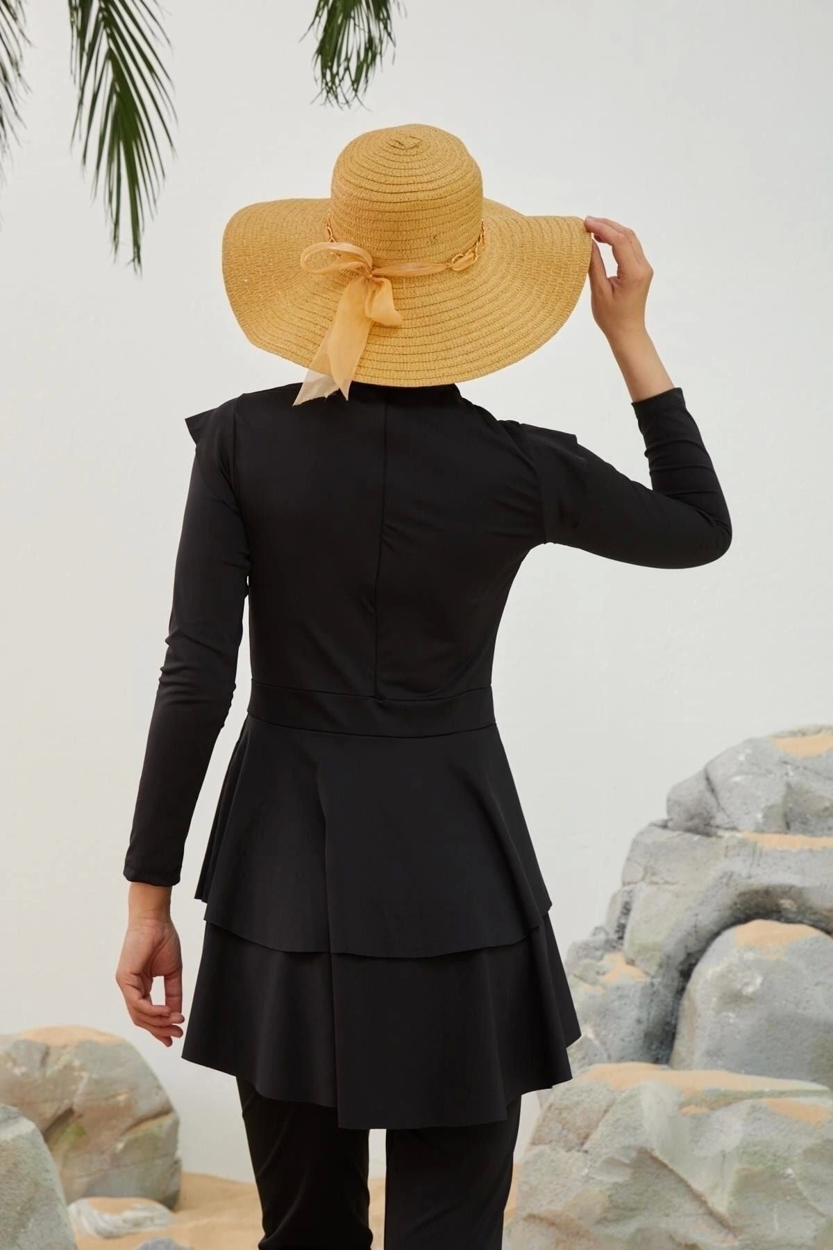 Starinci Tam Kapalı Likralı Tesettür Mayo Siyah Tam kapalı mayo takımı pantolon, elbise, çapraz bone ve büstiyerden oluşmaktadır.