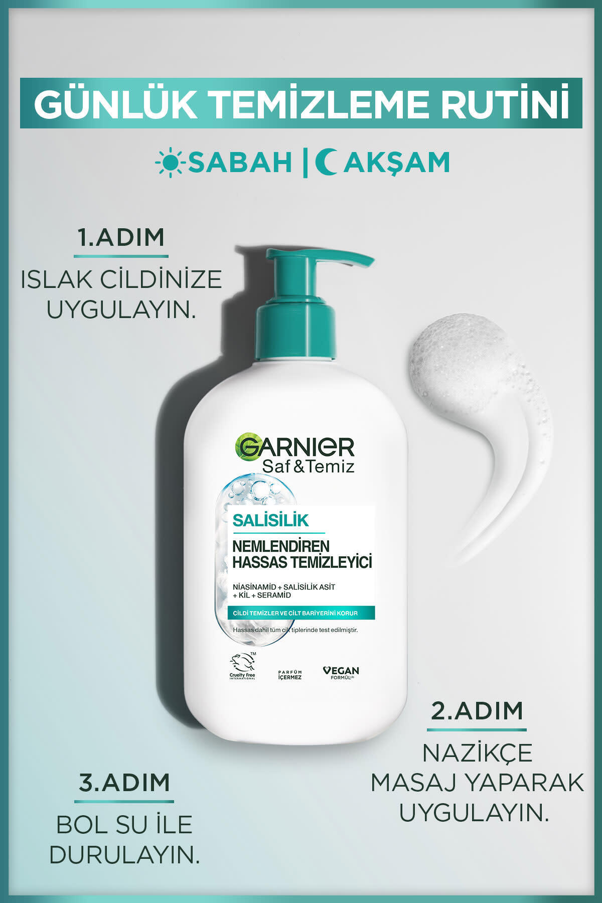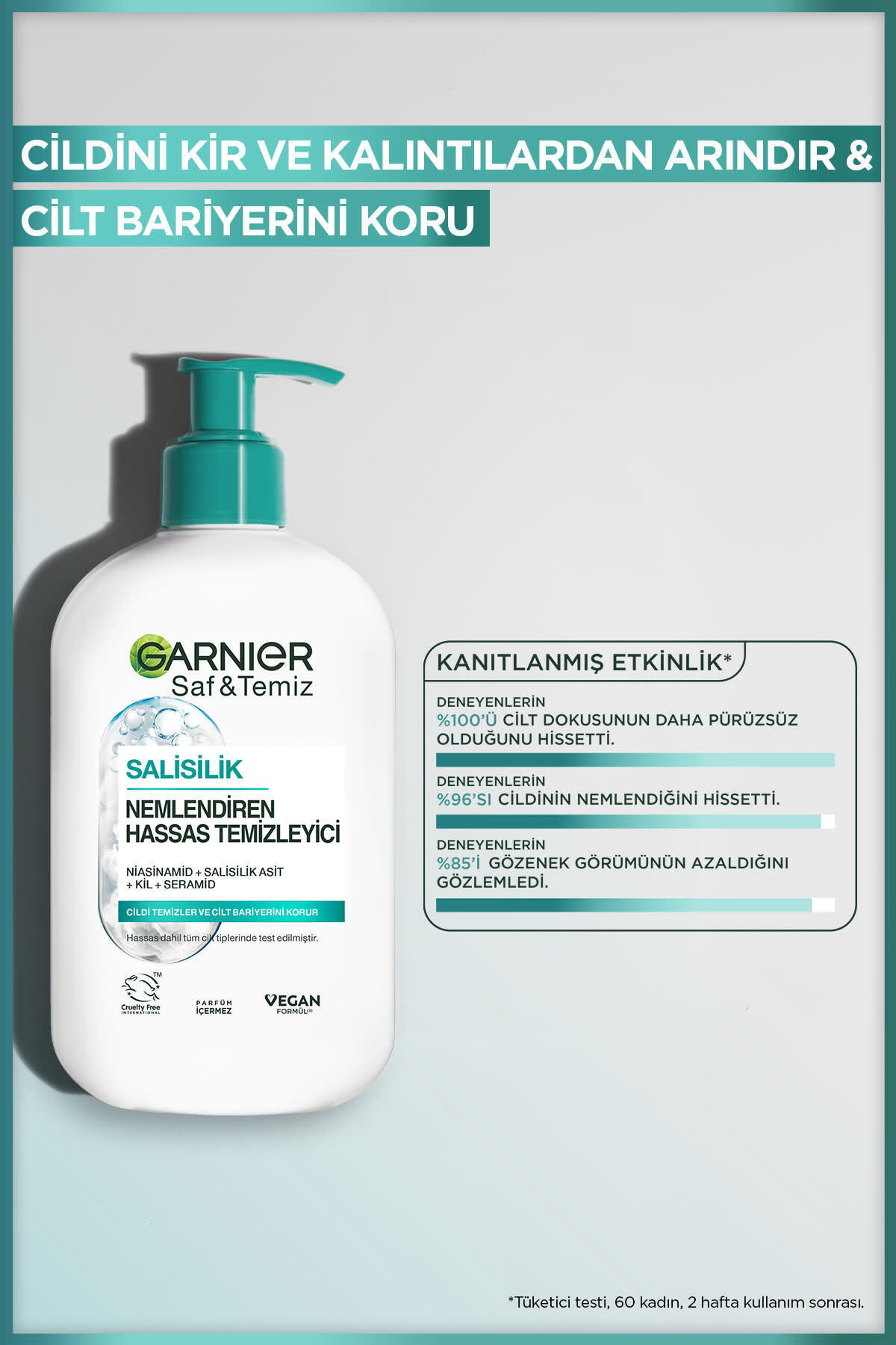 Garnier Saf Temiz Nemlendiren Temizleyici, [Hyaluronik Asit + Seramid + Kil] ile zenginleştirilmiş formülü ile cildi nazikçe temizleyerek yoğun bir şekilde arındırır, gözenek görünümünü azaltır ve pürüzsüz bir cilt görünümü sağlar. Üstelik hassas dahil tüm cilt tipleri için uygundur.