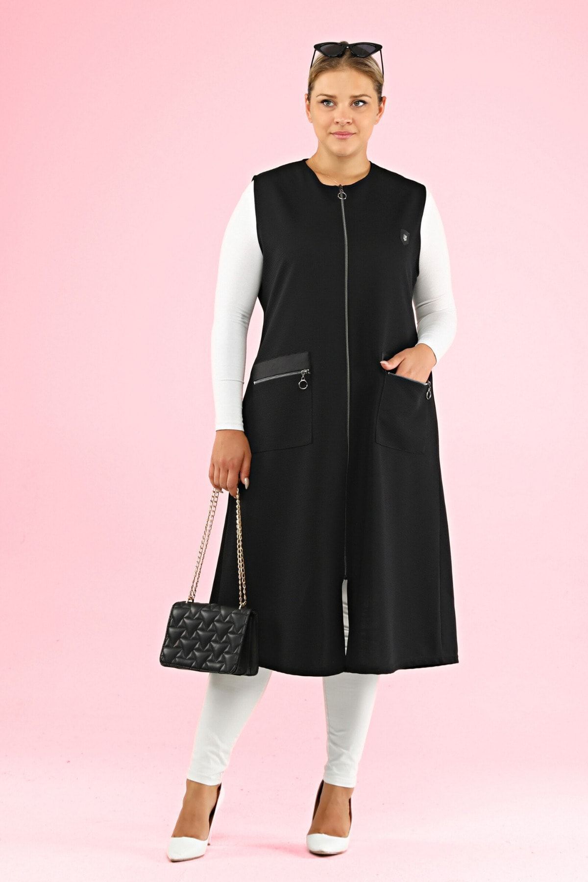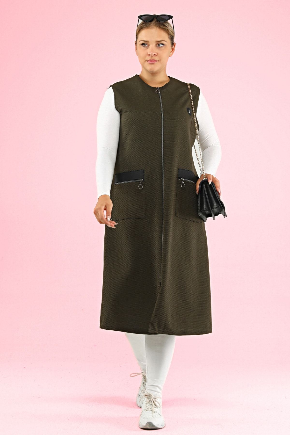 Kadin Uzun Kolsuz Fermuarli Yelek Deri Cepli Ottoman Modelimiz Siyah, Vizon, Haki ve Lacivert Renktedir..