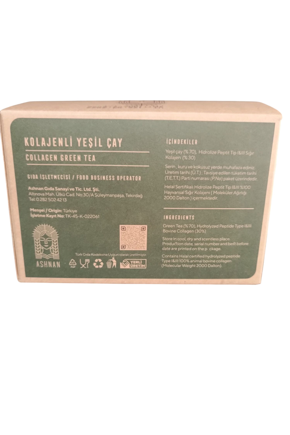 Ashnan Kolajenli Yeşil Çay Zarflı 20 Süzen Poşet Çay 1,6 g x 20=32 g Her süzen poşet çay 500 mg Helal Sertifikalı Tip1&Tip3 Sığır Hidrolize Kolajen Peptit İçermektedir.Kolajen moleküler ağırlığı 2000 daltondur.İçindekiler: Yeşil çay (%70), Hidrolize Peptit Tip1&Tip3 Sığır Kolajen (%30) Önerilen Kullanma Biçimi Fincana 1 adet poşet çay koyunuz.