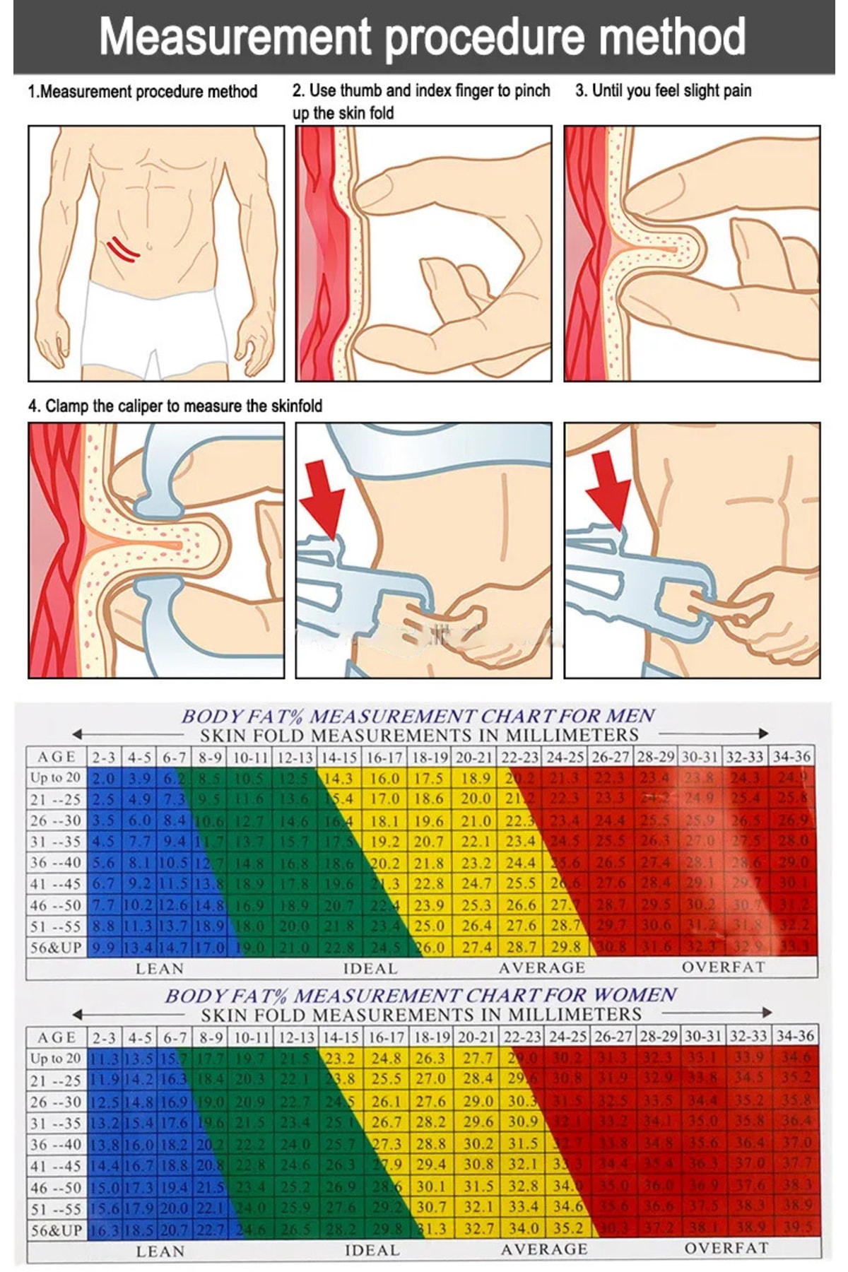 Then, squeeze the caliper until the "press" mark sits in the middle of the fold, and the moving measurement indicator measures the skinfold thickness.