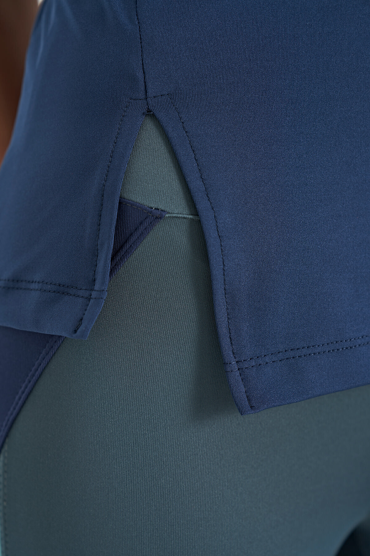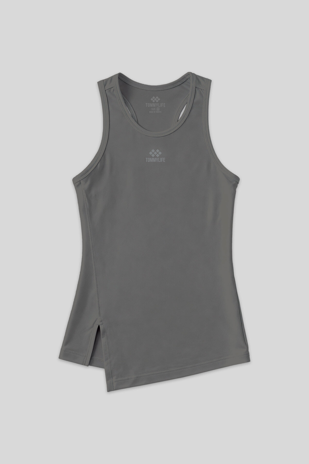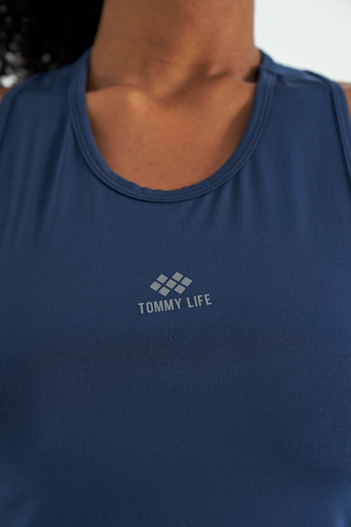 Sportif şıklığı ve rahatlığı bir arada sunan Indigo yırtmaç detaylı o yaka sıfır kollu standart kalıp kadın spor atlet, günlük kullanım için idealdir