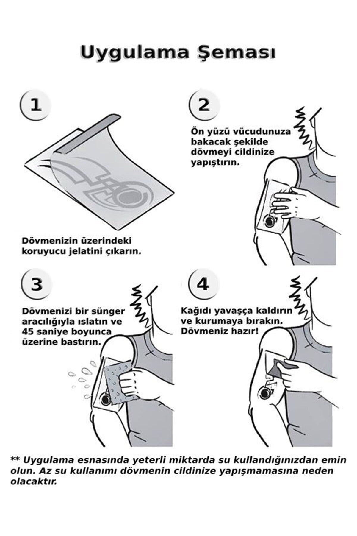 Üzerindeki koruyucu jelatini kaldırıp vucudunuza yapıştırıp ıslak pamuk veya bez ile tamamen dövmeyi ıslatıp 30 saniye üzerine bastırın ve kağıdı kaldırın
