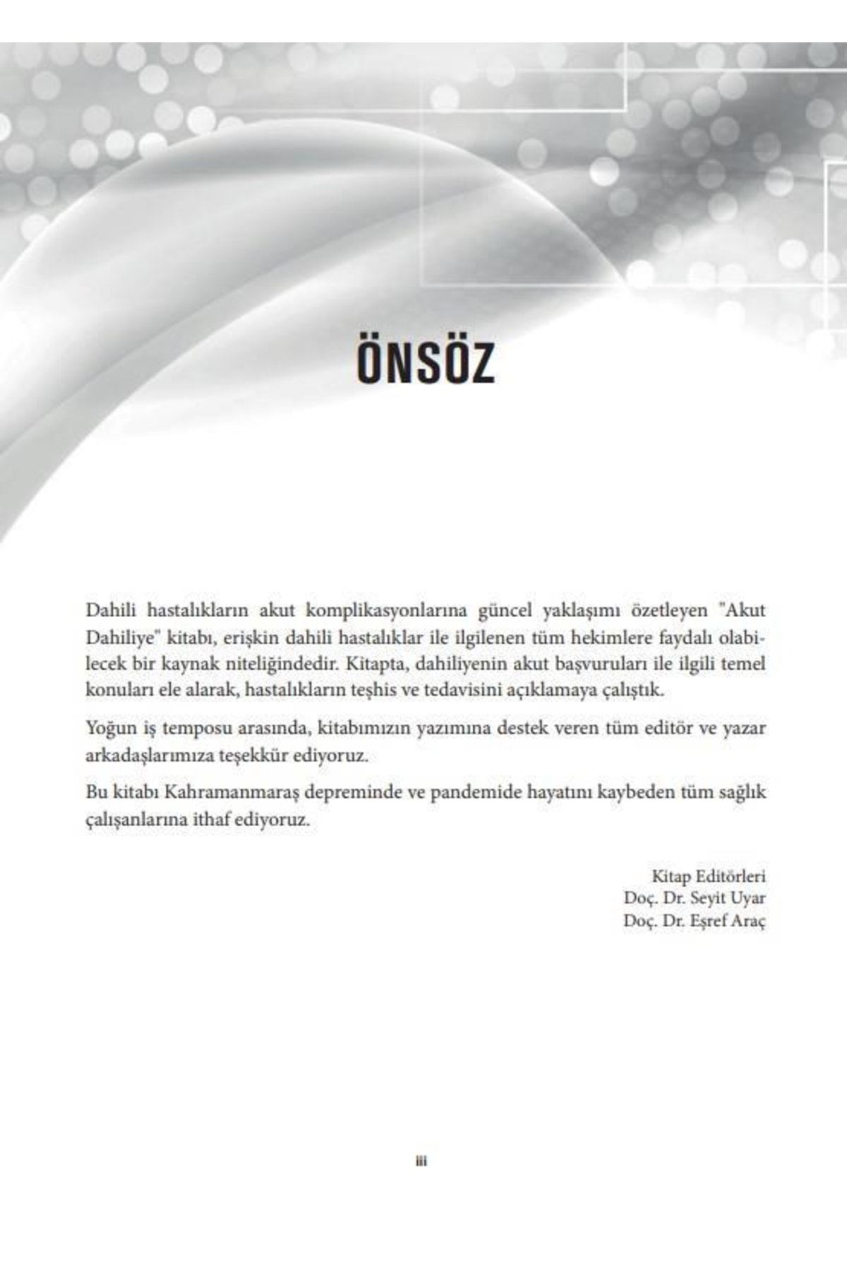 Dahili hastalıkların akut komplikasyonlarına gu¨ncel yaklaşımı özetleyen "Akut Dahiliye" kitabı erişkin dahili hastalıklar ile ilgilenen tu¨m hekimlere faydalı olabilecek bir kaynak niteliğindedir