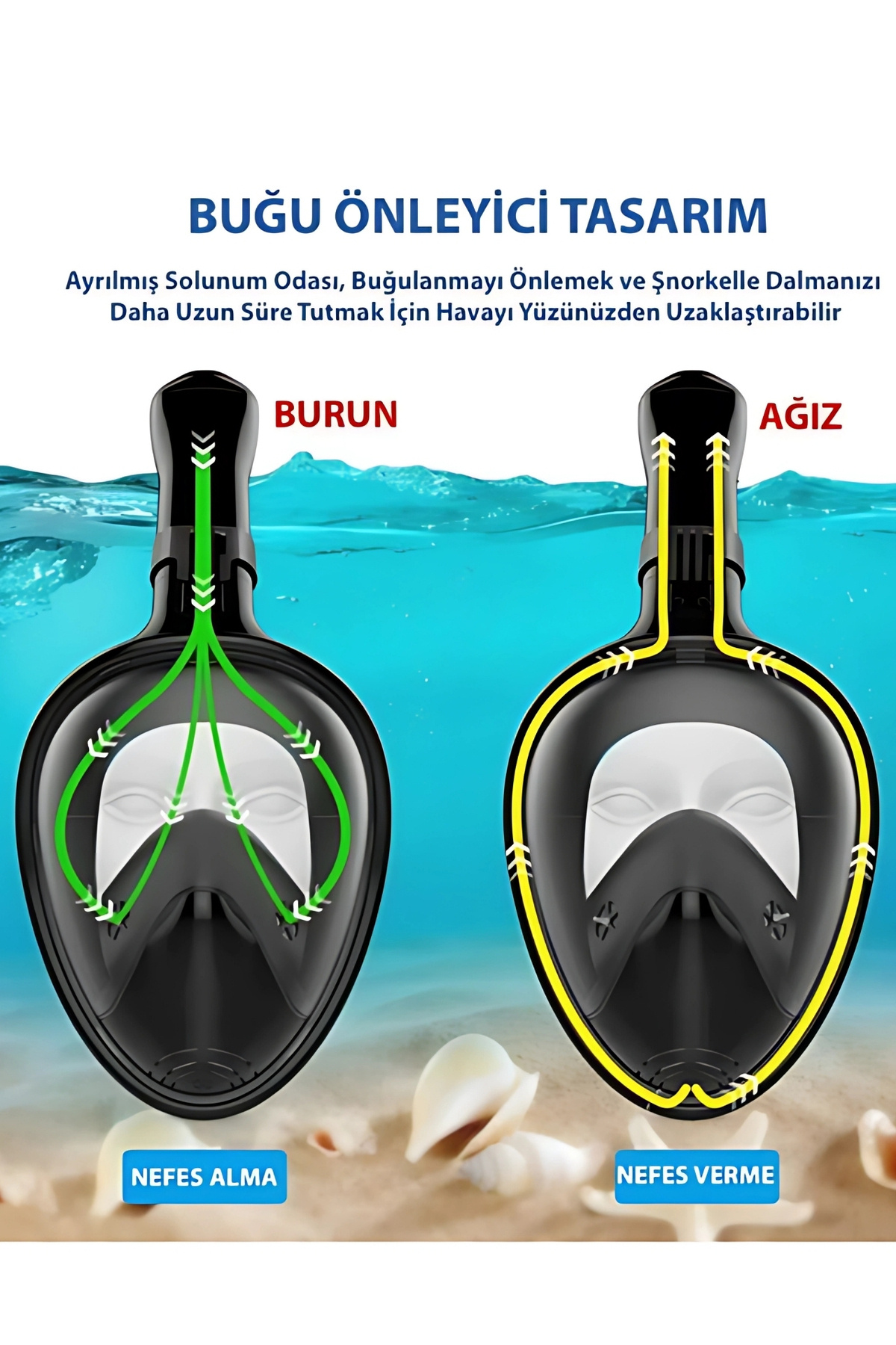 - Tam yüz koruması sağlayan Fullface Şnorkel Yüzücü Maskesi, su altı maceralarınızda maksimum güvenlik sunar.