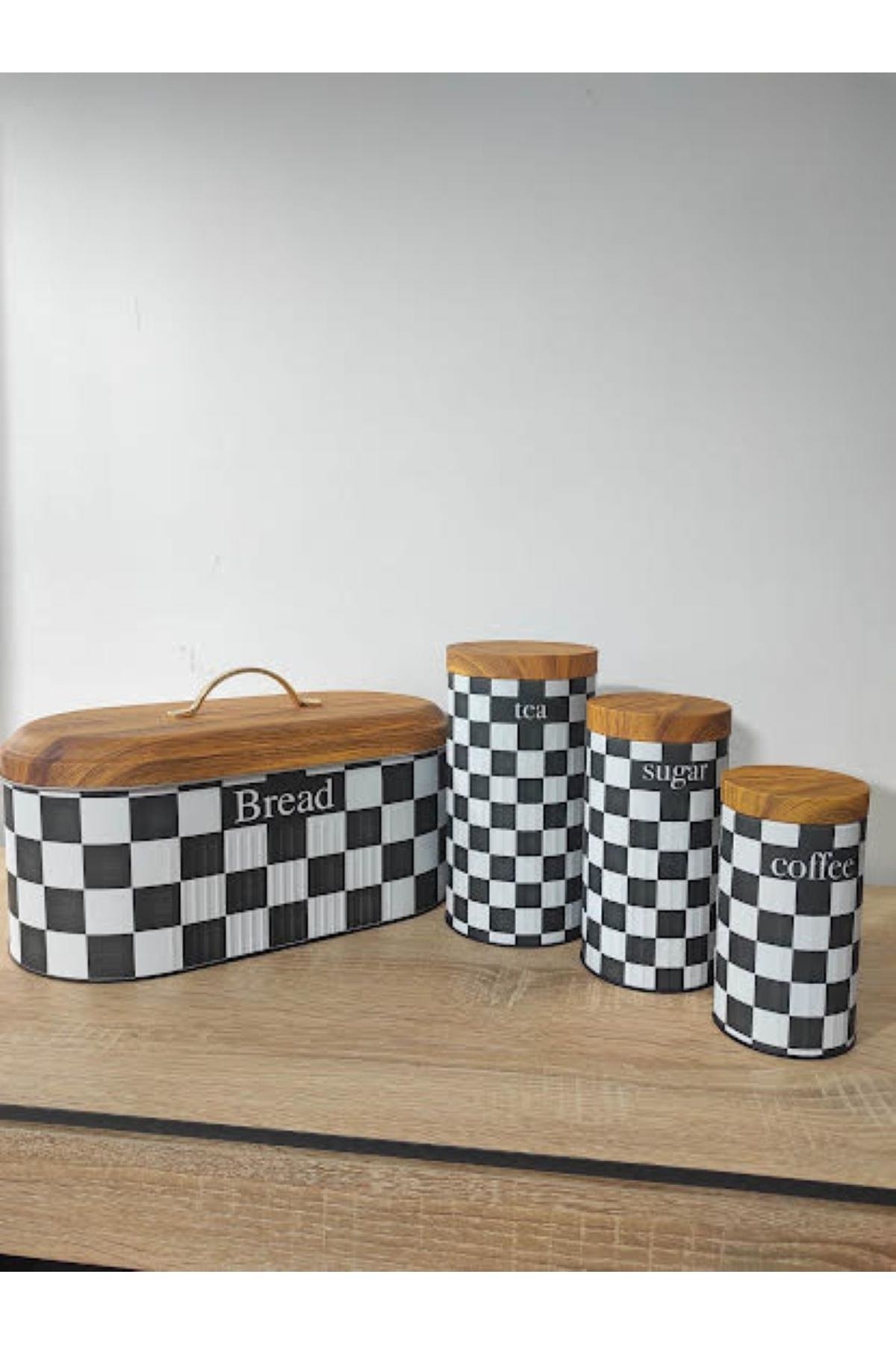 Bambu Görünümlü Kapak Metal Ekmeklik Ve 3Lü Kavanoz Seti-Dama