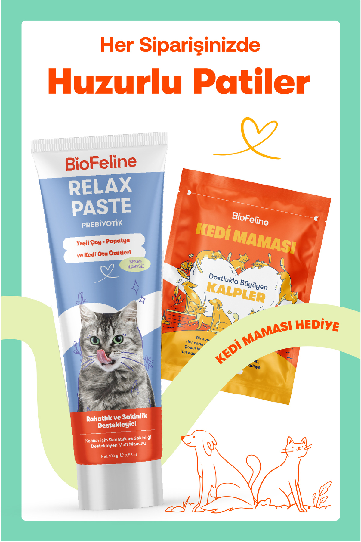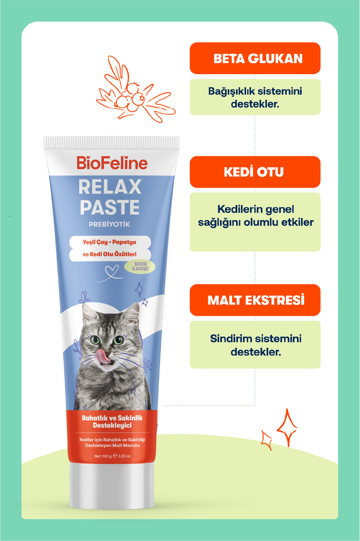 Biofeline Relax Paste Macun, kedinizin günlük stresini hafifletmeye yardımıcı doğal içeriklerle hazırlanan bir destek ürünü. Kedi otu, kantaron ve beta-glukan gibi bileşenler sayesinde taşınma, veteriner ziyareti, yeni ortama alışma gibi durumlarda huzursuzluk ve kaygı belirtilerini yatıştırır. Aynı zamanda bağışıklık sistemini ve sindirim sağlığını destekleyerek genel refahı artırır.
