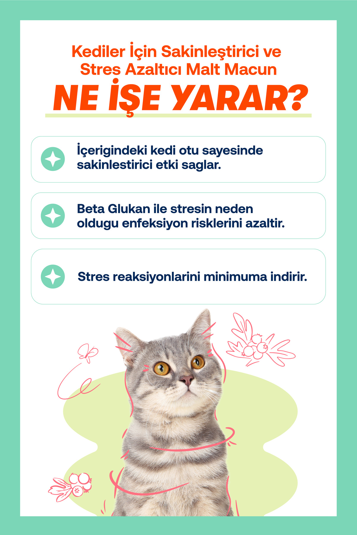 Yeni ortam, taşınma veya veteriner ziyareti gibi stres kaynaklarına karşı duyarlılığı hafifletir.