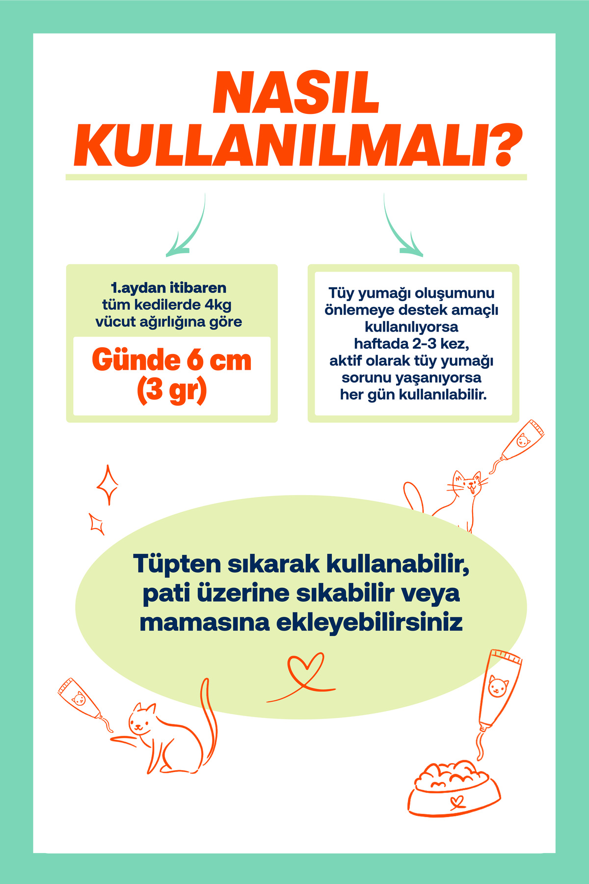 Yetişkin kediler için günlük yaklaşık 2-3 cm macun önerilir (küçük / hafif kediler için doz azca düşürülebilir).