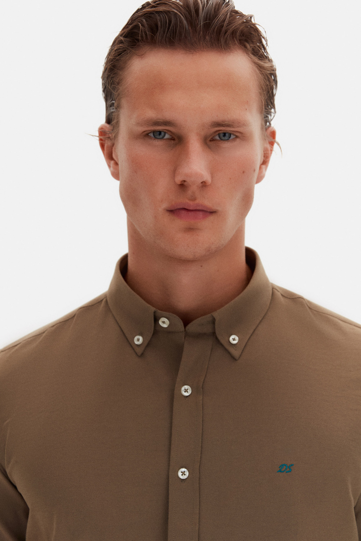 Ds Damat Slim Fit Haki Oxford Düğmeli Yaka Kolay Ütülenebilir Nakış Detaylı Pamuklu Gömlek