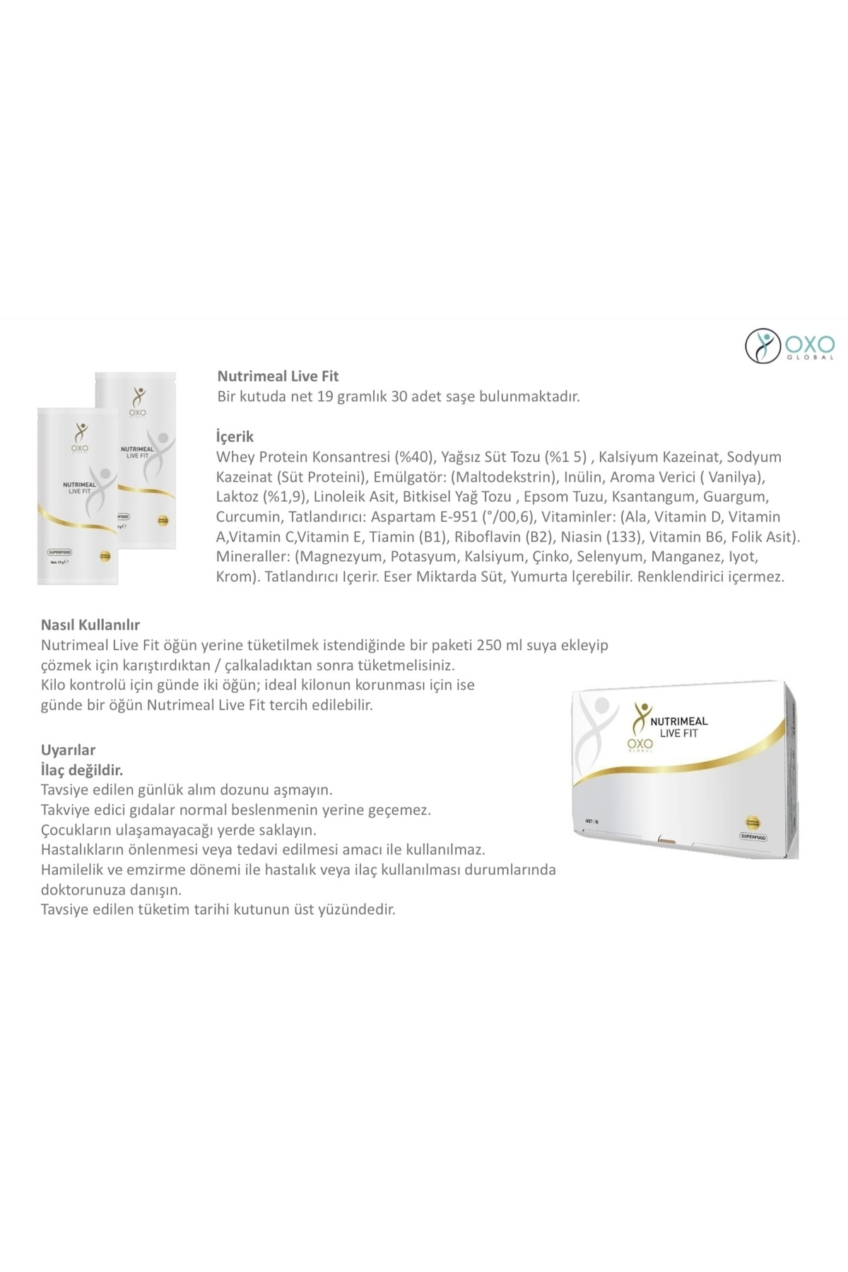 KULLANIM ŞEKLİ: Nutrimeal Live Fit öğün yerine tüketilmek istendiğinde bir paketi 250 ml suya ekleyip çözmek için karıştırdıktan / çalkaladıktan sonra tüketmelisiniz.