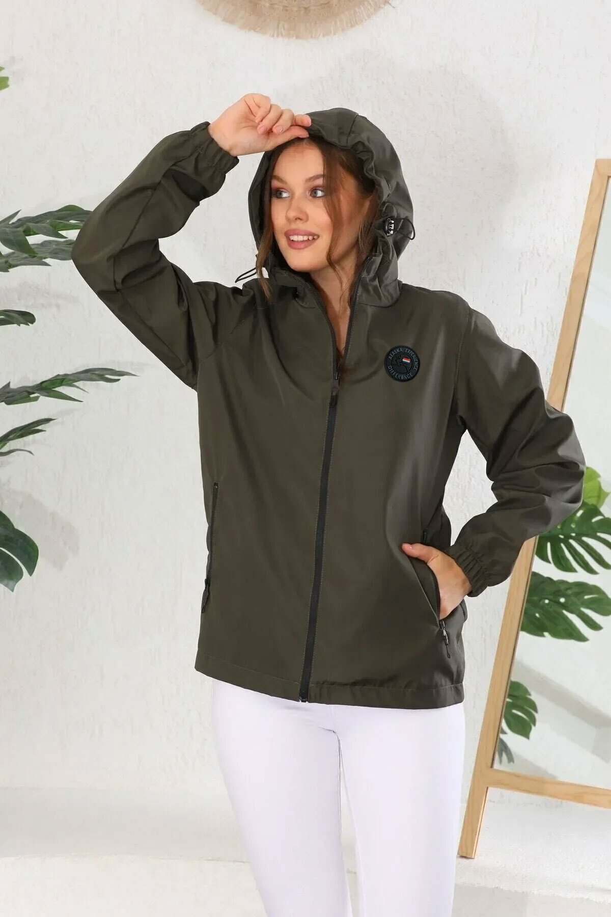 Unisex tasarımıyla her yaştan kadının kullanımına uygun, düz desenli haki yağmurluk.