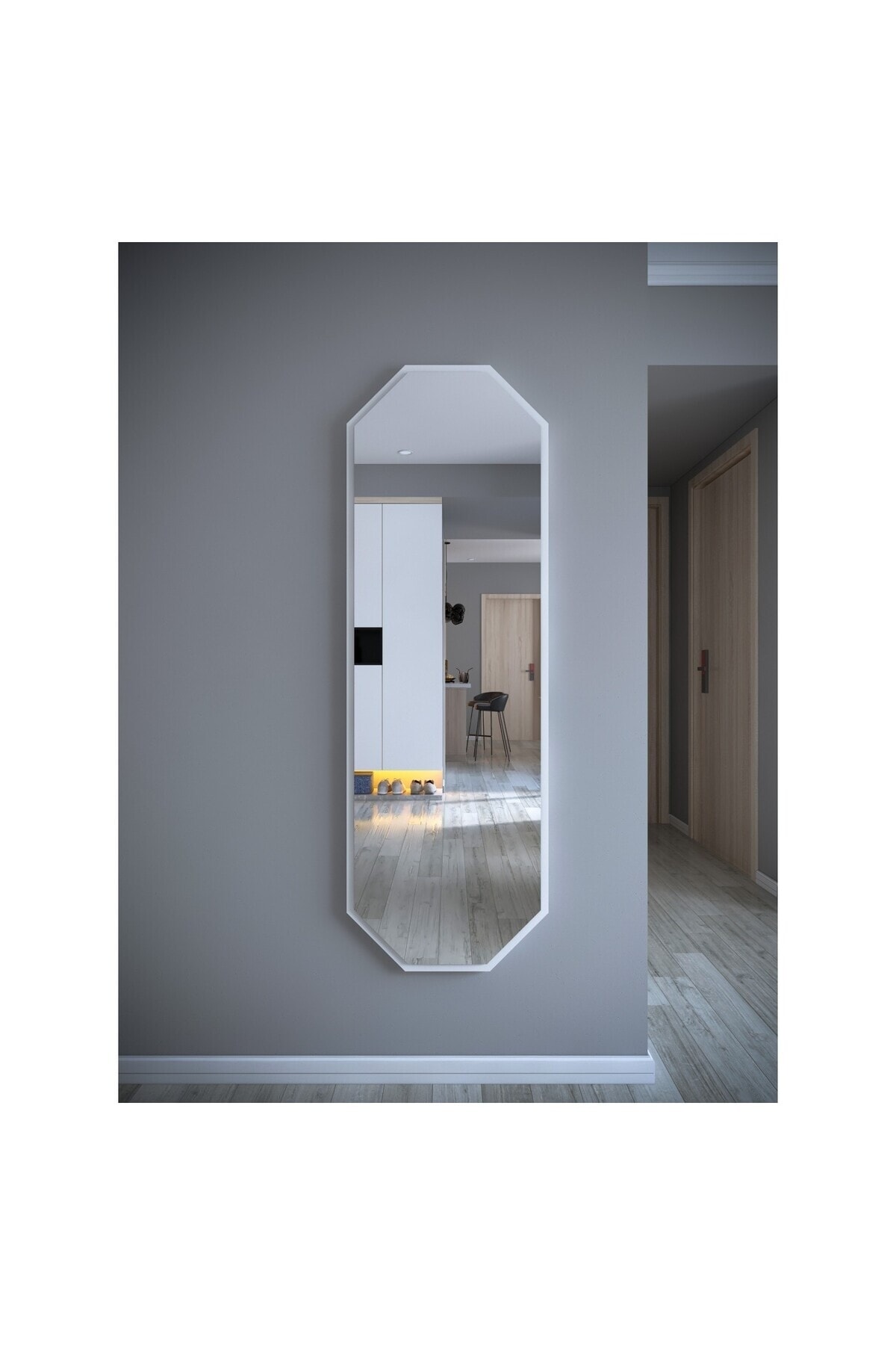 Modern ve şık tasarımıyla her mekâna uyum sağlayan geometrik şekilli dekoratif boy aynası