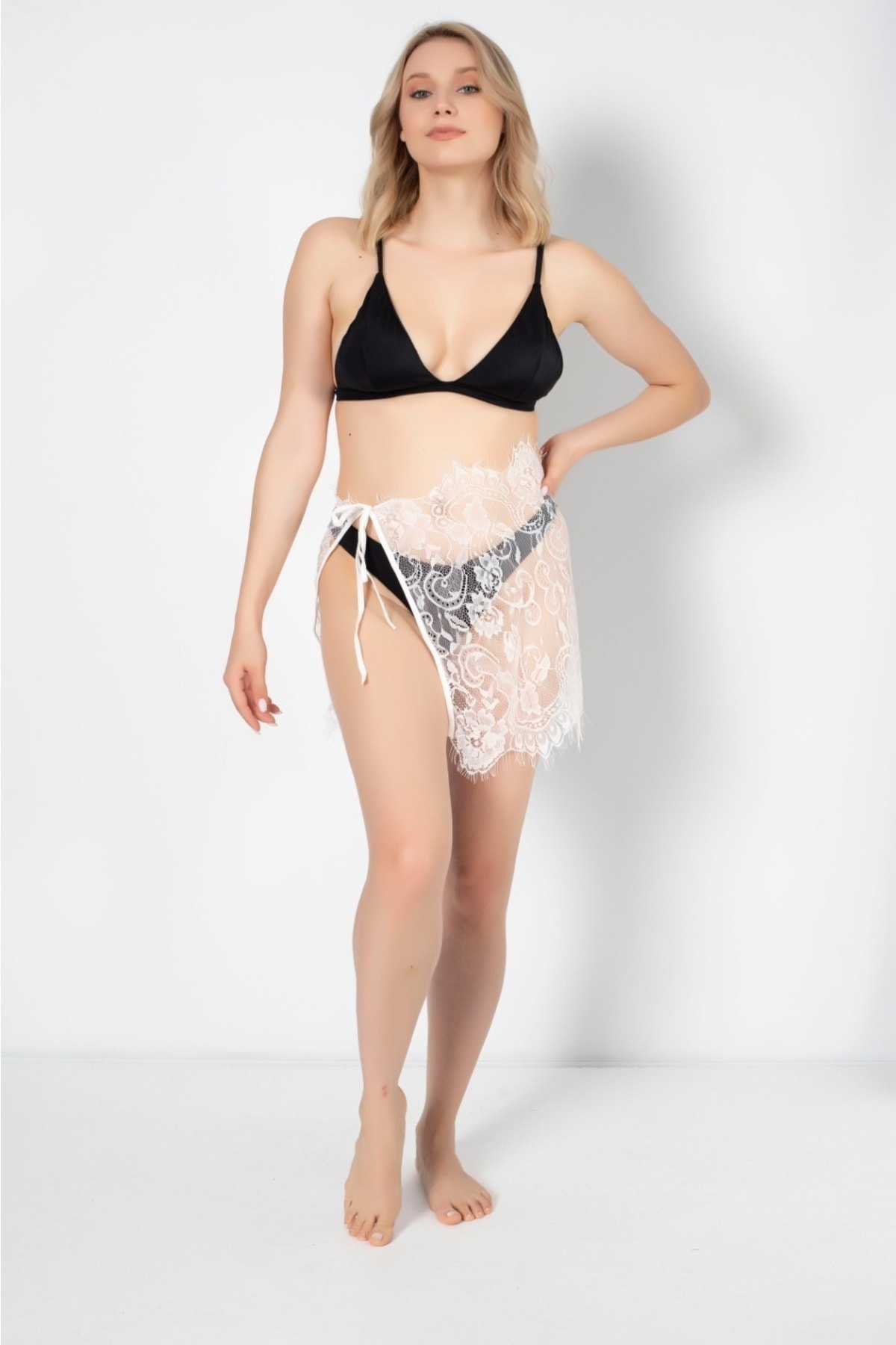 Zarif dantel dokumasıyla tasarlanmış, plaj tekstili koleksiyonunun şık bir parçası olan beyaz kısa pareo.