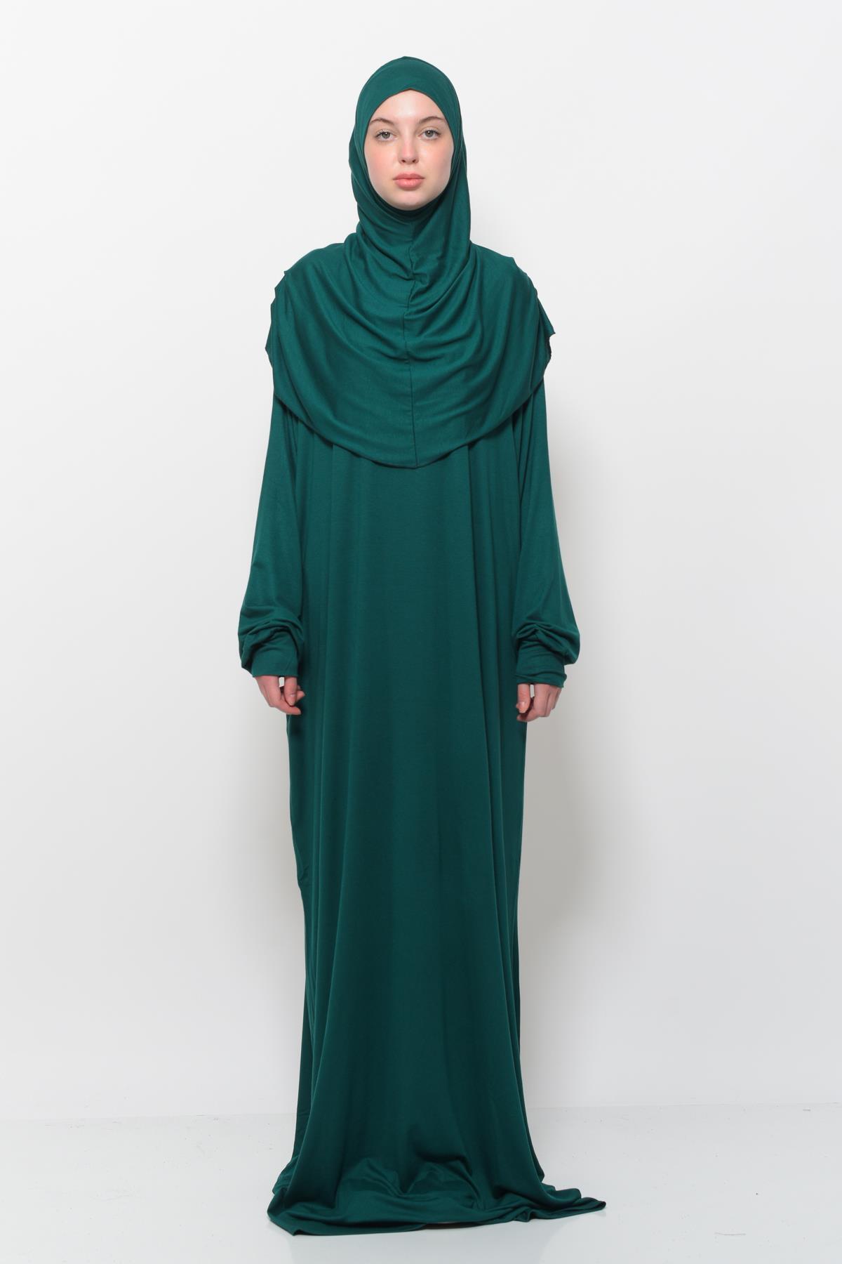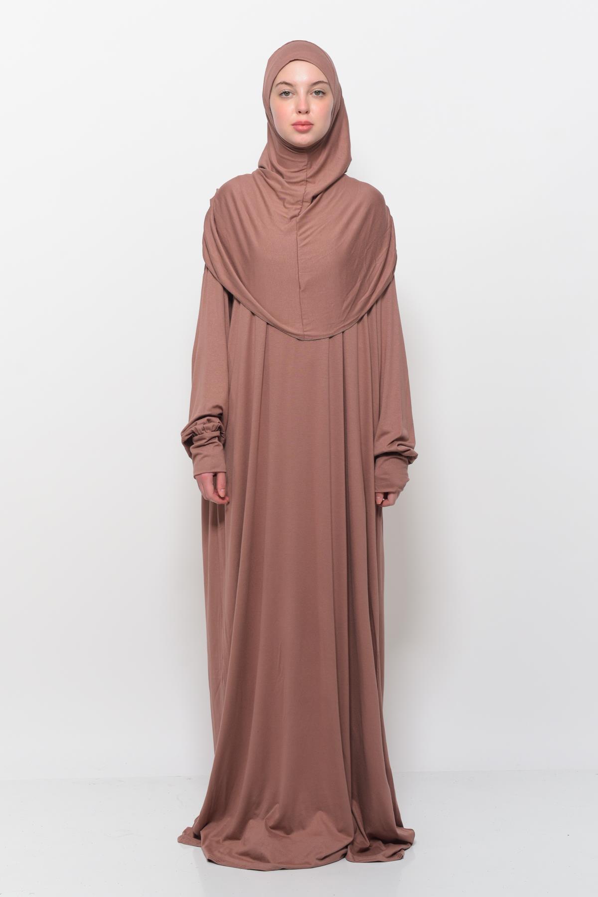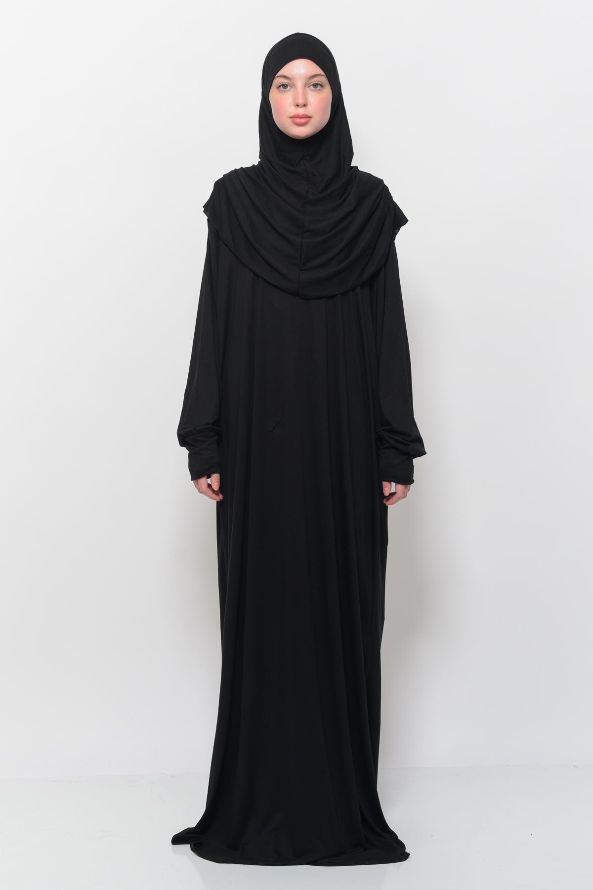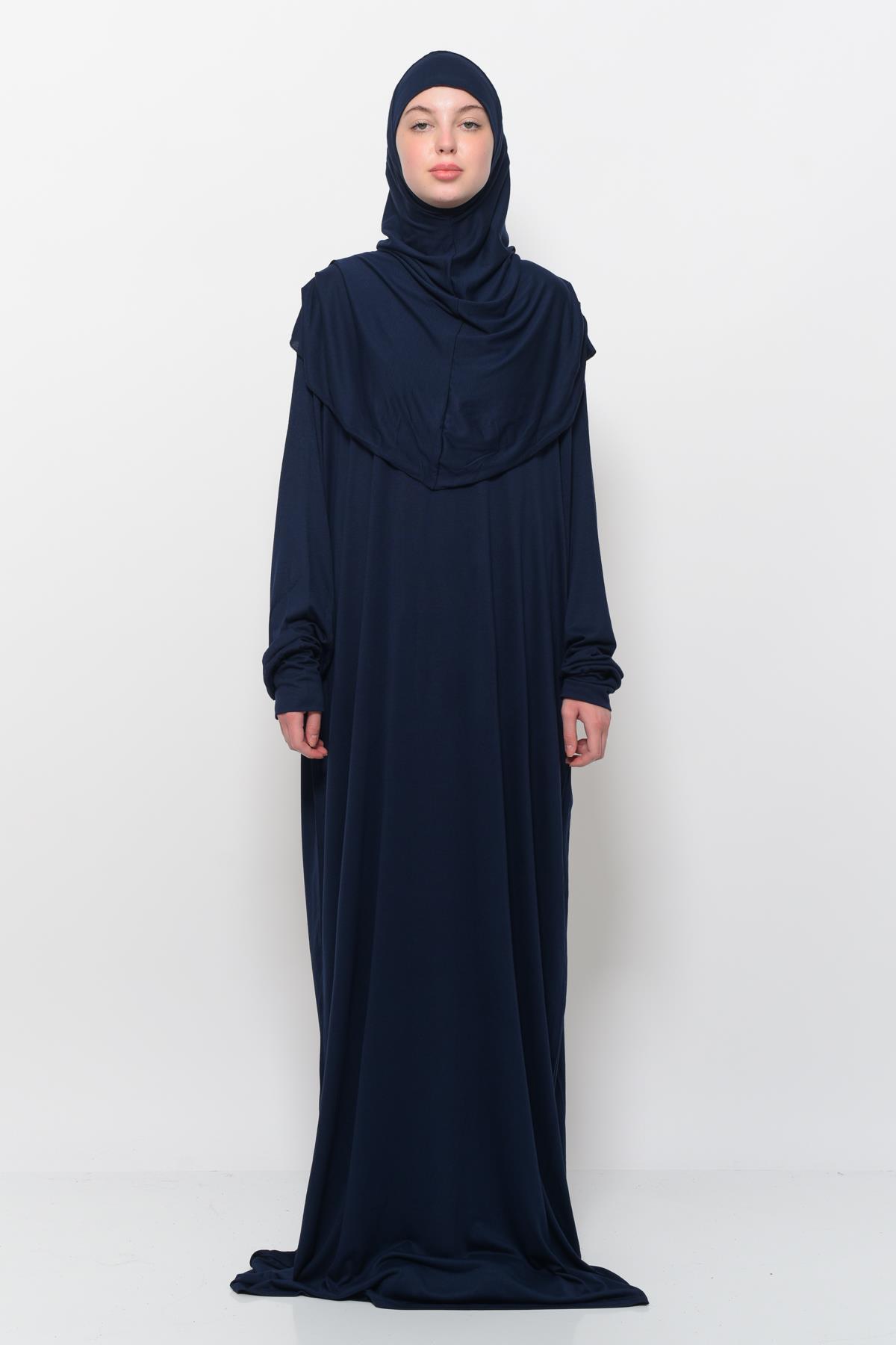 Öncelikle namaz elbisesini başınızı ve kollarınızı geçiçerek giyiniz. Sonrasında dilediğiniz zaman dökümlü yapısıyla boynunuzu kapatan pratik hijabı başınızdan geçirerek boneye ihtiyaç duymadan kullanabilirsiniz.