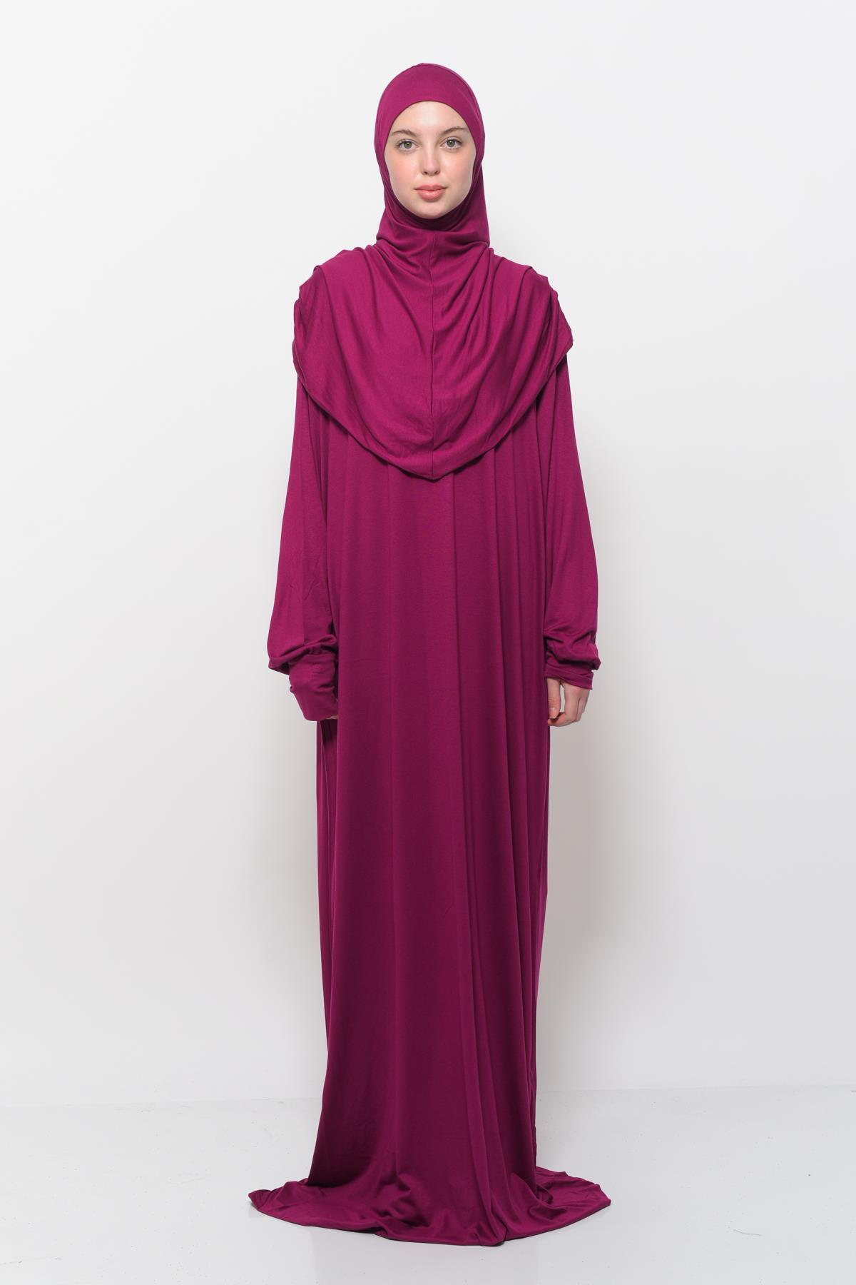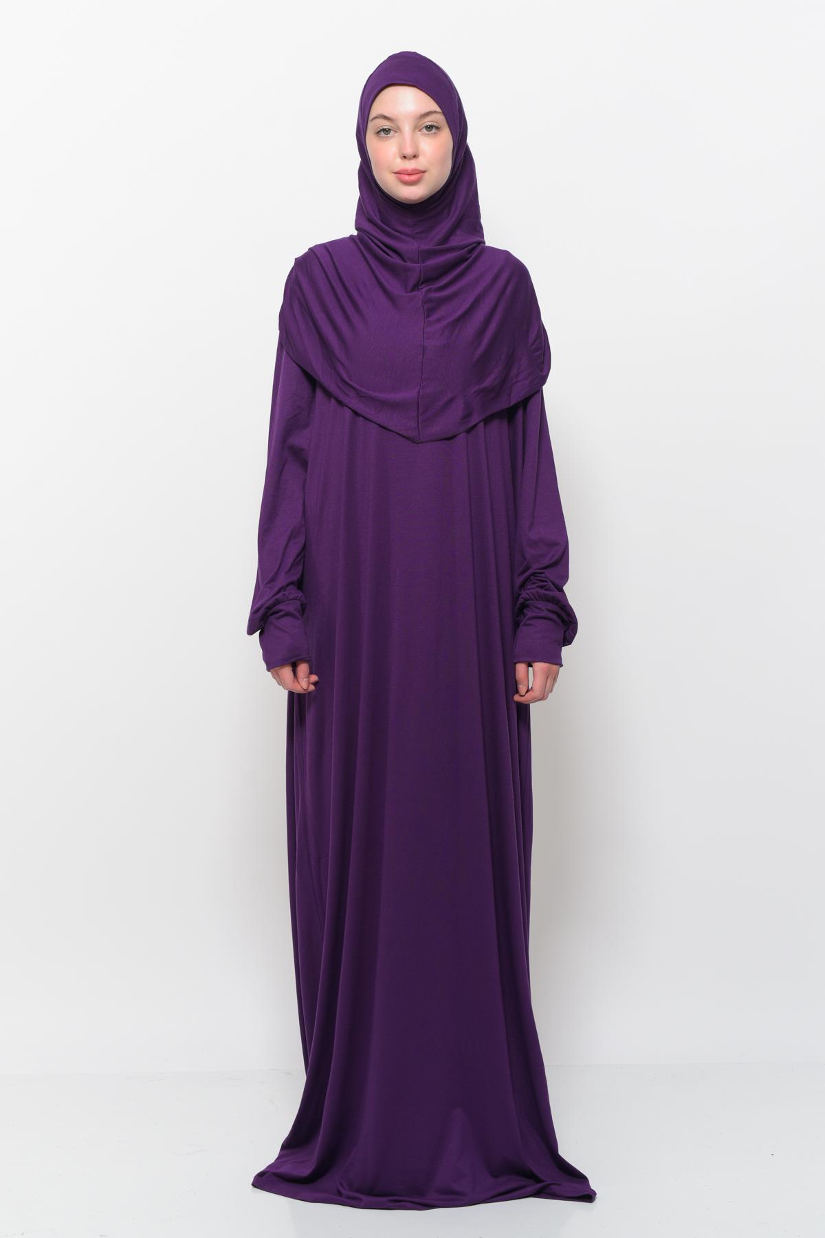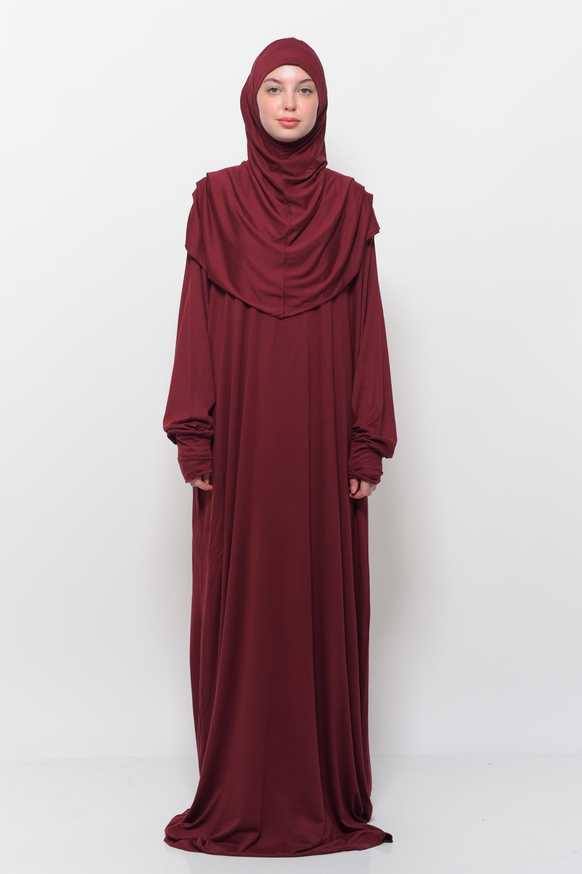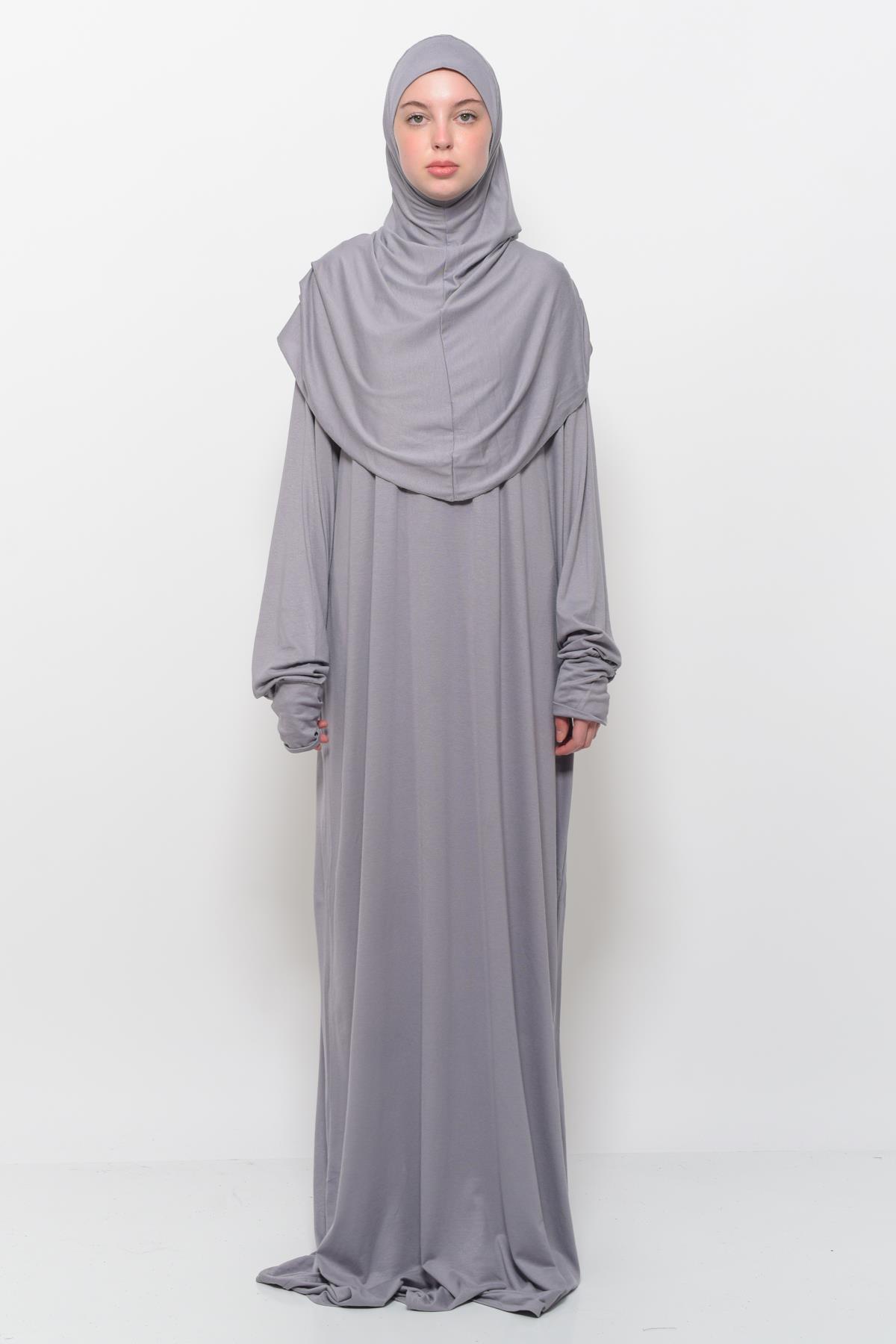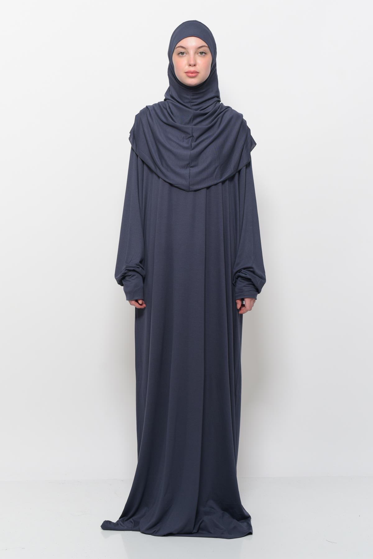Öncelikle namaz elbisesini başınızı ve kollarınızı geçiçerek giyiniz. Sonrasında dilediğiniz zaman dökümlü yapısıyla boynunuzu kapatan pratik hijabı başınızdan geçirerek boneye ihtiyaç duymadan kullanabilirsiniz.