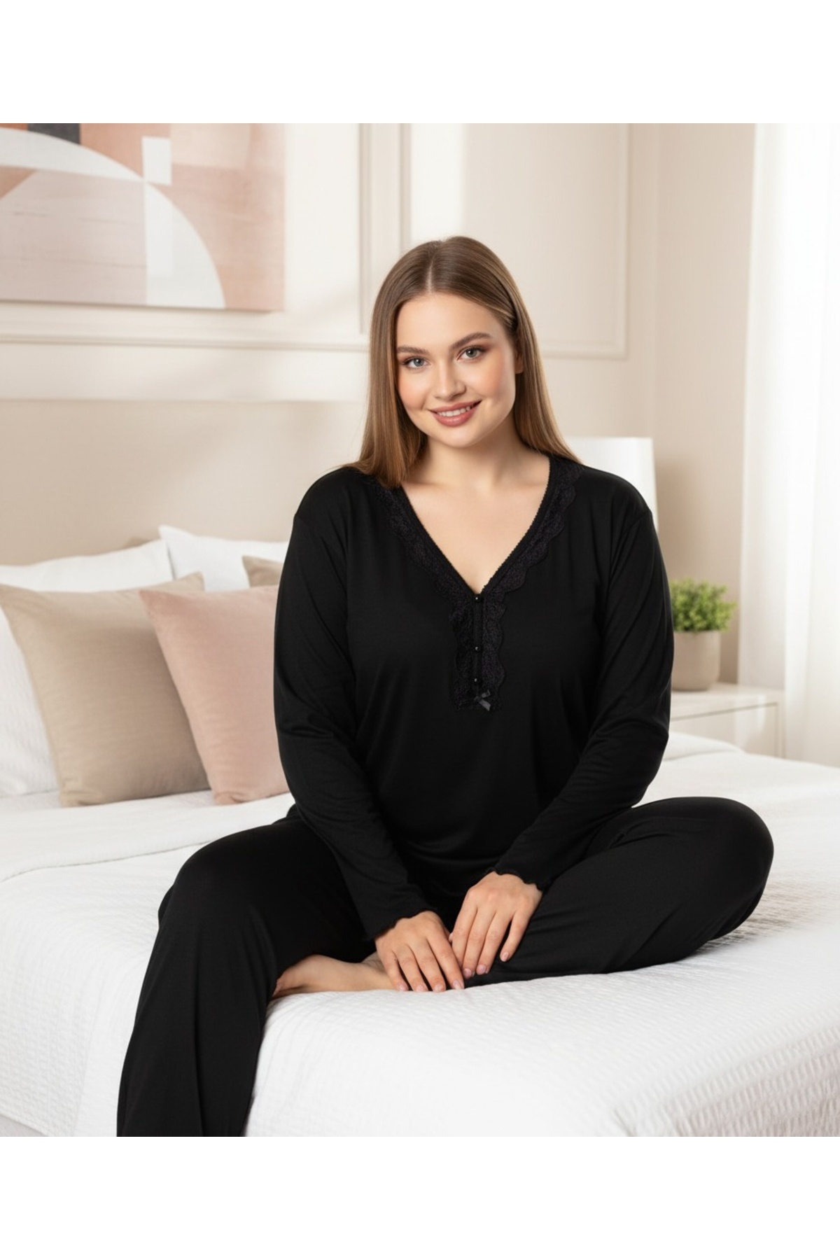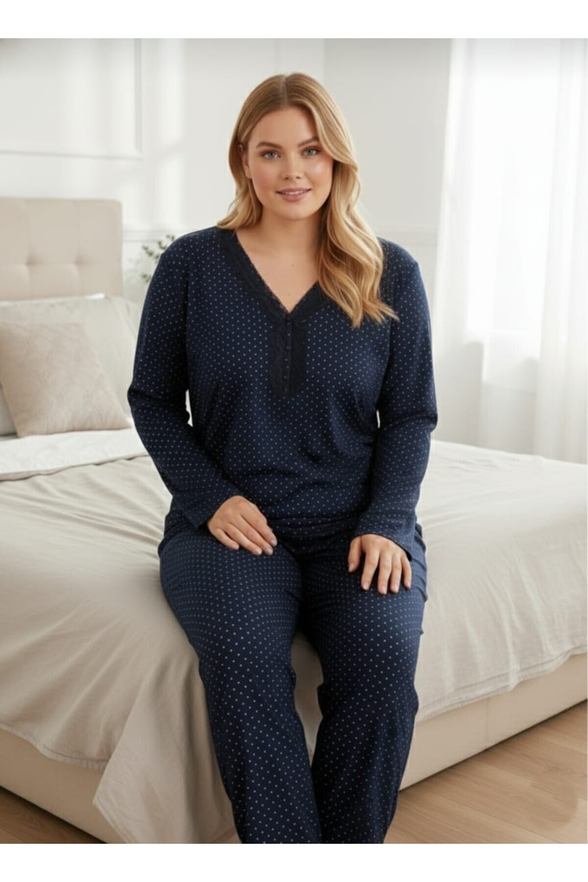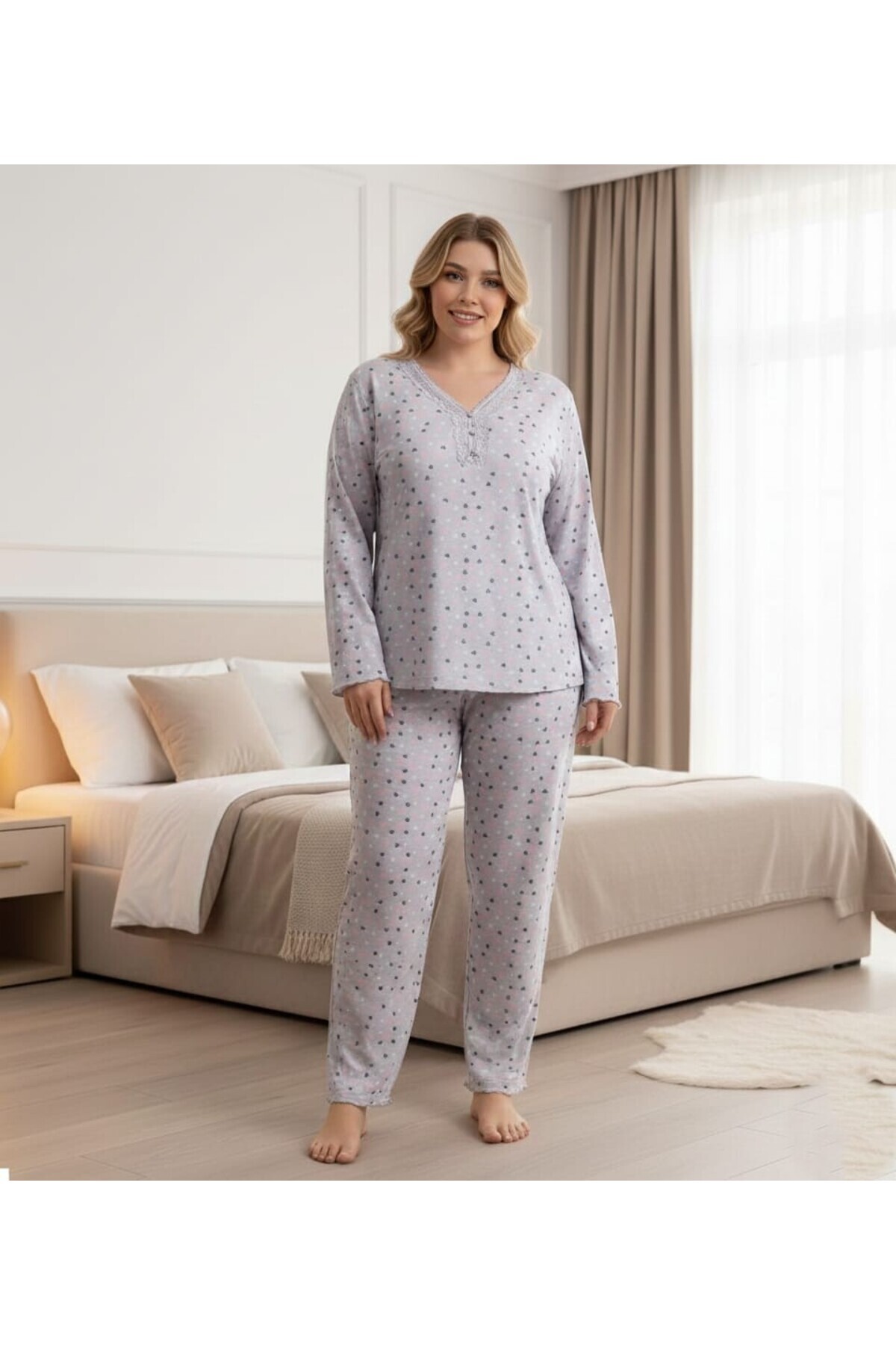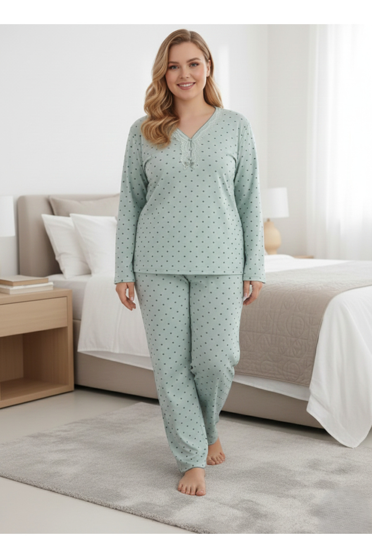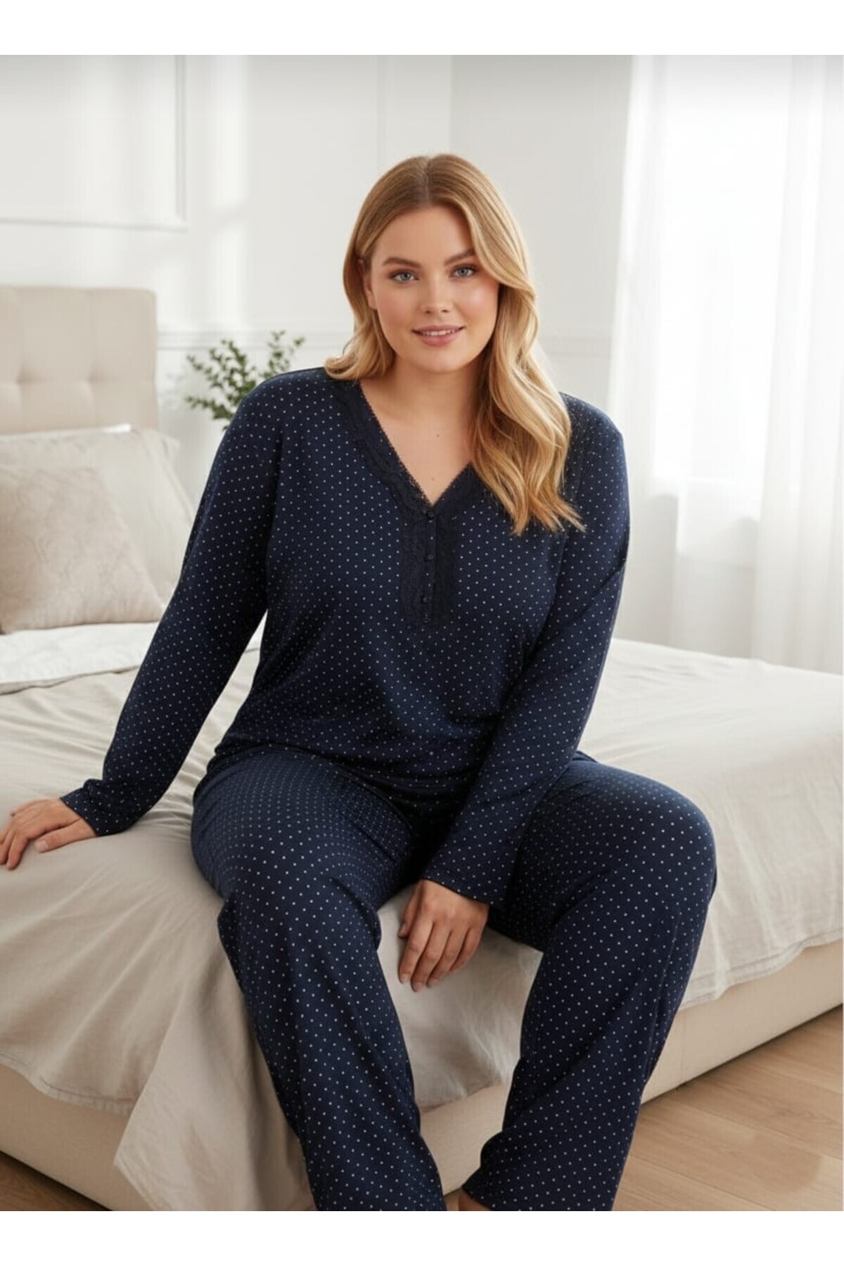 - Rahat ve şık bir uyku deneyimi için tasarlanmış, büyük beden desenli yakası düğmeli uzun kollu bambu pijama takımı