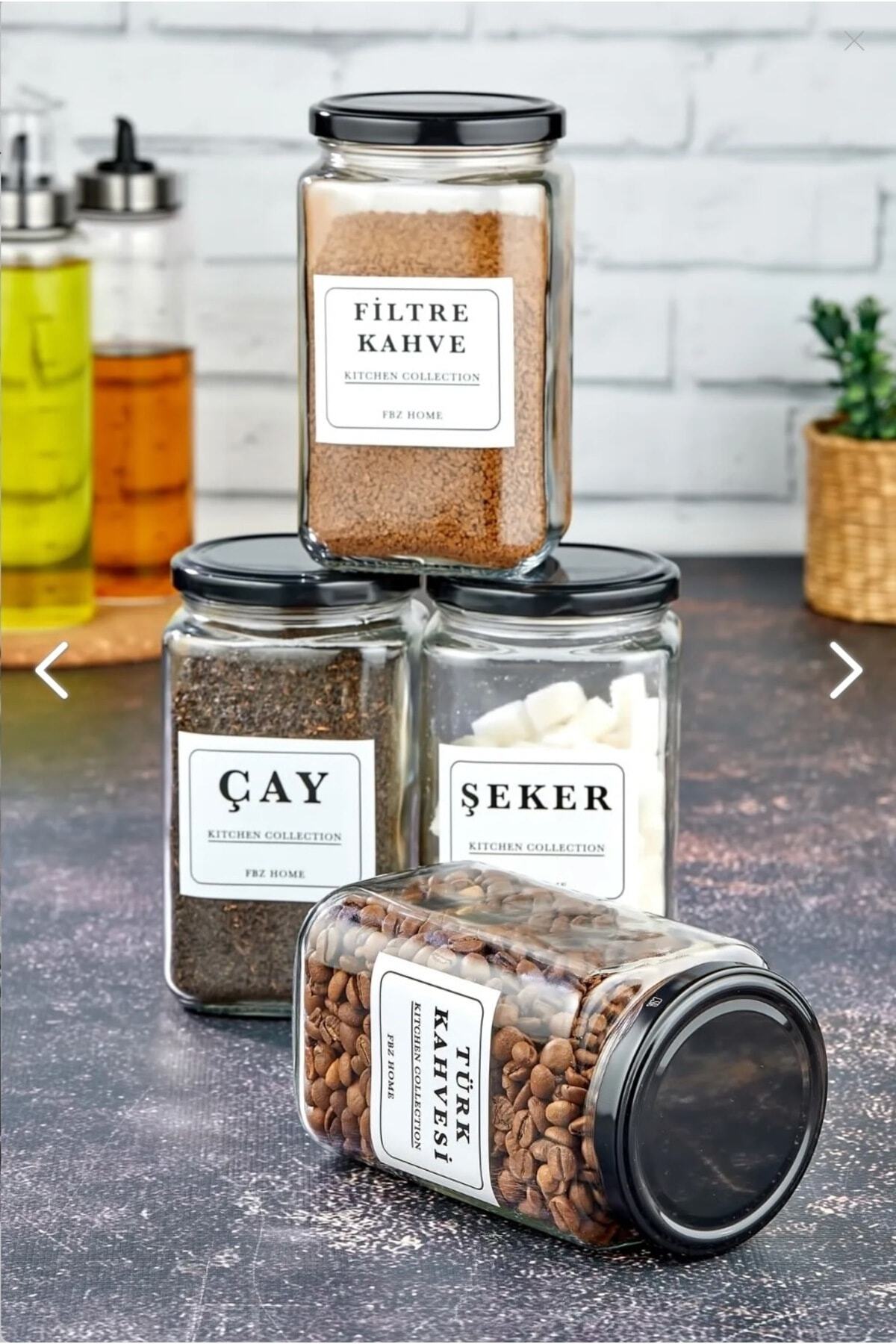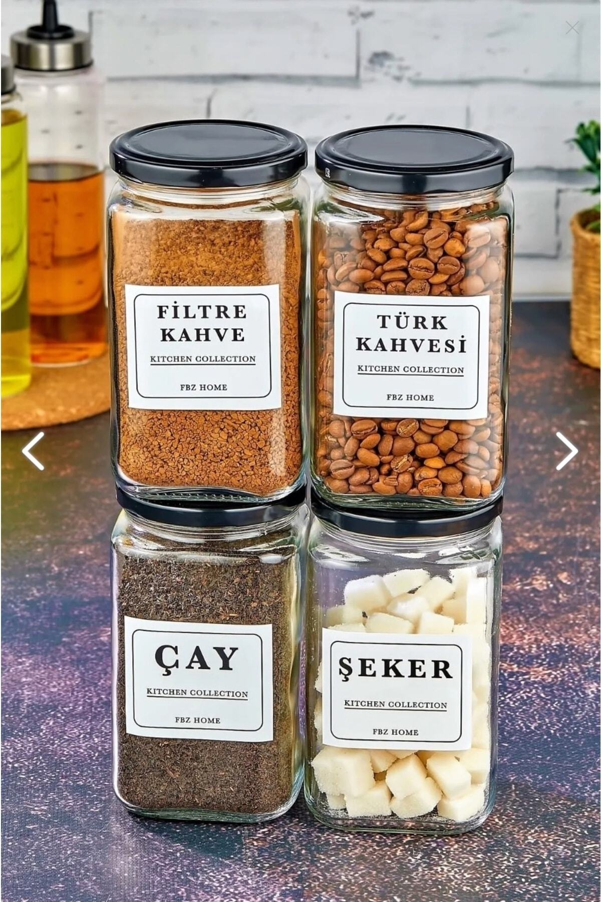 Etiketli 4'lü 850 ml Çay & Şeker & Türk Kahvesi & Filtre Kahve Kavanozu Cam Saklama Kabı