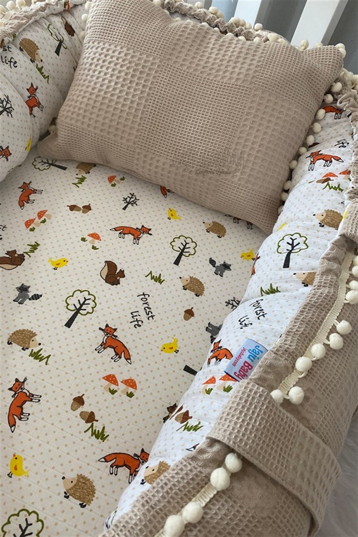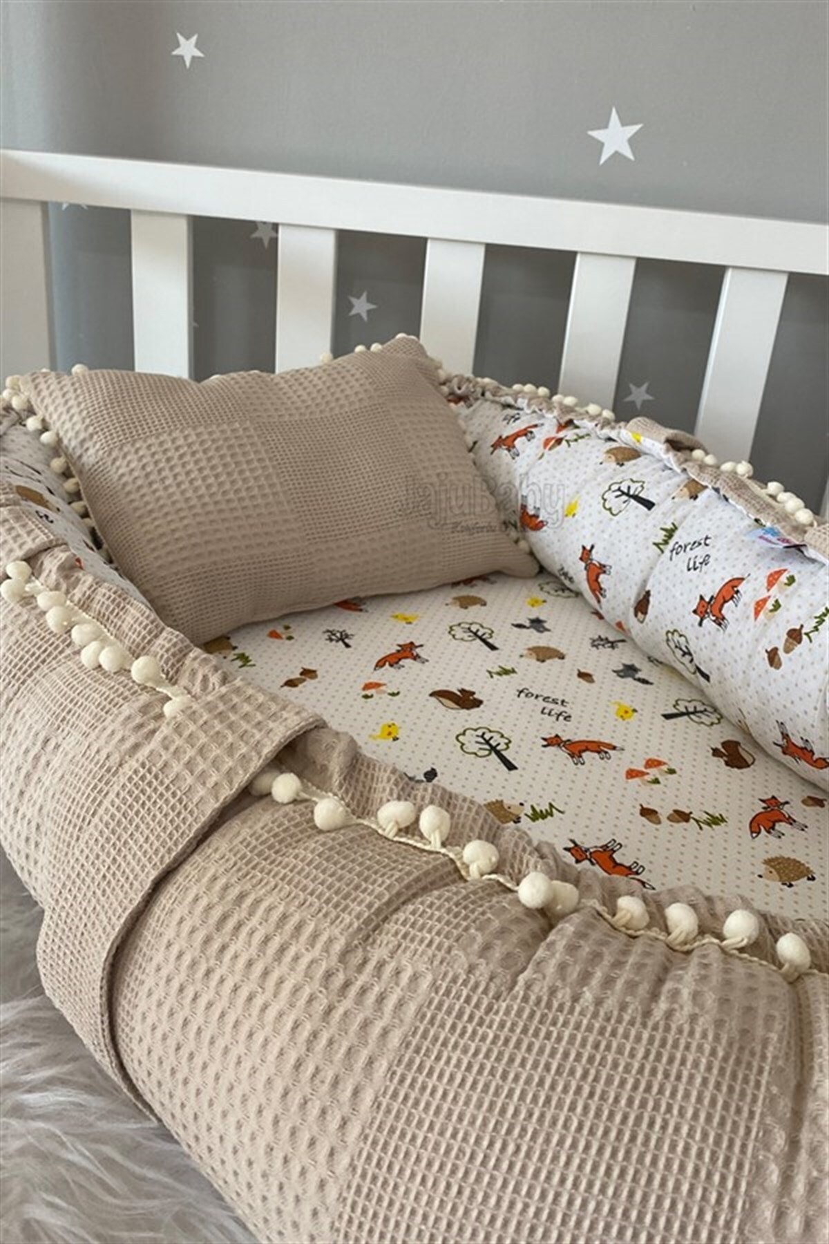 Wafle Pike ve Müslin Kumaştan ürettiğimiz Ponponlu Babynest Fermuarlı iç astara sahip, çamaşır makinesinde yıkanabilir dikim yapılmıştır.