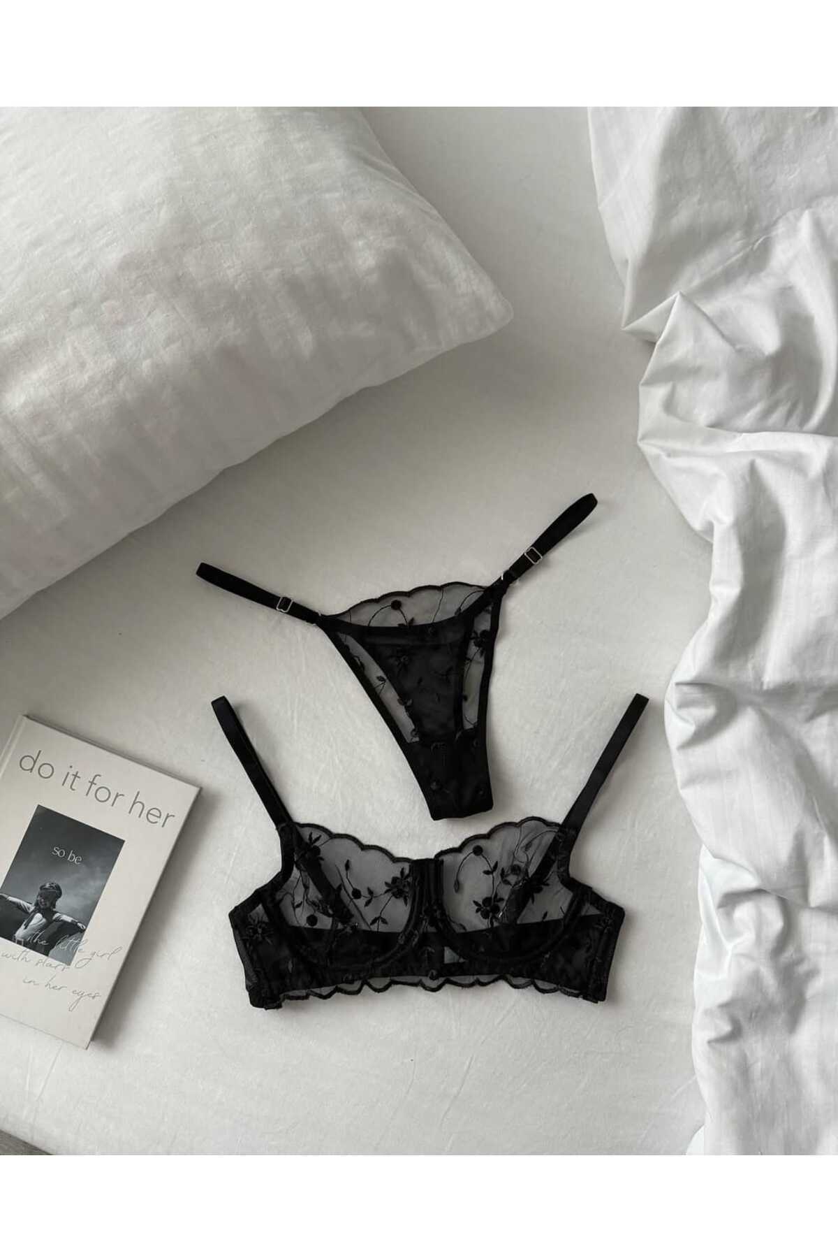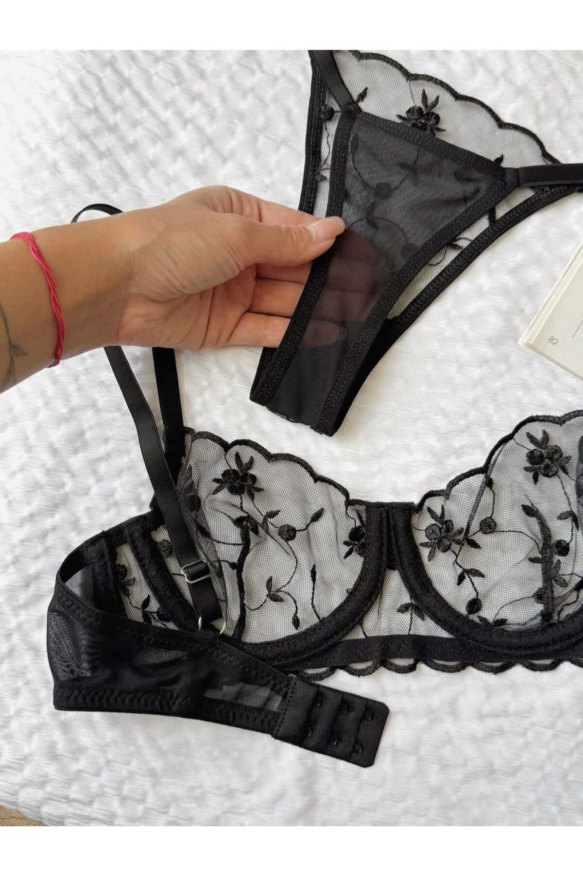 - Zarif çiçek desenleriyle süslenmiş, siyah dantel detaylarına sahip tanga külotlu sütyen takımı, şıklığınızı geceye taşır.