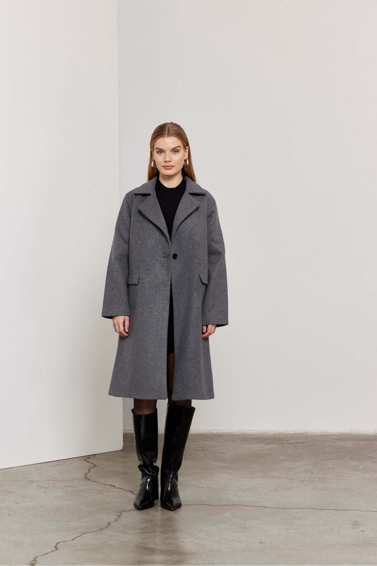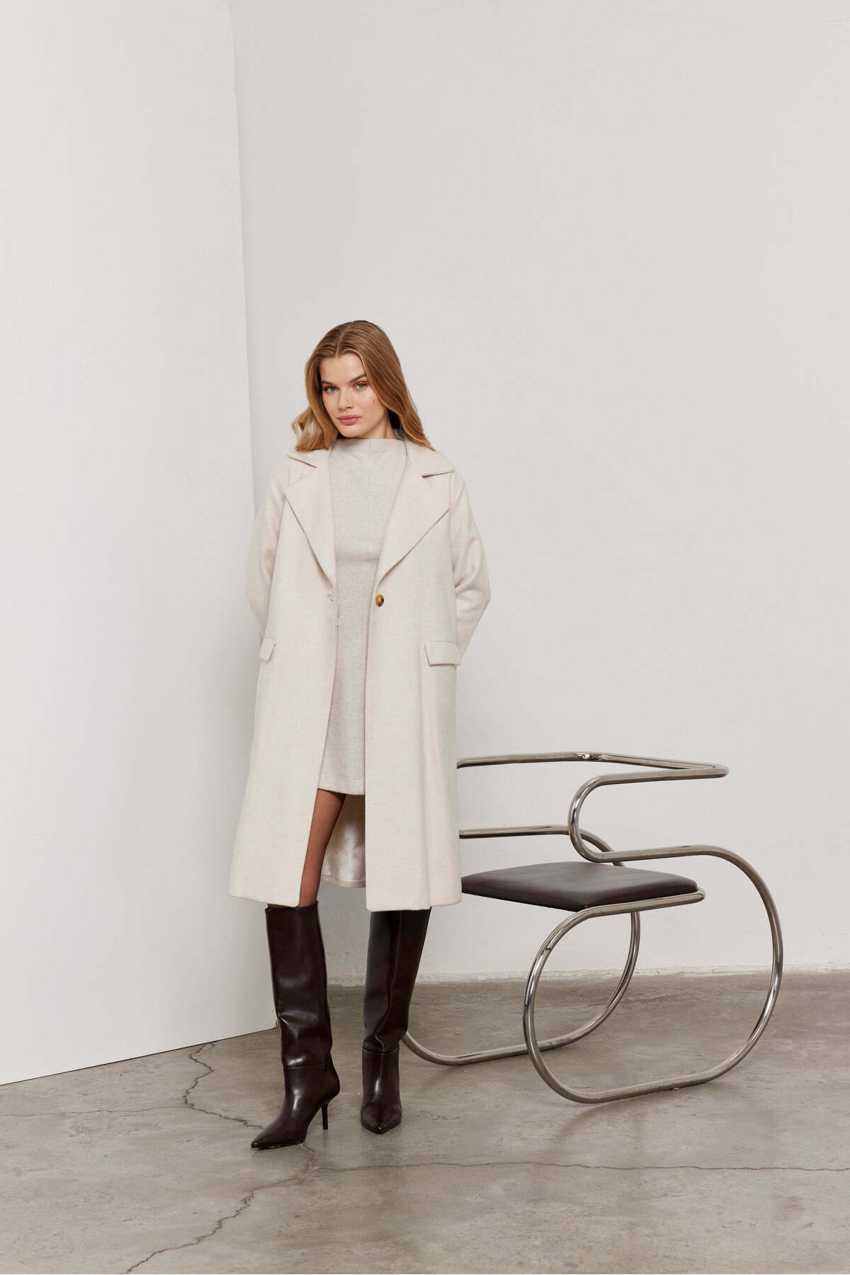 Ceket yaka tasarımı ile şıklığı ve rahatlığı bir arada sunan kadın kaşe kaban, günlük kullanıma uygun bir seçenektir