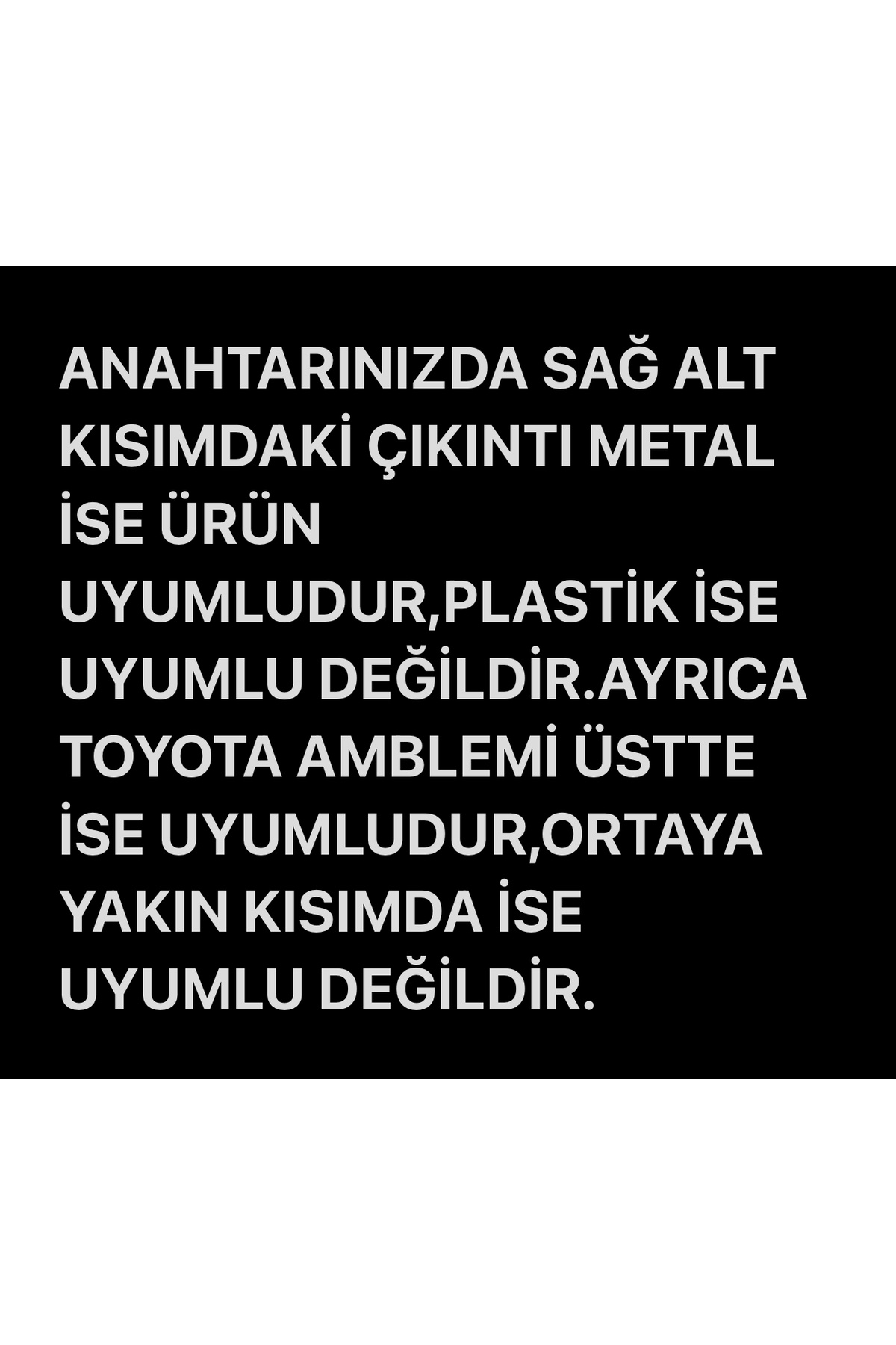 ANAHTARINIZDA SAĞ ALTTAKİ ÇIKINTI METAL İSE VE TOYOTA AMBLEMİ ÜSTTE İSE ÜRÜN UYUMLUDUR SAĞ ALT KISIMDAKİ ÇIKINTI PLASTİK İSE VE TOYOTA AMBLEMİ ORTA KISMA YAKIN YERDE İSE ÜRÜN UYUMLU DEĞİLDİR YARİS İÇİN UYUMLU DEĞİLDİR LÜTFEN ANAHTARINIZI KONTROL EDİP KARŞILAŞTIRINIZ