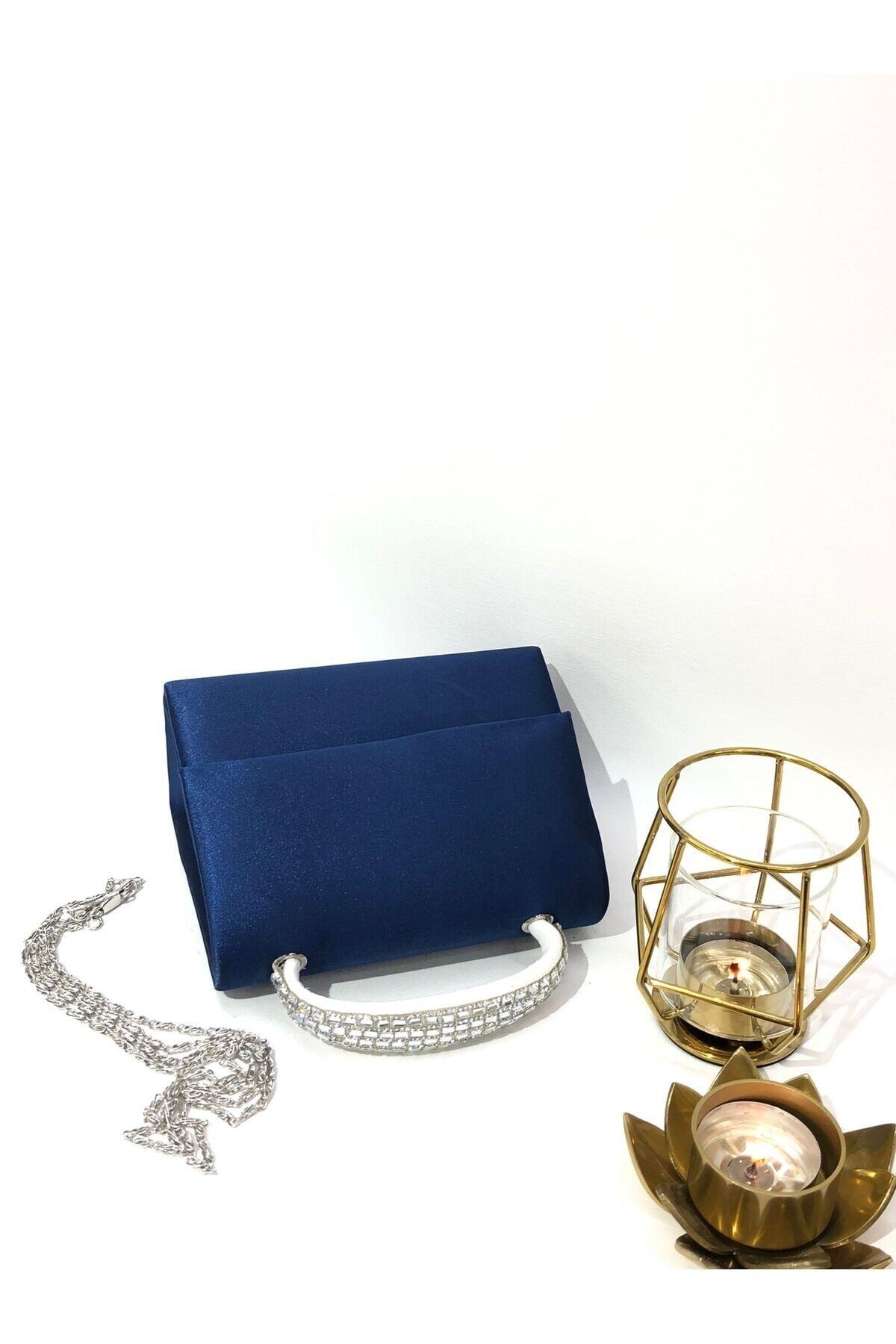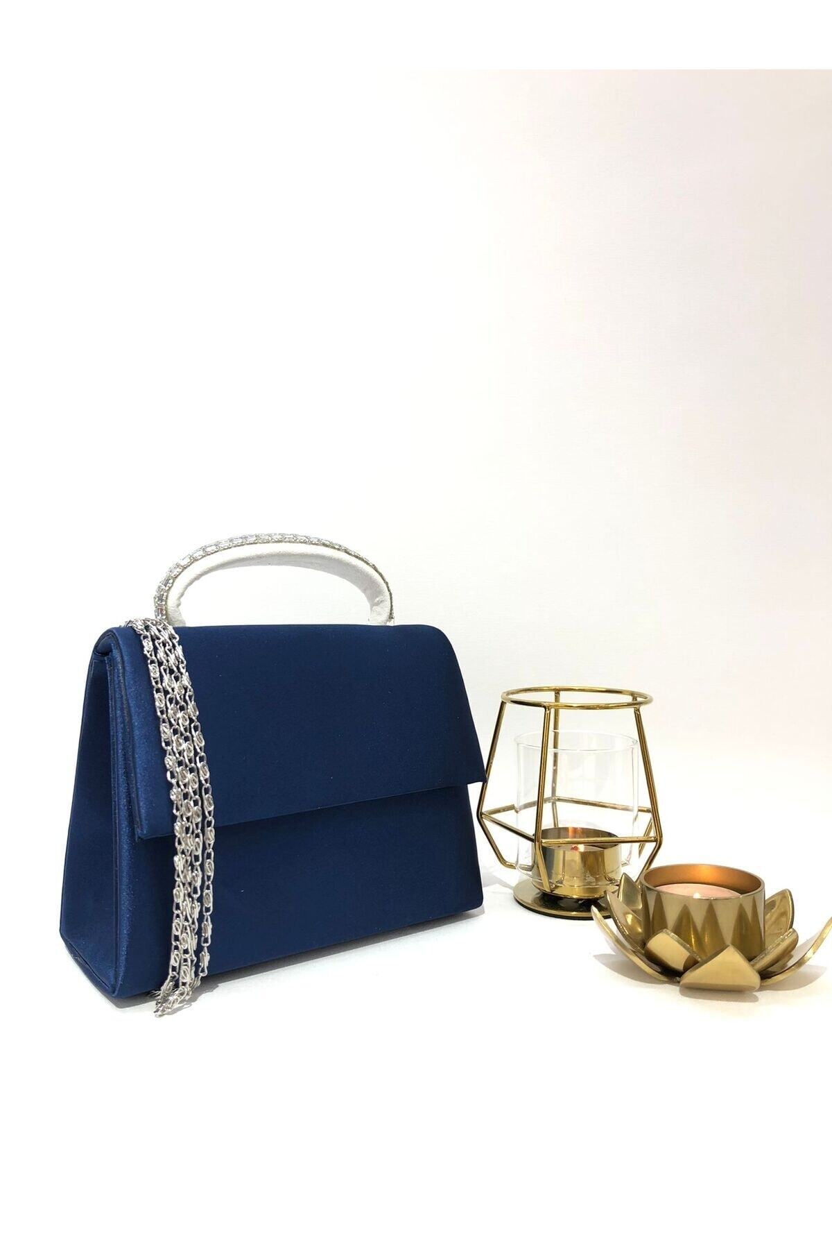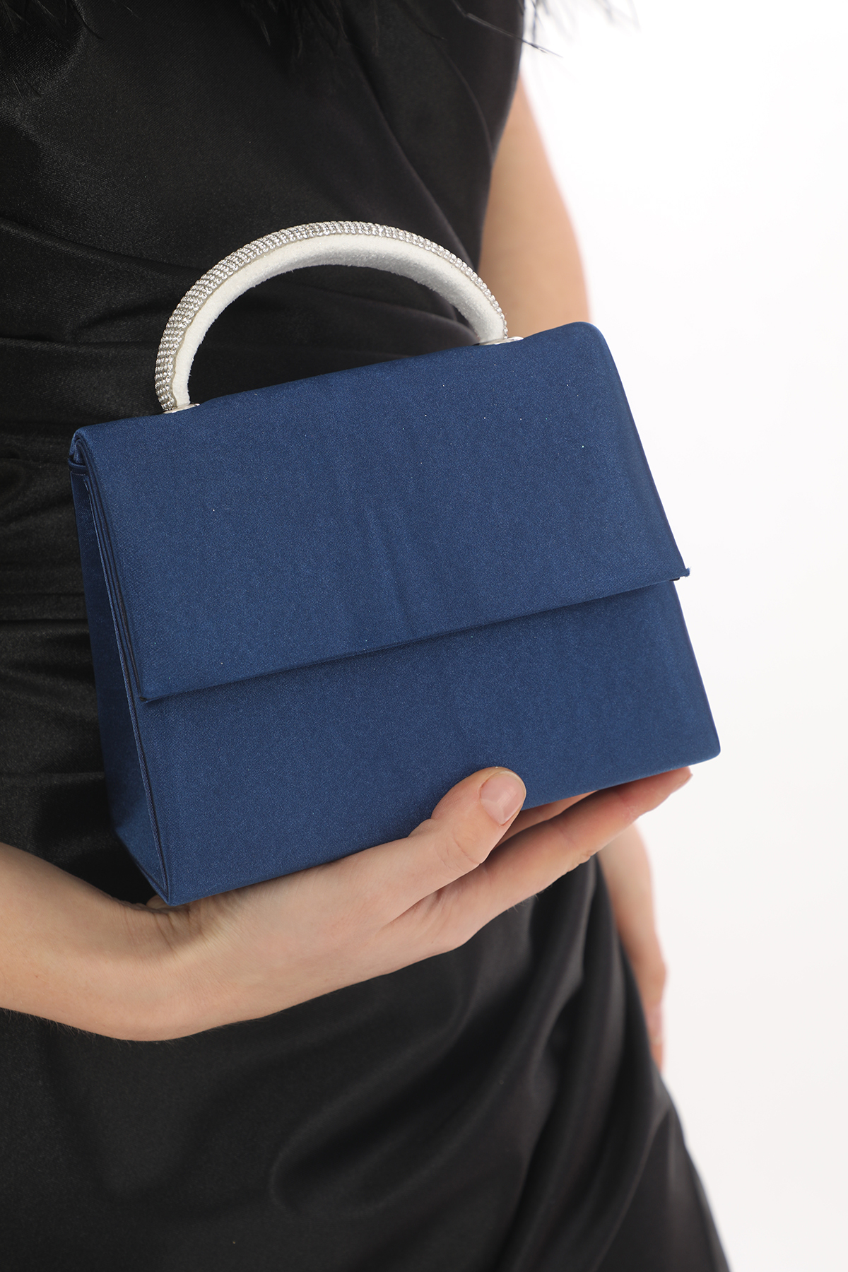 Zarif ve sade tasarımıyla her türlü özel gününüzde şıklığınızı tamamlayacak düz desenli lacivert renk suni deri çanta