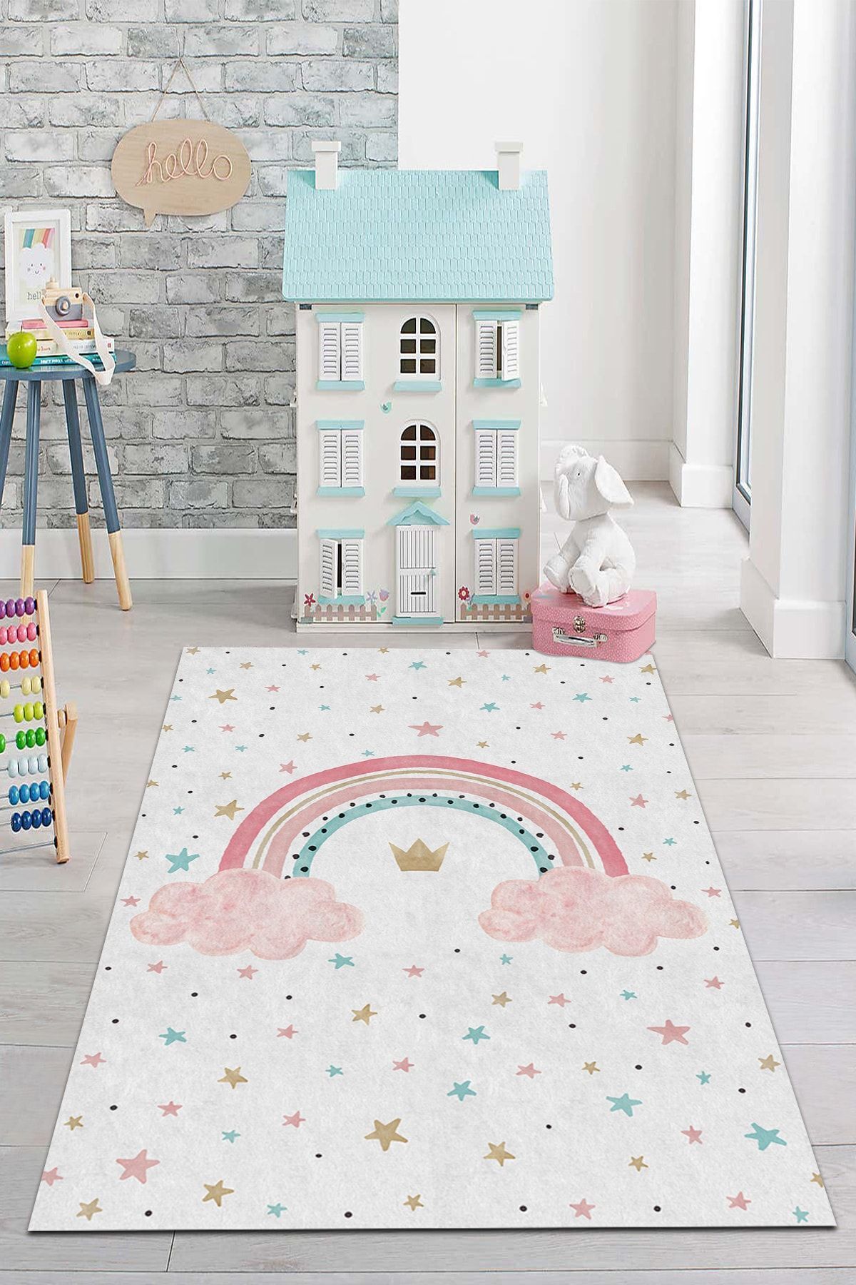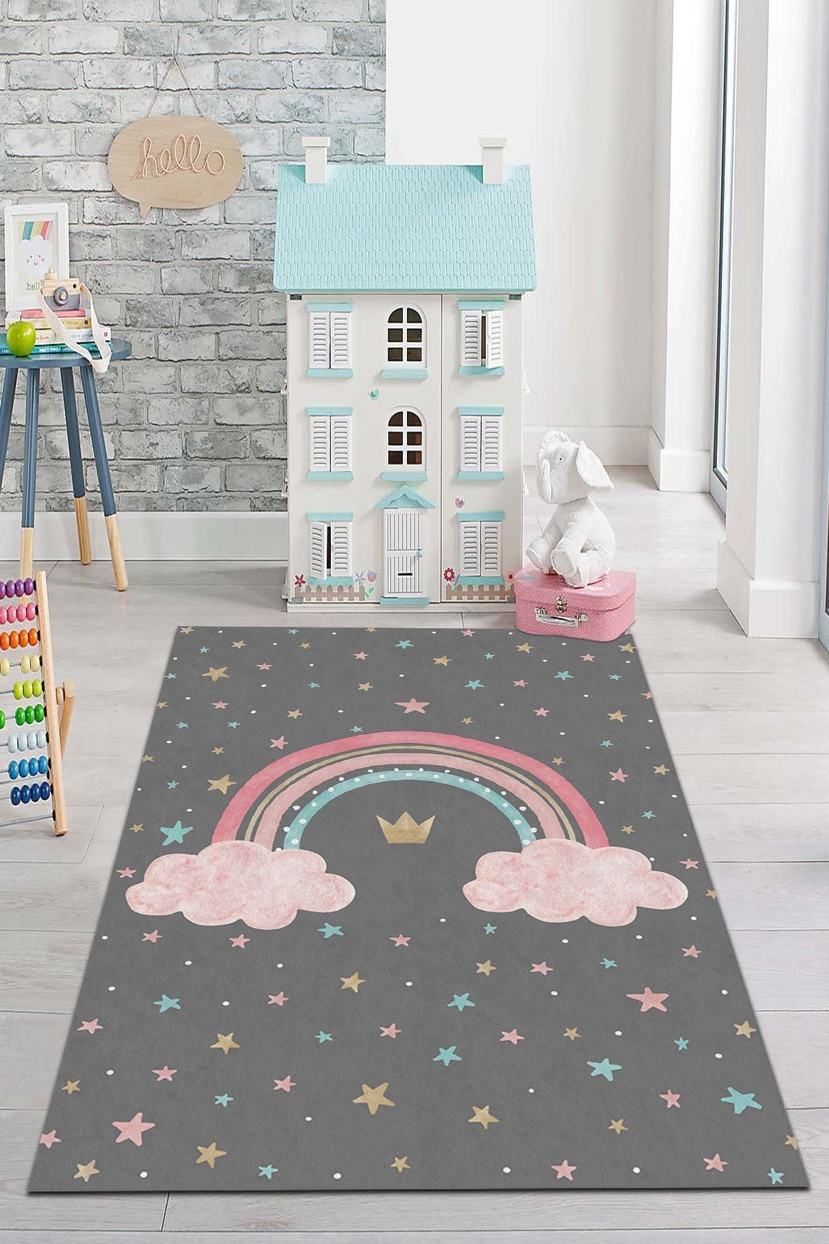 - Canlı ve renkli desenleriyle çocukların odasına neşe katan dijital baskı kaymaz çocuk odası halısı.