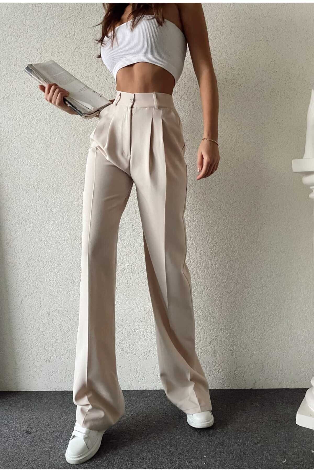 Yüksek bel, bol paça ve pile detaylı beyaz kumaş pantolon.