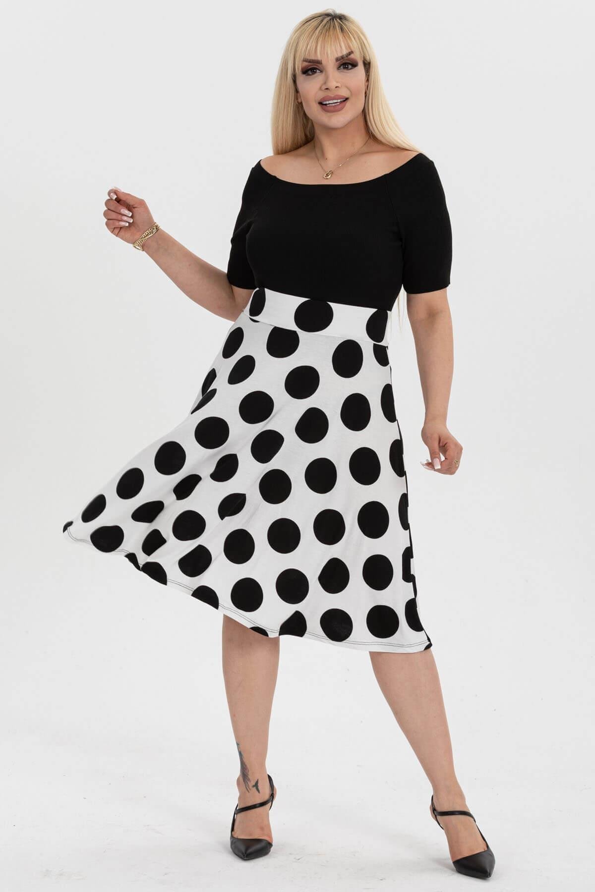- Geometrik puantiye deseniyle modern ve dinamik bir görünüm kazandırırken, kloş silueti hareket özgürlüğü sunar