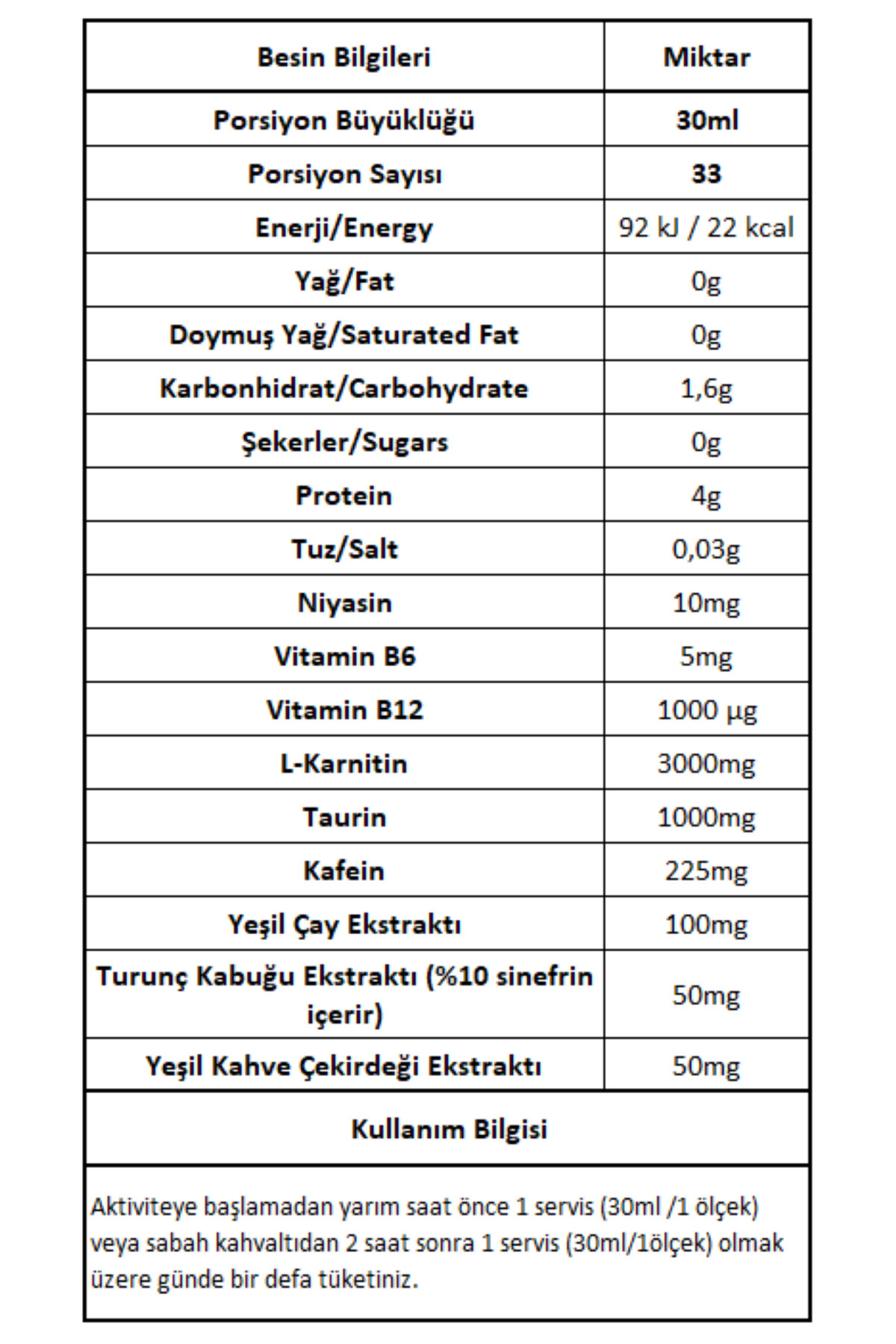 Her bir servisi, etkili ve doğal bileşenlerle formüle edilmiştir: •3000 mg L-Karnitin: Yağ asitlerini enerjiye dönüştürmede kritik bir rol oynayan L-Karnitin, yağ yakımını destekleyerek sürecine yardımcı olur.