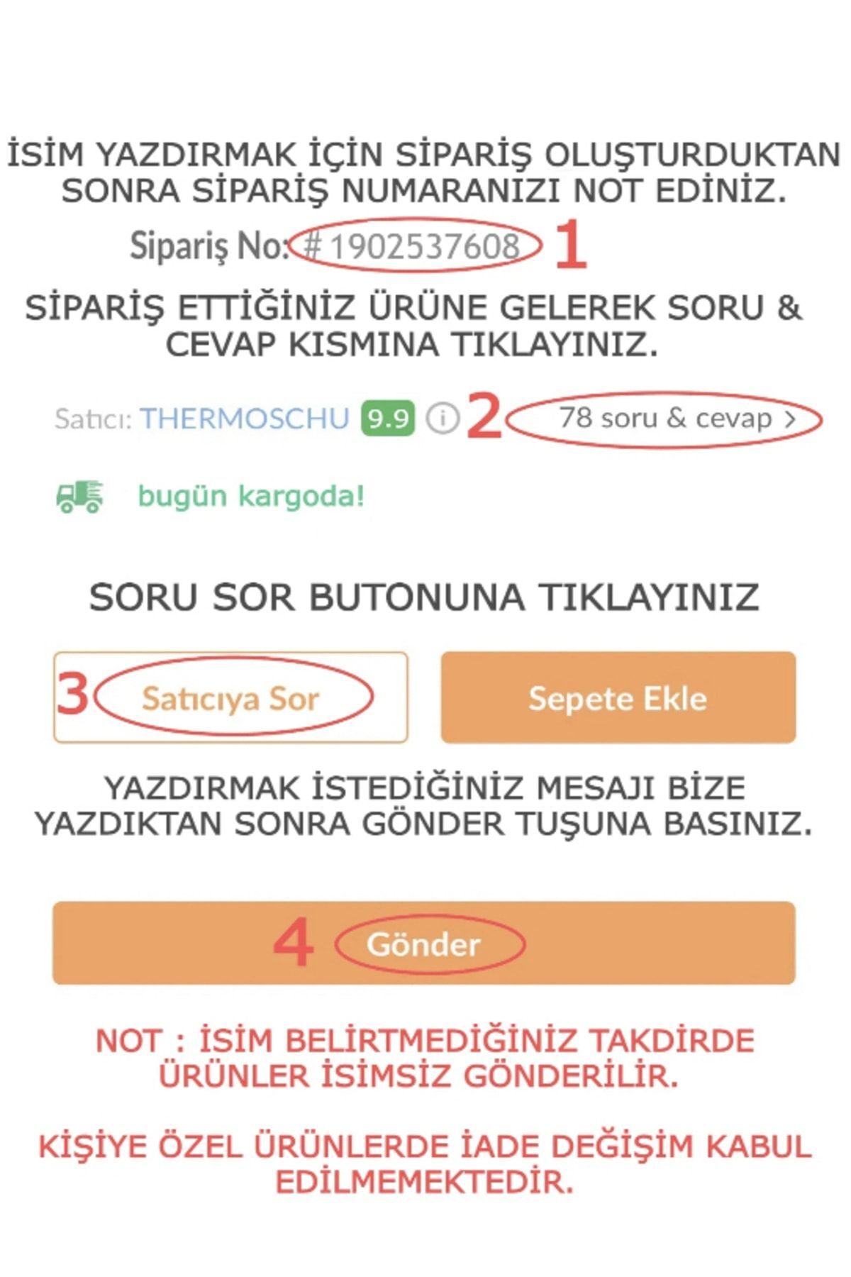 KISIYE ÖZEL YAZI YAZDIRMA IÇIN • Siparis verdikten sonra siparisler sayfasinda ürüne tiklayin ve en üstte yer alan #20 ile baslayan siparis numaranizi kopyalayin daha sonra soru sor kismindan örnek: #215486587 numarali siparisim icin Ön yüze: ......