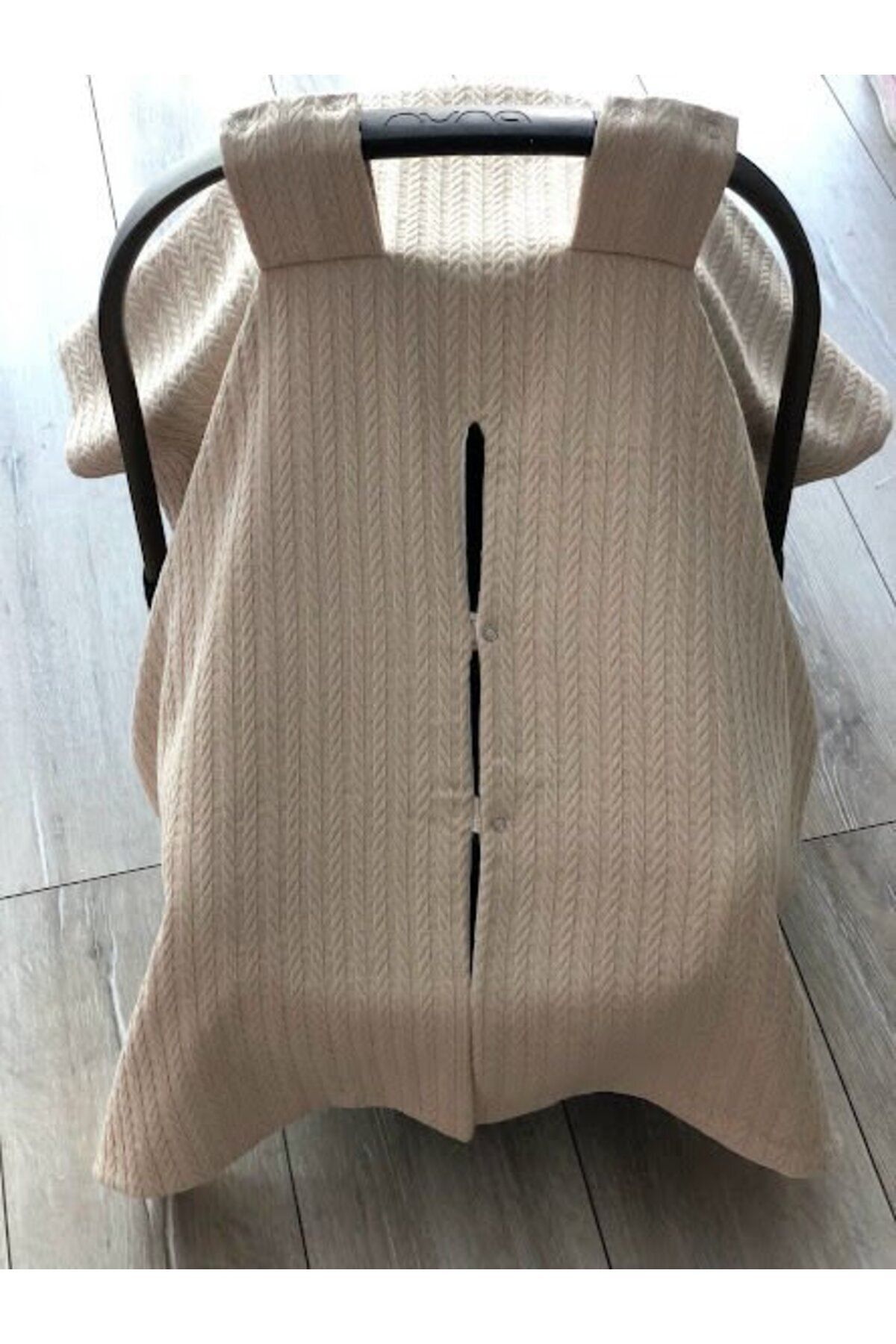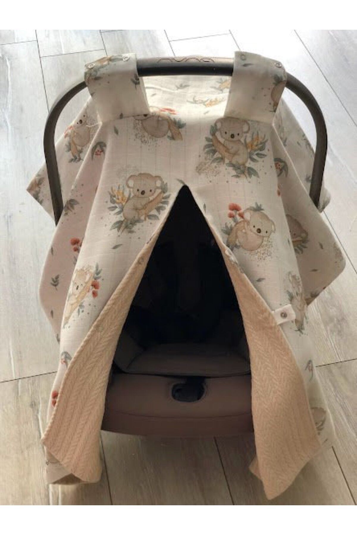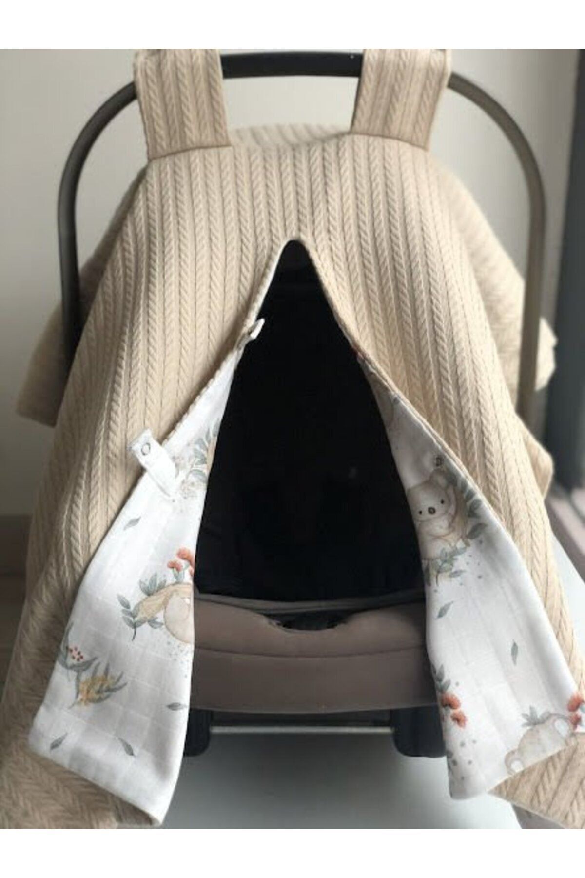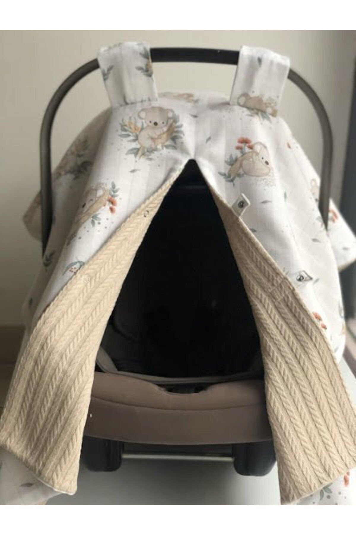 Bebeklerin konforu düşünülerek tasarlanmış, bej örgü koala müslin çift yönlü puset örtüsü, bebeğinizin rahatlığı için ideal bir seçimdir