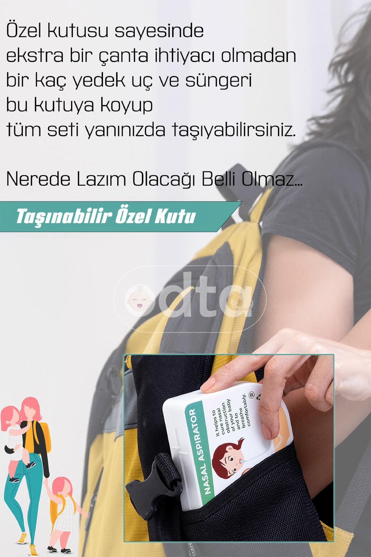 TAŞIMASI VE SAKLAMASI KOLAY:ODTA burun aspiratörü ve yedek başlıklar ayrı kutularda gelir. Bu sayede tüm ürünleri yanınızda taşımanıza gerek kalmıyor. Burun aspiratörü torbasına 2 adet yedek başlık ve filtre ekleyebilirsiniz. Böylece tek bir çanta ile rahatlıkla seyahat edebilirsiniz.