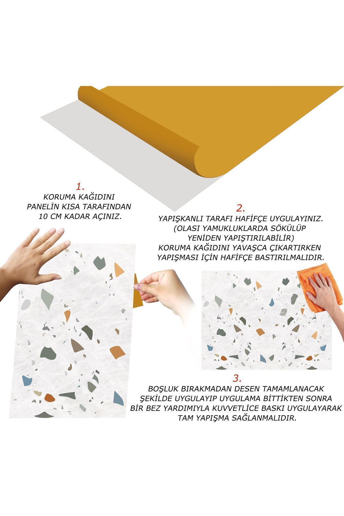 Pvc panelin arka yüzündeki koruyucu bandı çıkardıktan sonra sıkıca bastırarak uygulayacağınız zemin üzerine yapıştırın.