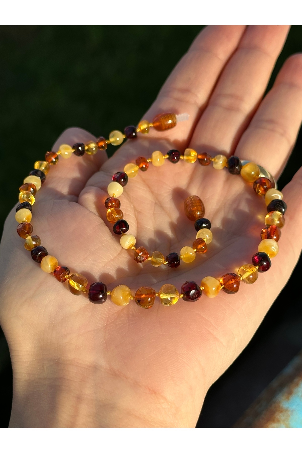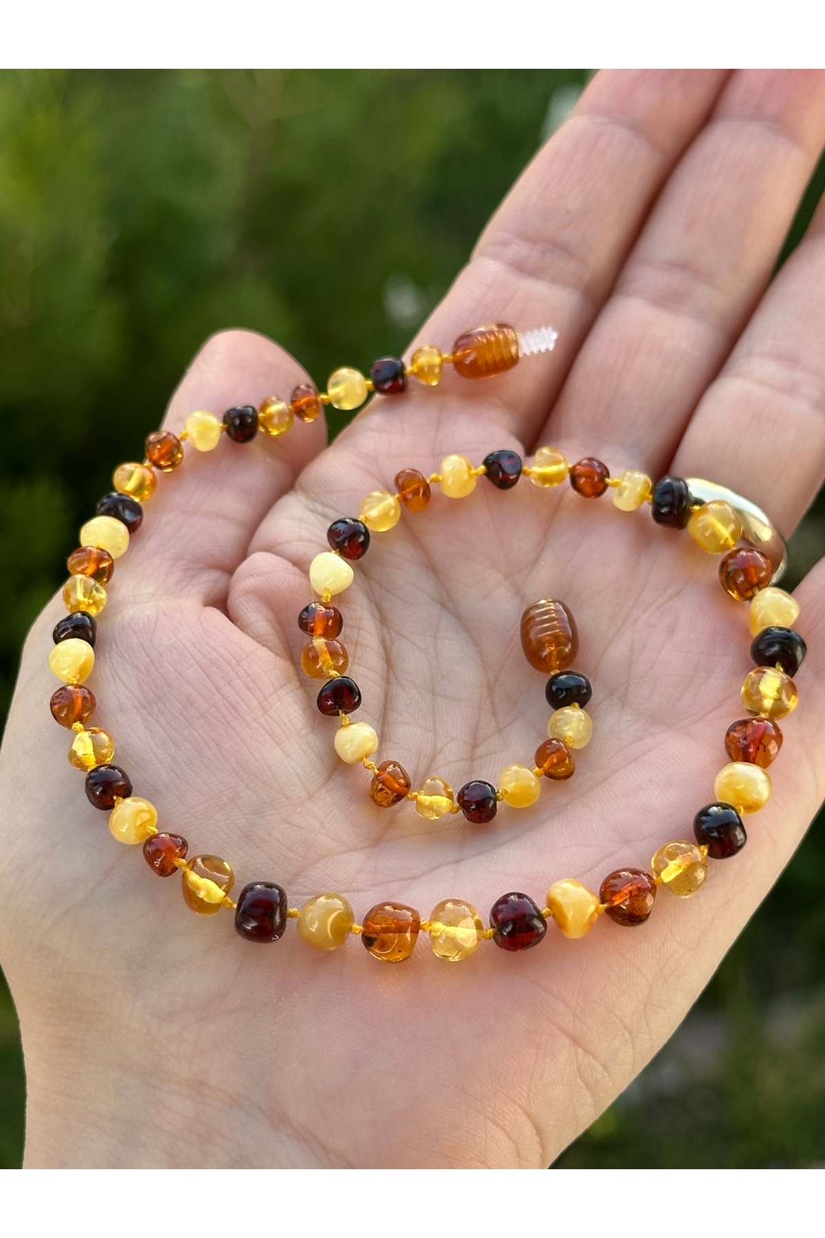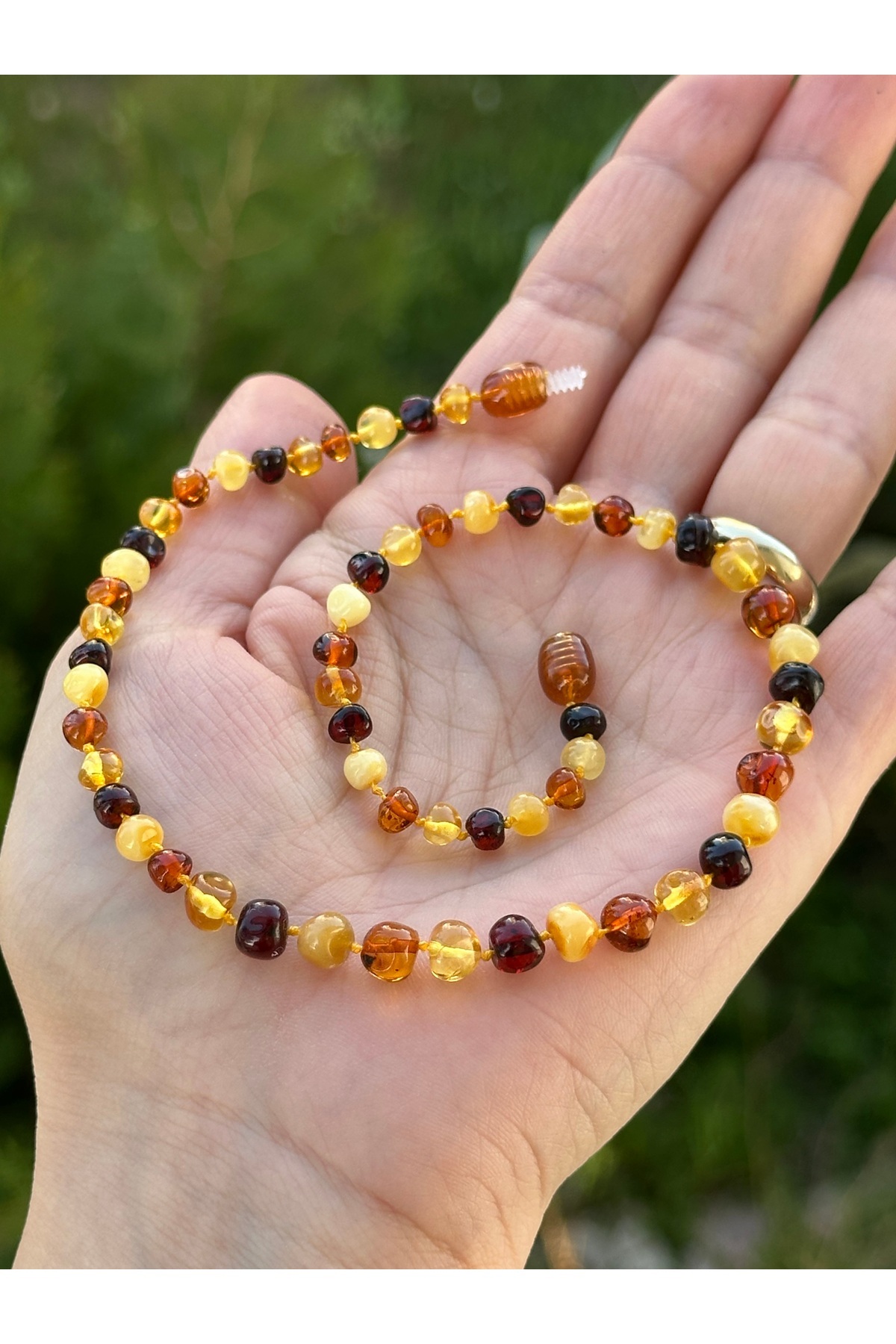 Baltık damla kehribarın doğal parlaklığı ve benzersiz desenleri, bu kolyeyi hem şık hem de zarif bir aksesuar haline getirir