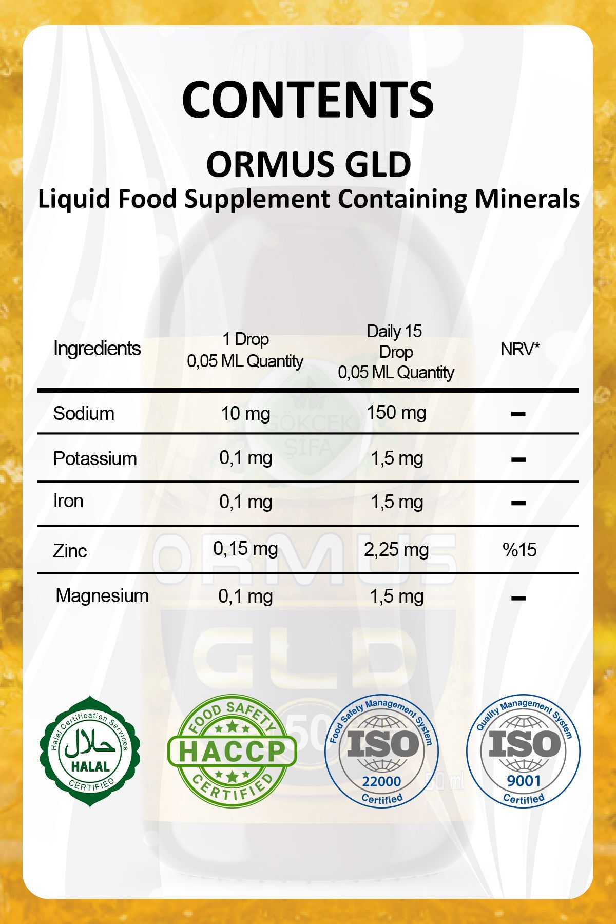 Ormus gld Içindekileri: Su, sodyum klorür (sodyum), potasyum klorür (potasyum), ferroz sulfat (demir), çinko oksit ( çinko), magnezyum oksit (magnezyum), borik asit( bor) Ingredients: Water,sodium chloride (sodium), potassium chloride (potassium), ferrous sulfate (ıron), zinc oxide (zinc) magnesium oxide (magnesium) boric acid (boron) Ilgili yasa ve reklam yönetmelik kurallarına uyularak endikasyon ve hastalık adı belirterek bitkisel destek ürünleriyle ilgili tanıtım yapılmamaktadır