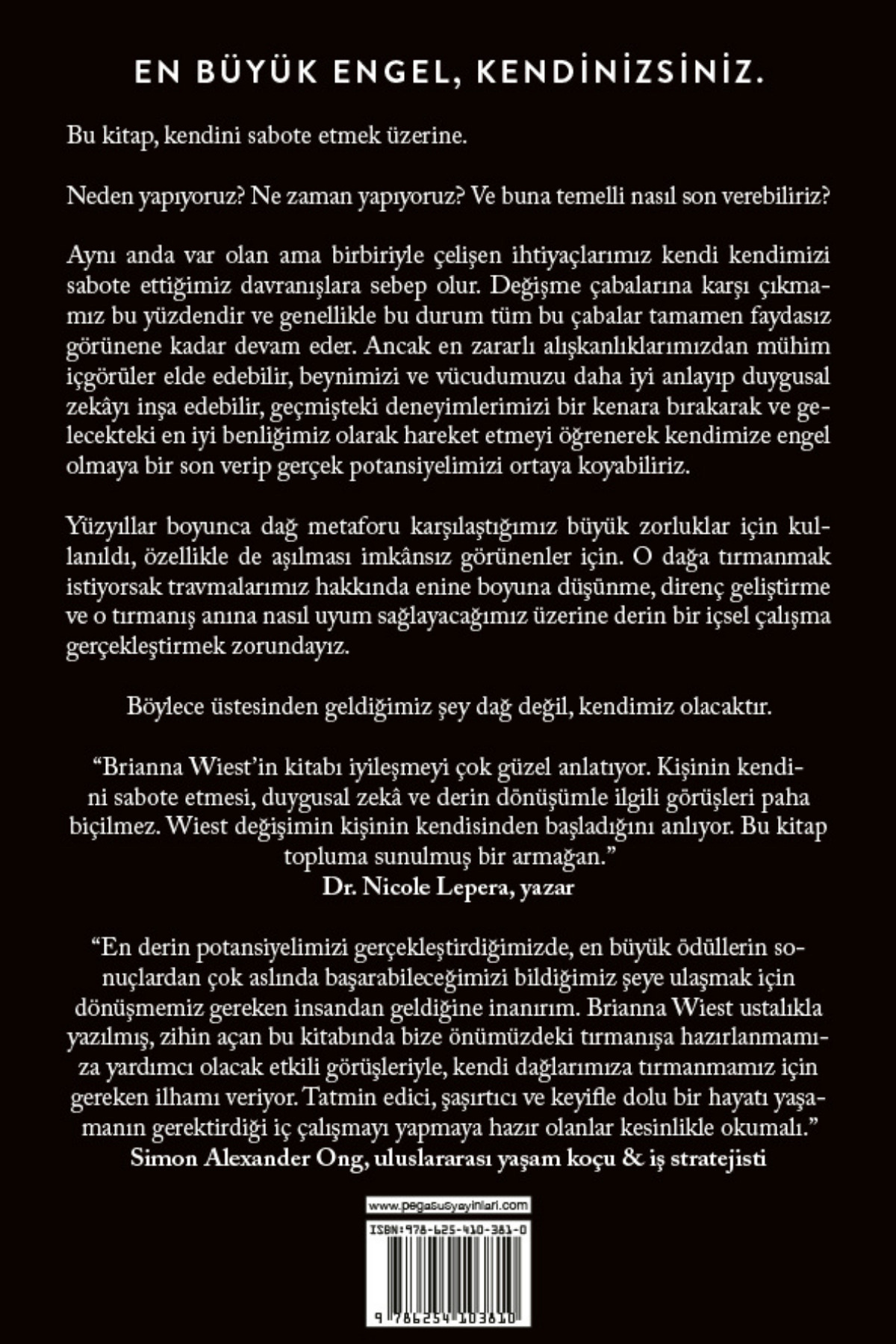 Brianna Wiest ustalıkla yazılmış, zihin açan bu kitabında bize önümüzdeki tırmanışa hazırlanmamıza yardımcı olacak etkili görüşleriyle, kendi dağlarımıza tırmanmamız için gereken ilhamı veriyor.