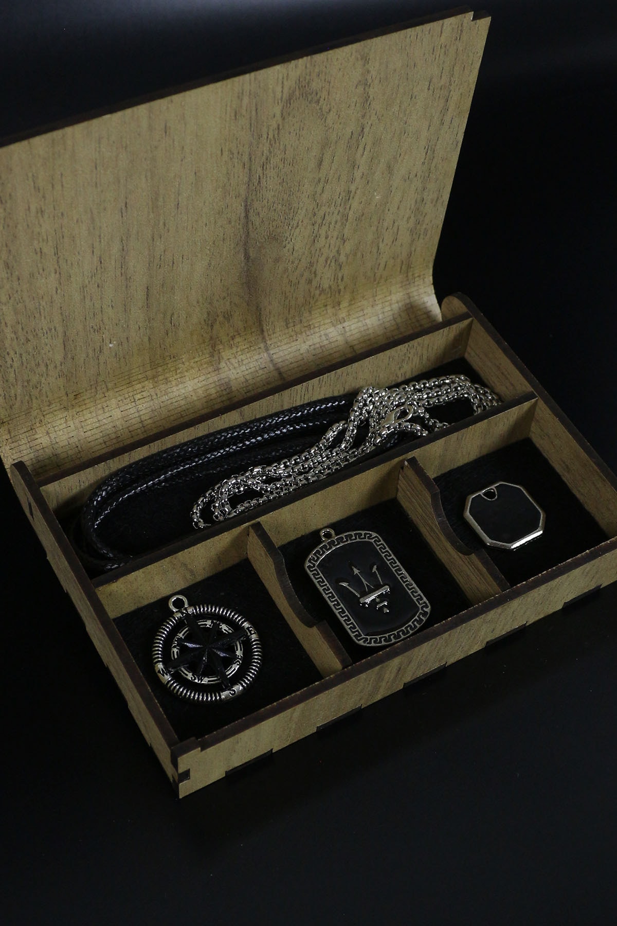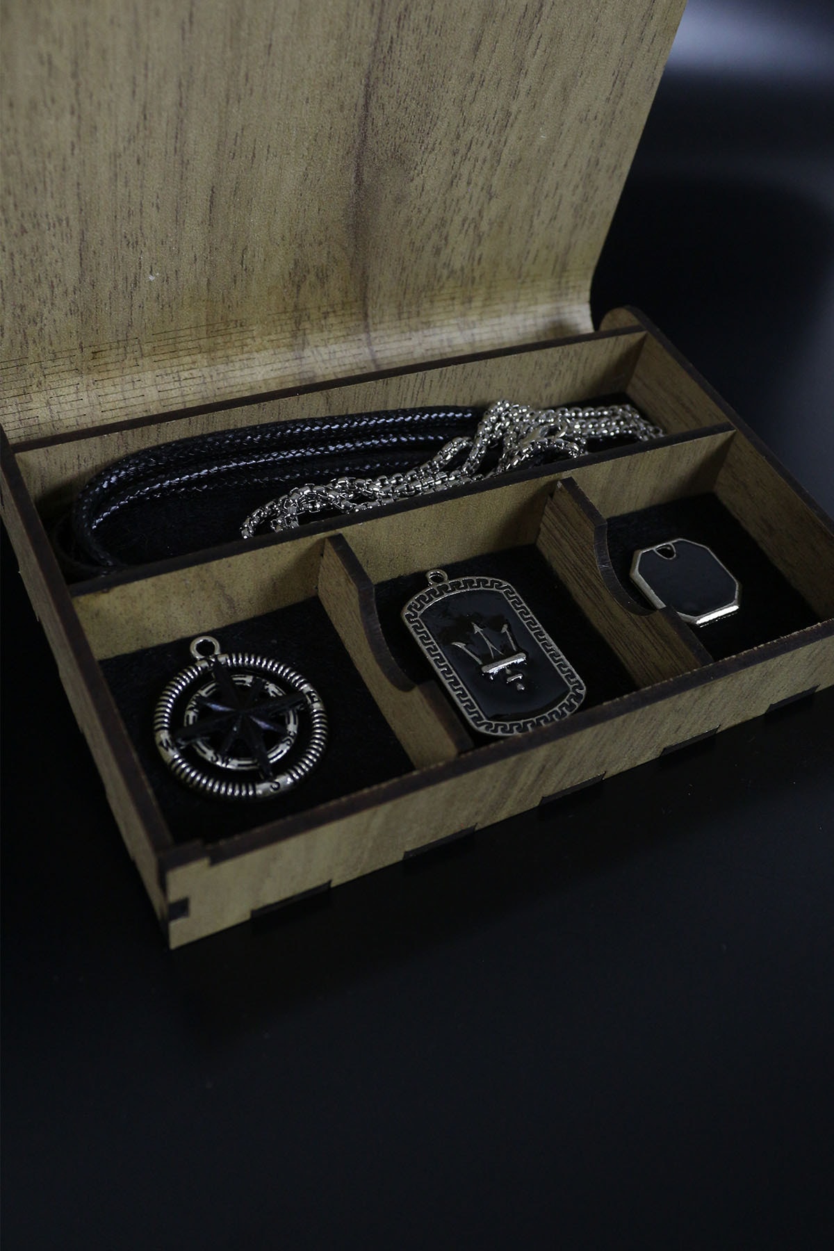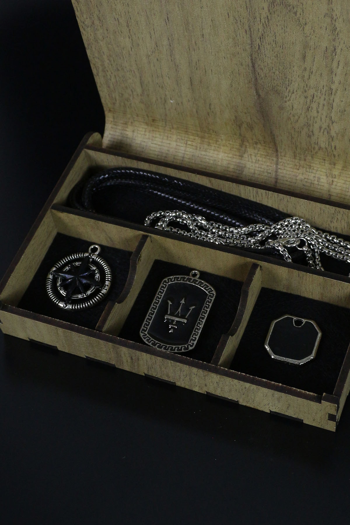 İçeriğinde 3 adet kolye ucu 1 adet örme zincir, 1 adet 3mm deri ip ve özel ahşap kutusu bulunmaktadır.