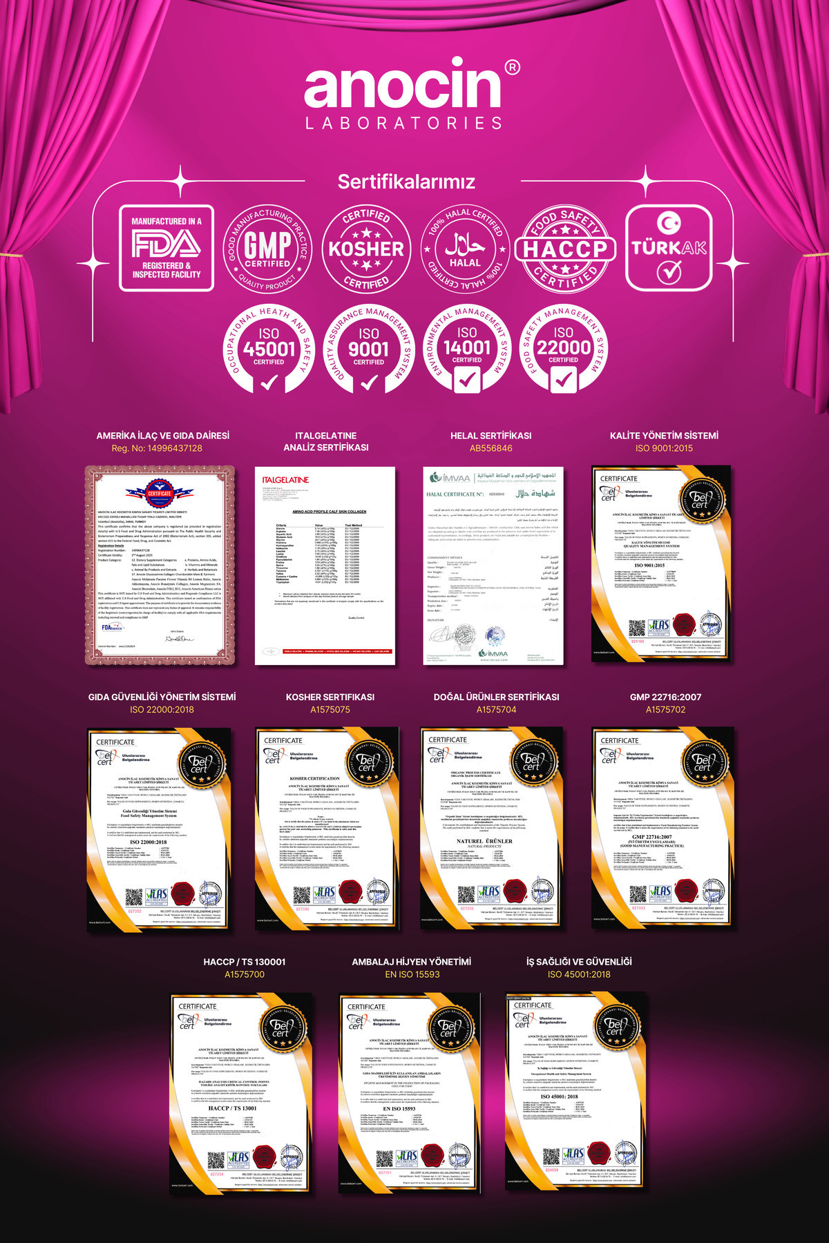 - Sığır kaynaklı kolajen tip I, II ve III ile cilt elastikiyetini artırır ve yaşlanma belirtilerini azaltır.
