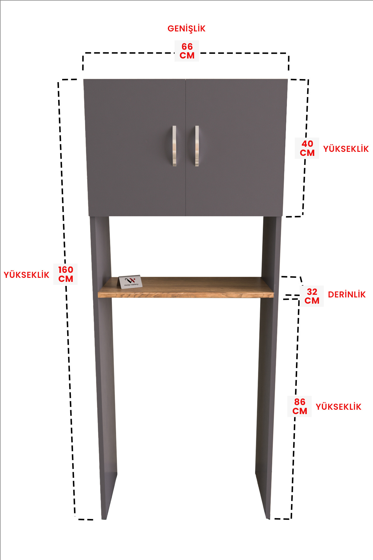 Olçüler: Genislik: 66 cm Derinlik: 32 cm Yerden Yükseklik: 160 cm Raf Yüksekligi: 34 cm Kapakli Ust bölüm yüksekligi: 40 cm Çamasir Makina Alan Ölçüsü: Yükseklik: 86 cm Genislik: 66 cm Ürün Özellikleri:Banyo Düzenleyicinizin imalatinda 18mm kalinliginda 1.