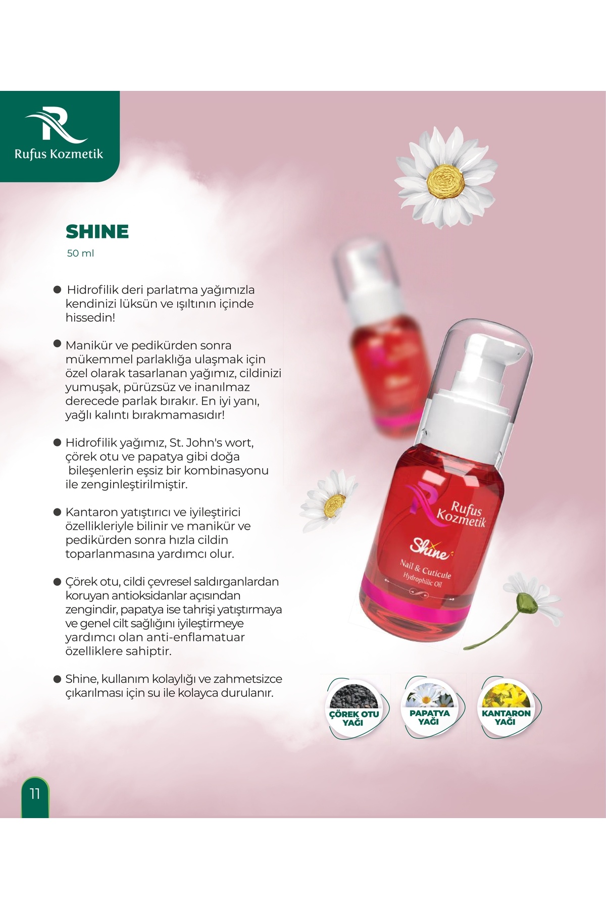 SHINE (hidrofilik yağ) 50 ml Hidrofilik deri parlatma yağımızla kendinizi lüksün ve ışıltının içinde hissedin! Manikür ve pedikürden sonra mükemmel parlaklığa ulaşmak için özel olarak tasarlanan yağımız, cildinizi yumuşak, pürüzsüz ve inanılmaz derecede parlak bırakır