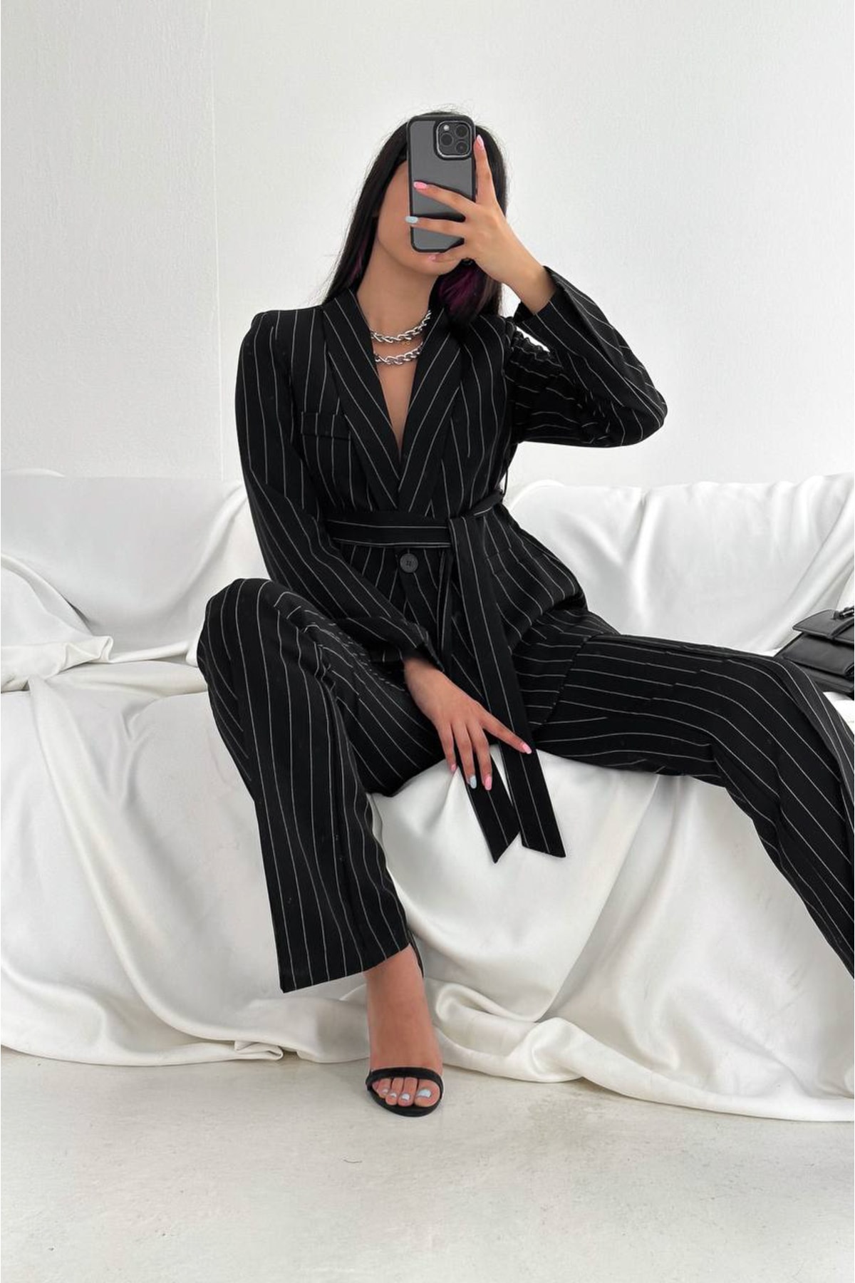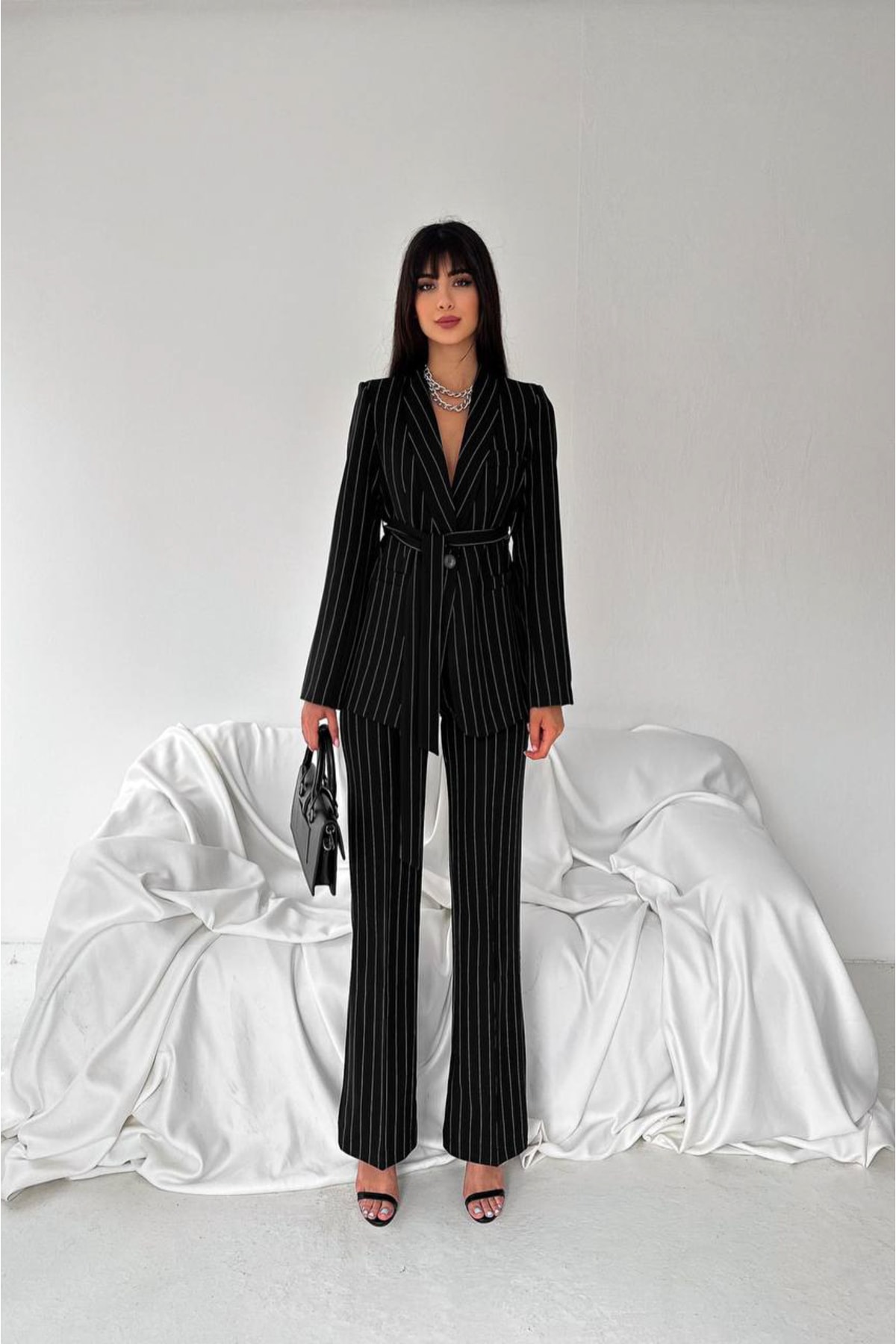 Kadın Bağlamalı Sahte Cepli Kemerli Şal Yaka Blazer Ceket Boru Paça Esnek Pantolon Takım Elbise