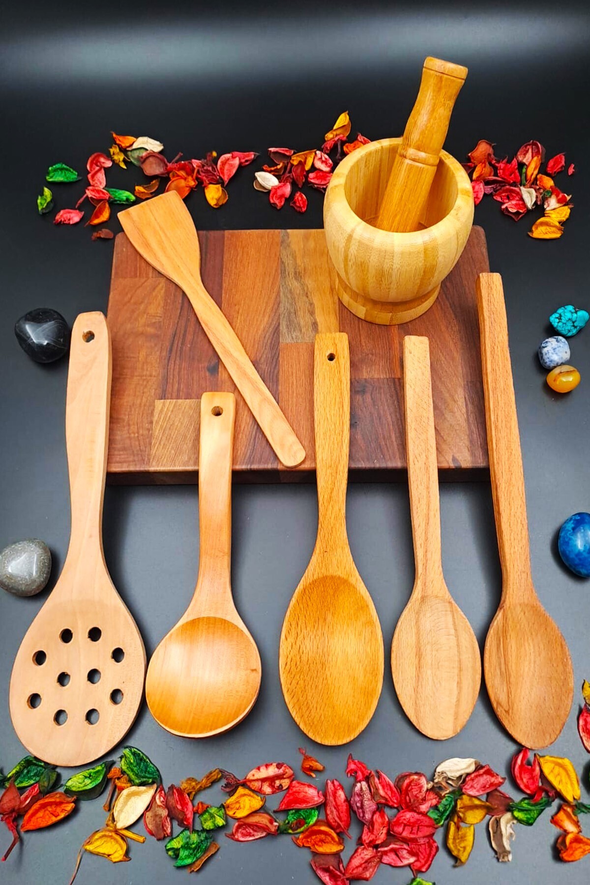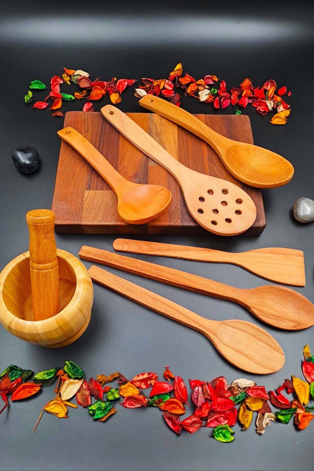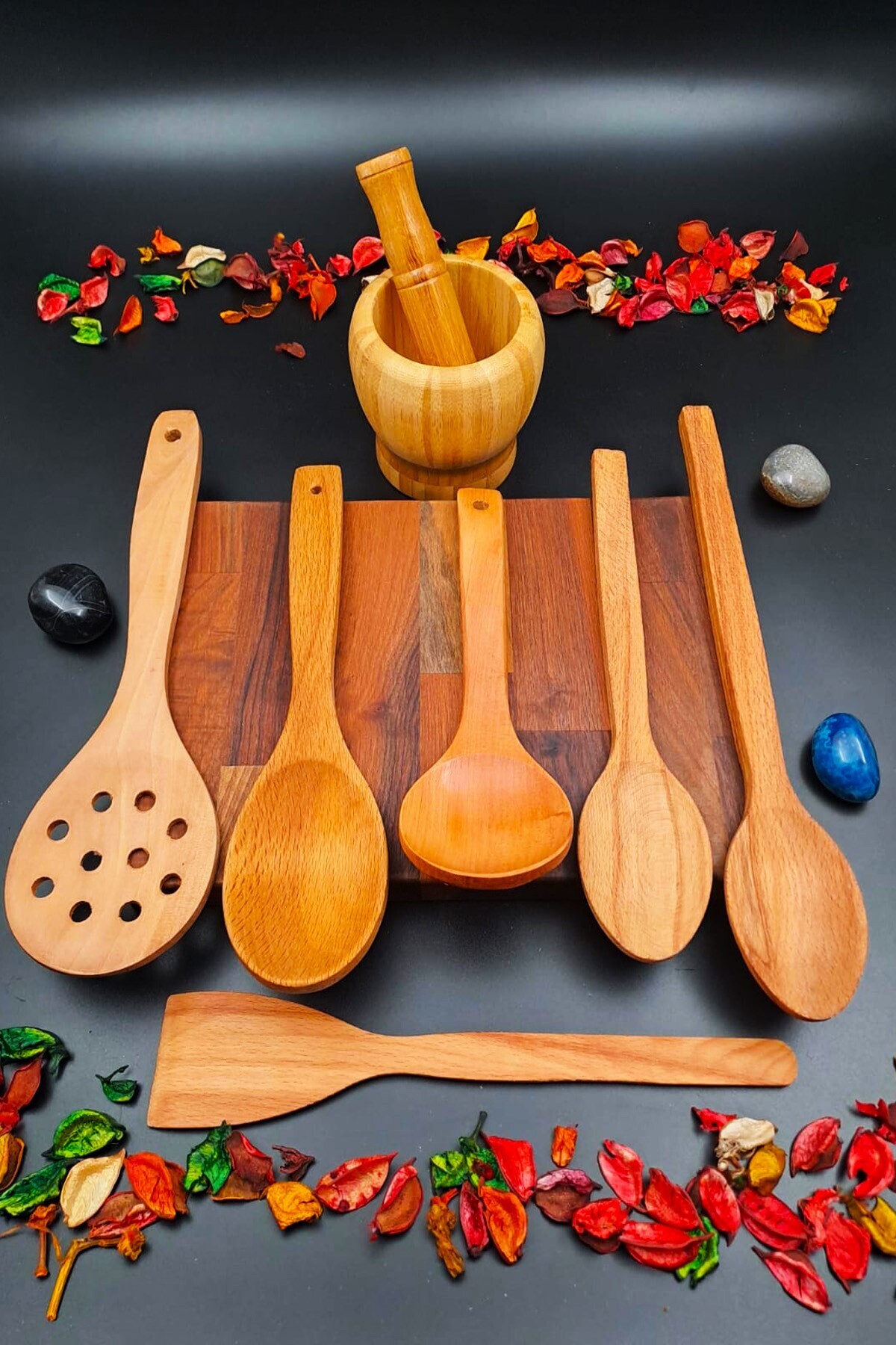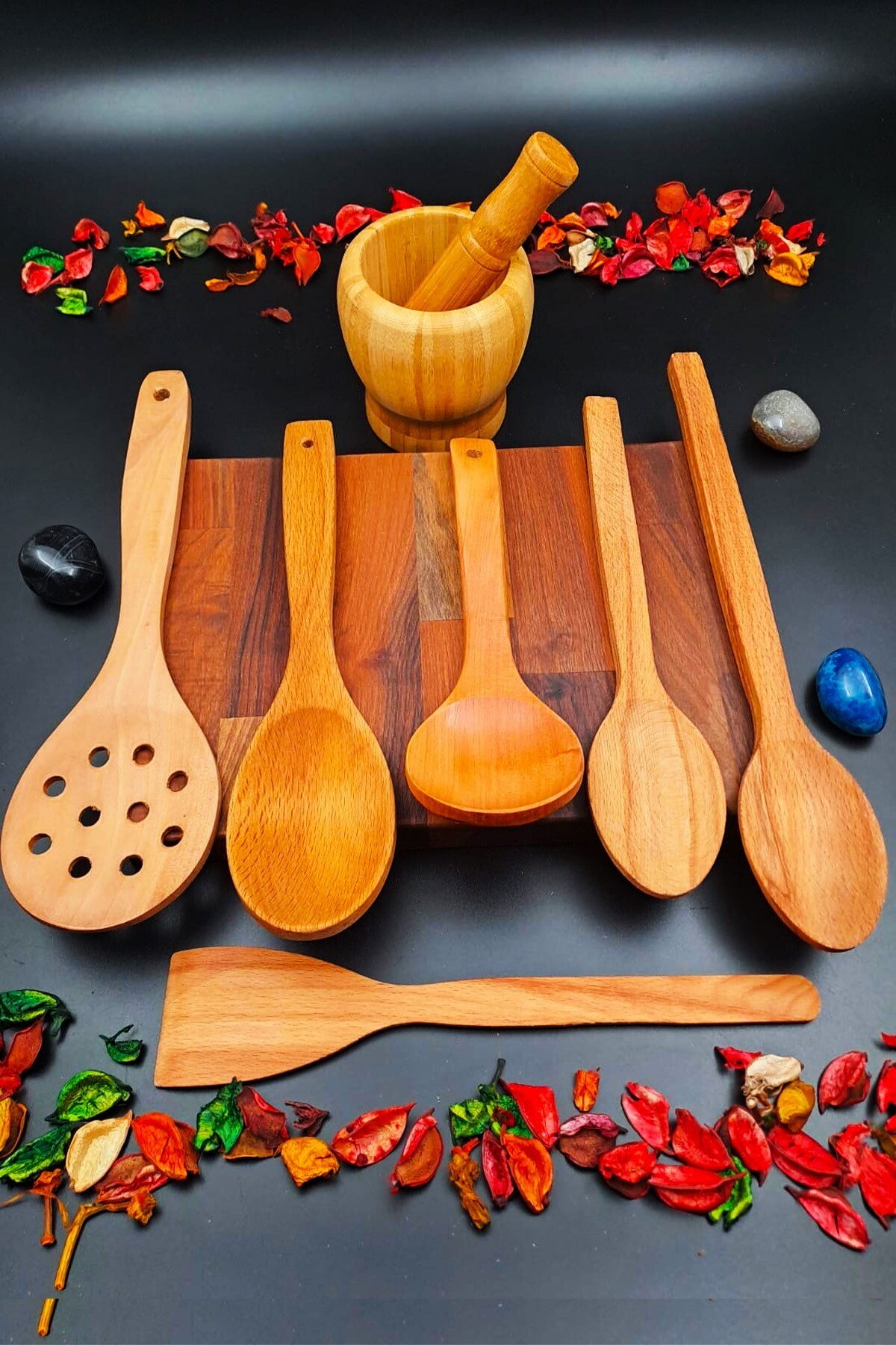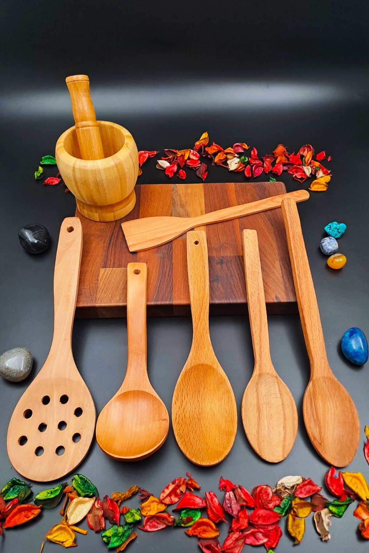 Paket içeriği: LÜKS AHŞAP Doğal Ahşap Mutfak Servis Kaşık Kevgir Spatula Kepçe Havan 8 'li Set El Işçiliği Çeyiz Seti