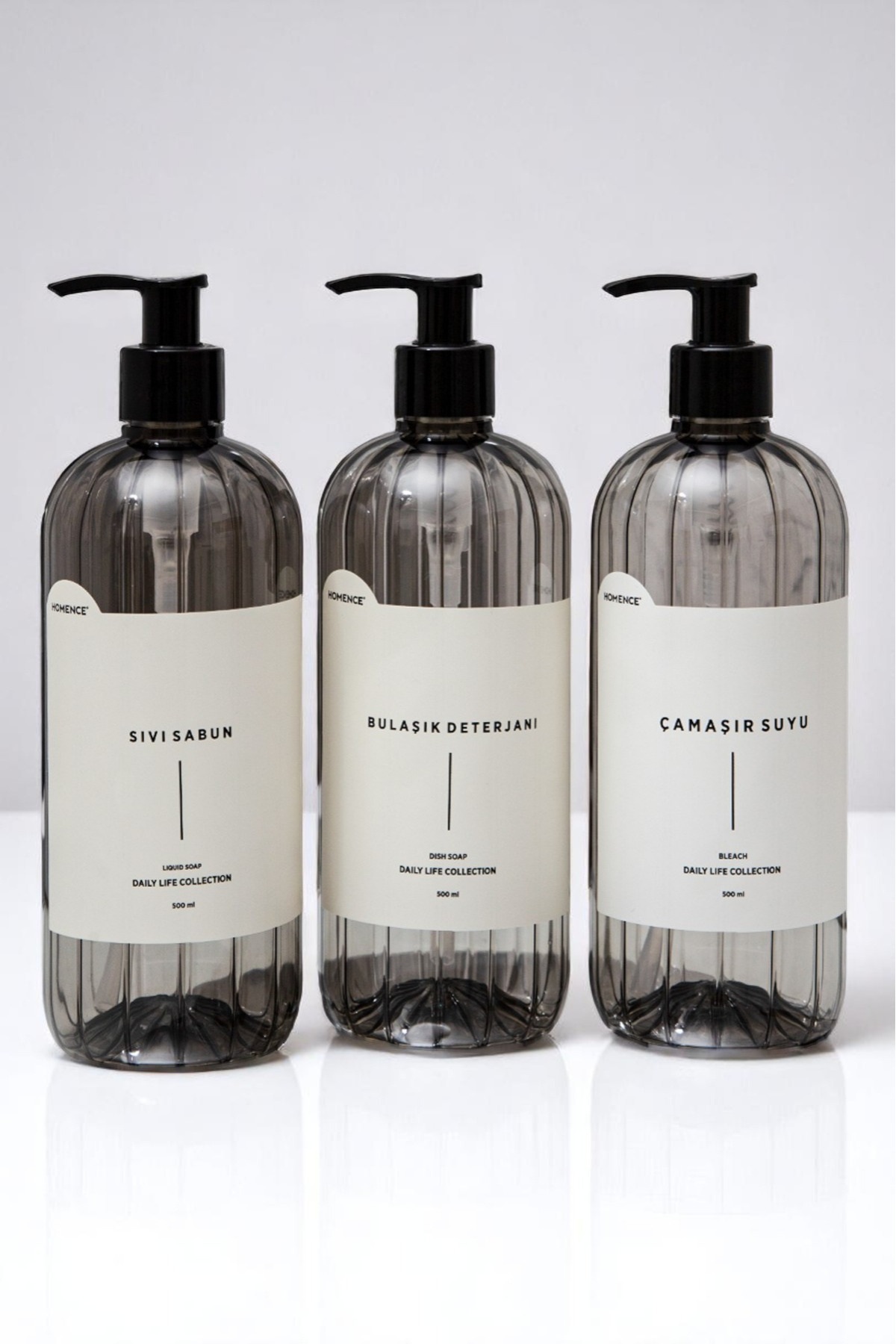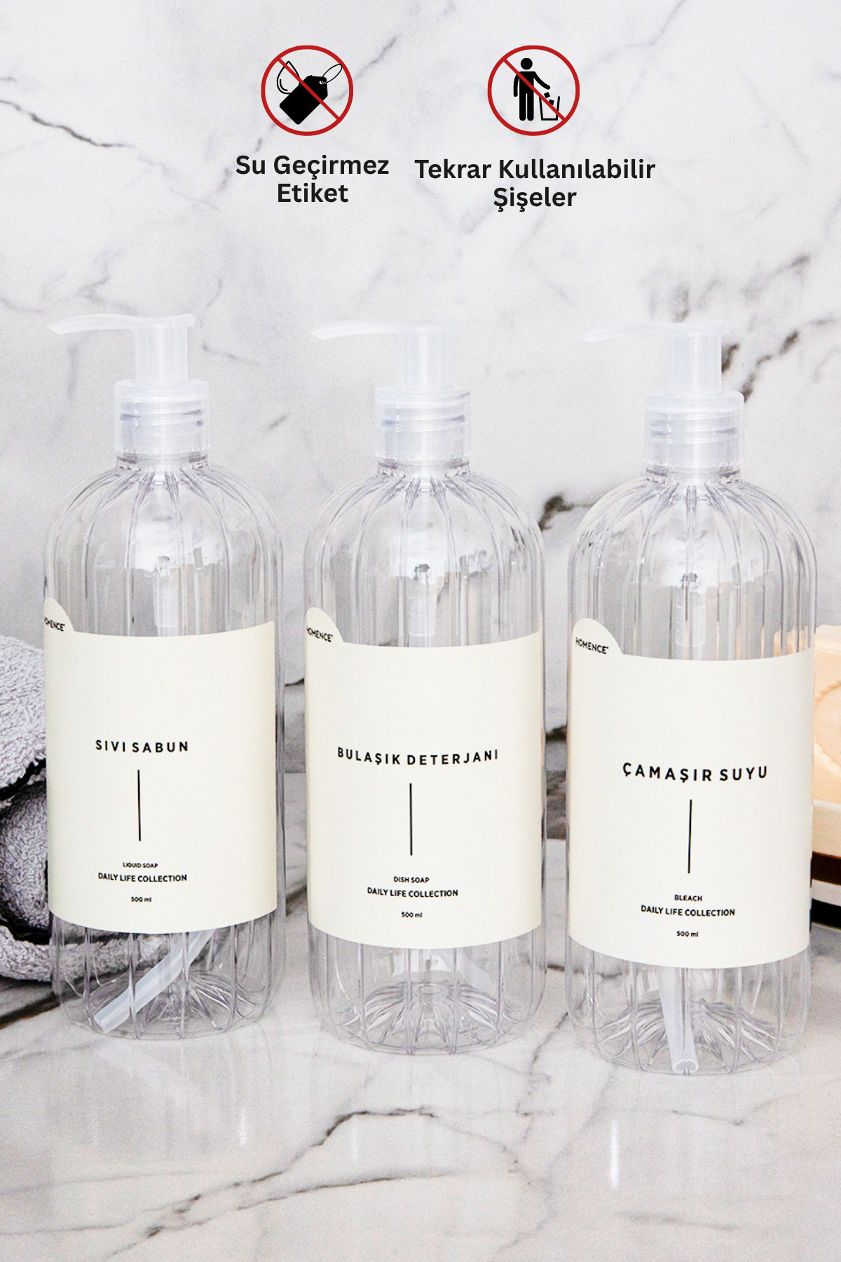 Paket İçeriği: • 1 Adet Sıvı Sabun Etiketli Şeffaf 500 ml Plastik Şişe • 1 Adet Bulaşık Deterjanı Etiketli Şeffaf 500 ml Plastik Şişe • 1 Adet Çamaşır Suyu Etiketli Şeffaf 500 ml Plastik Şişe • 3 Adet Siyah 24mm Kilit mekanizmalı Pompa Görsellerde dekor amaçlı bulunan ürünler paket içeriğine dahil değildir.