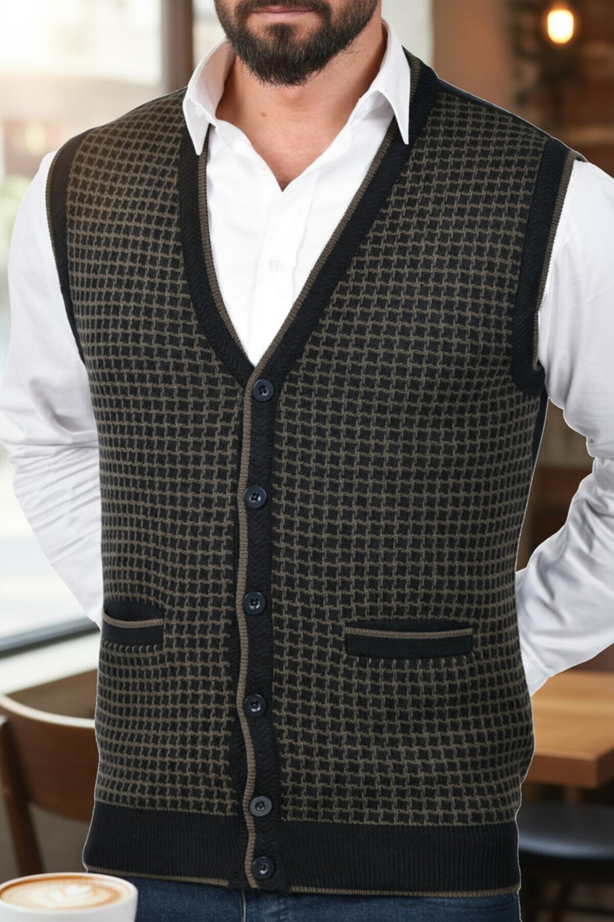 Siyah Erkek Çelik Örgü Düğmeli Cepli Kazayağı Desen Tüylenmeyen Triko Kışlık Kazak Yelek