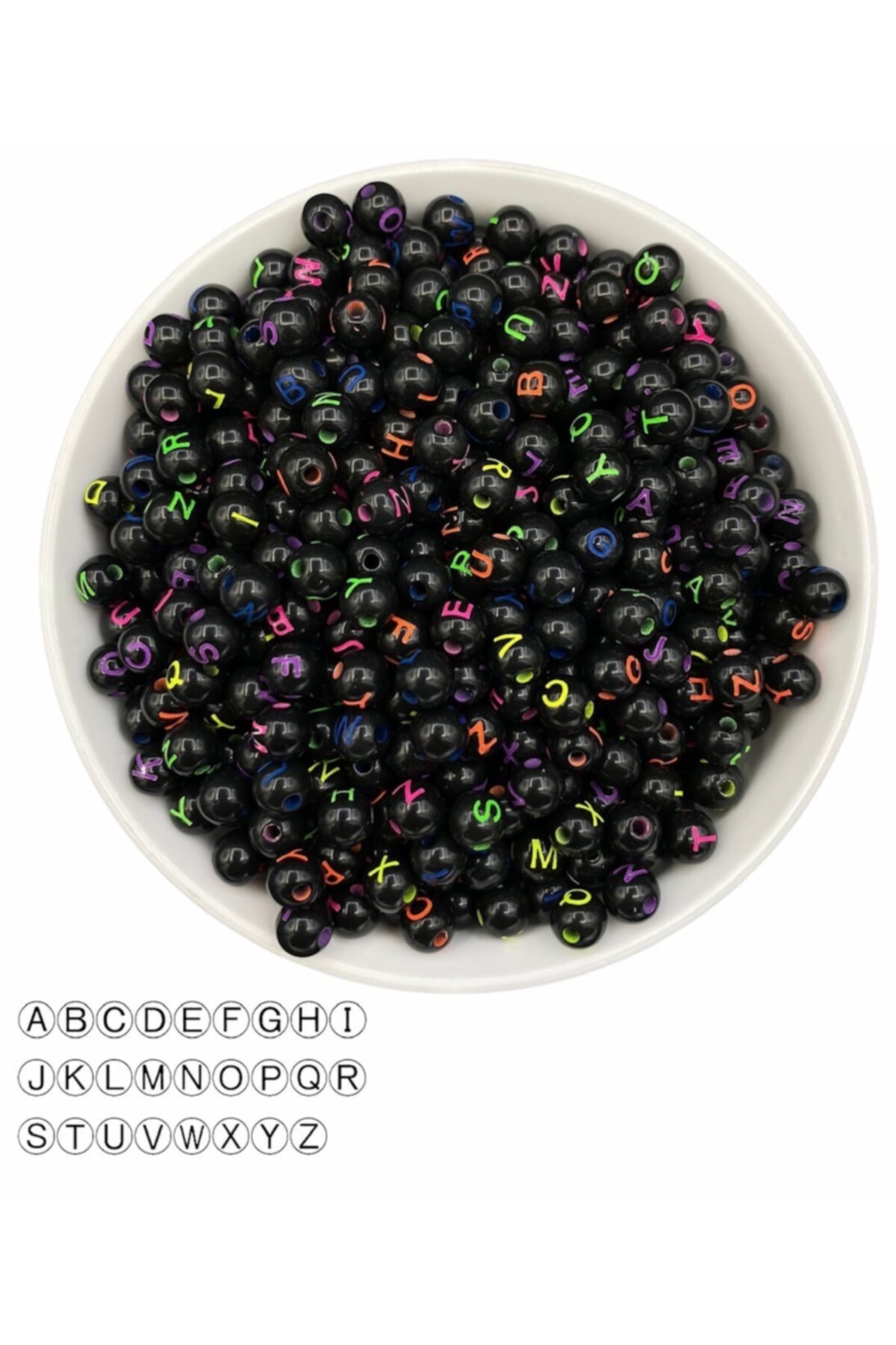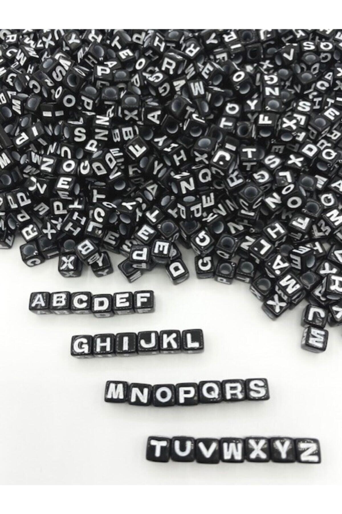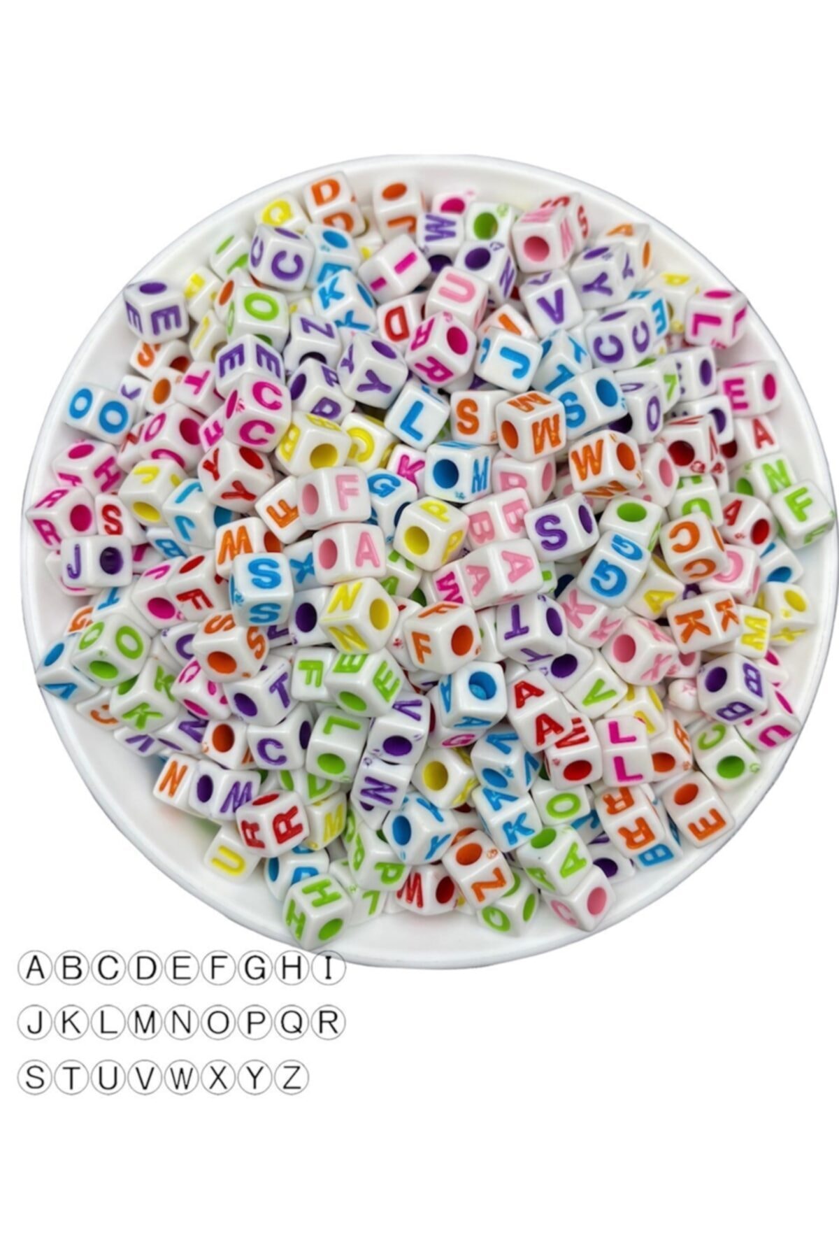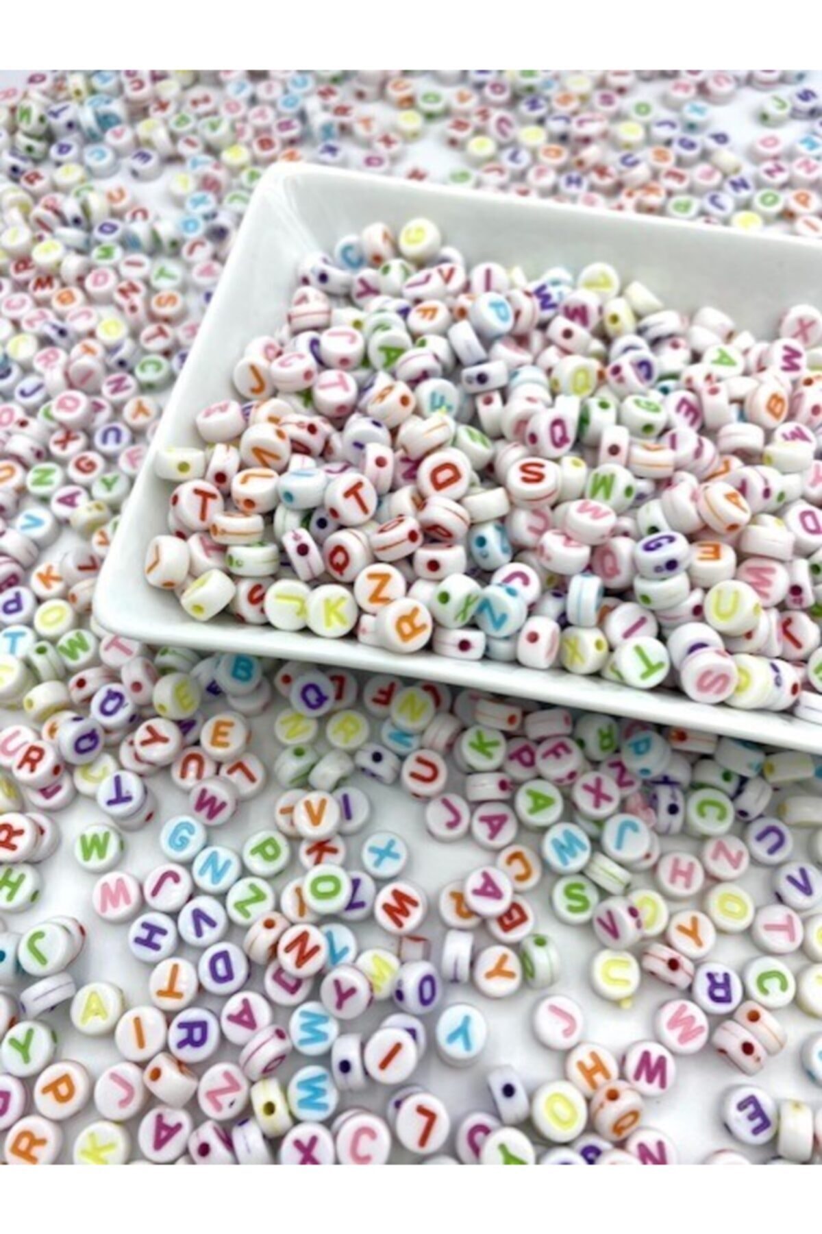 Beyaz fon üzerine karışık renk yazılı harf boncuk 100 gr paket fiyatıdır.