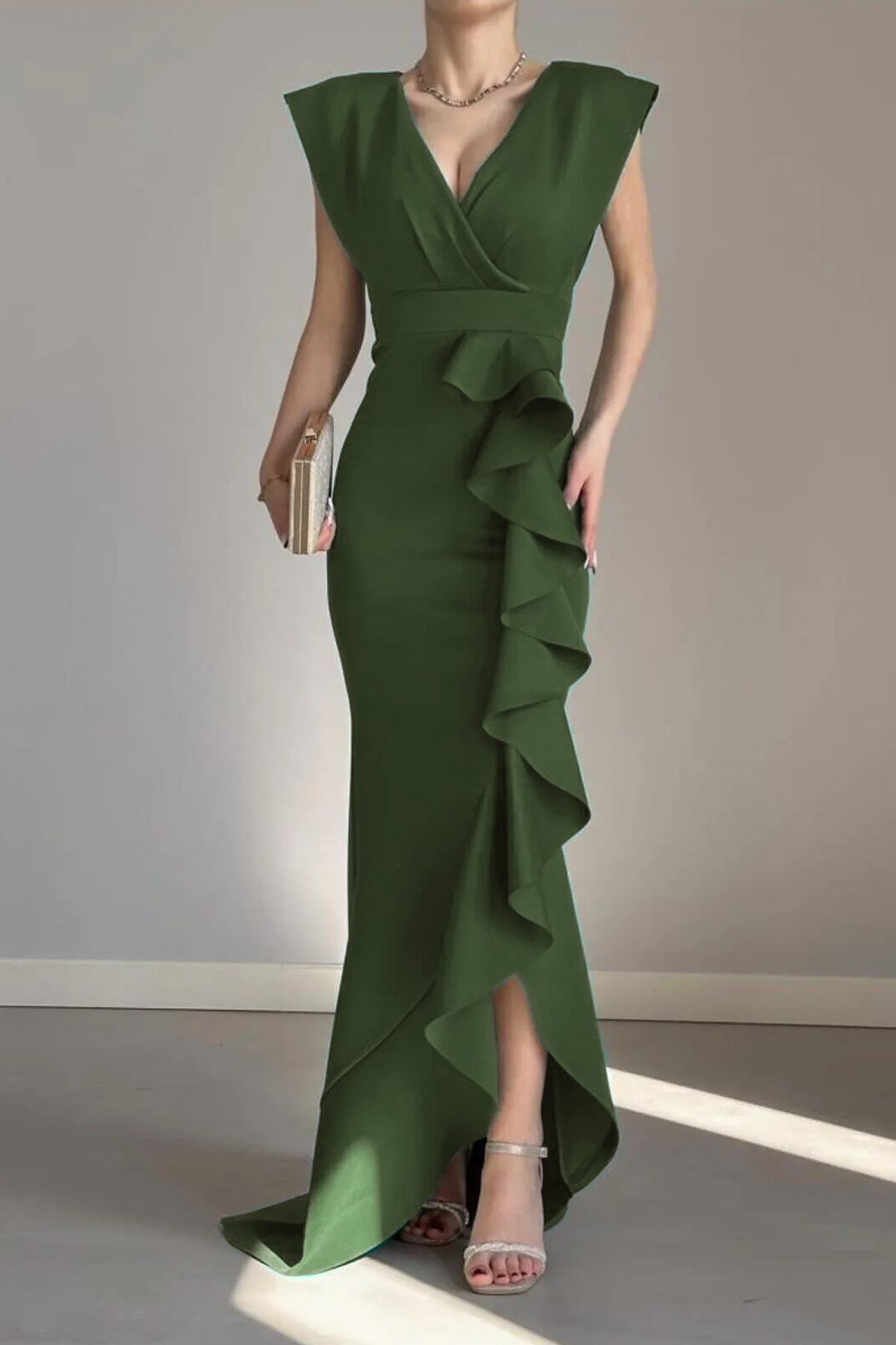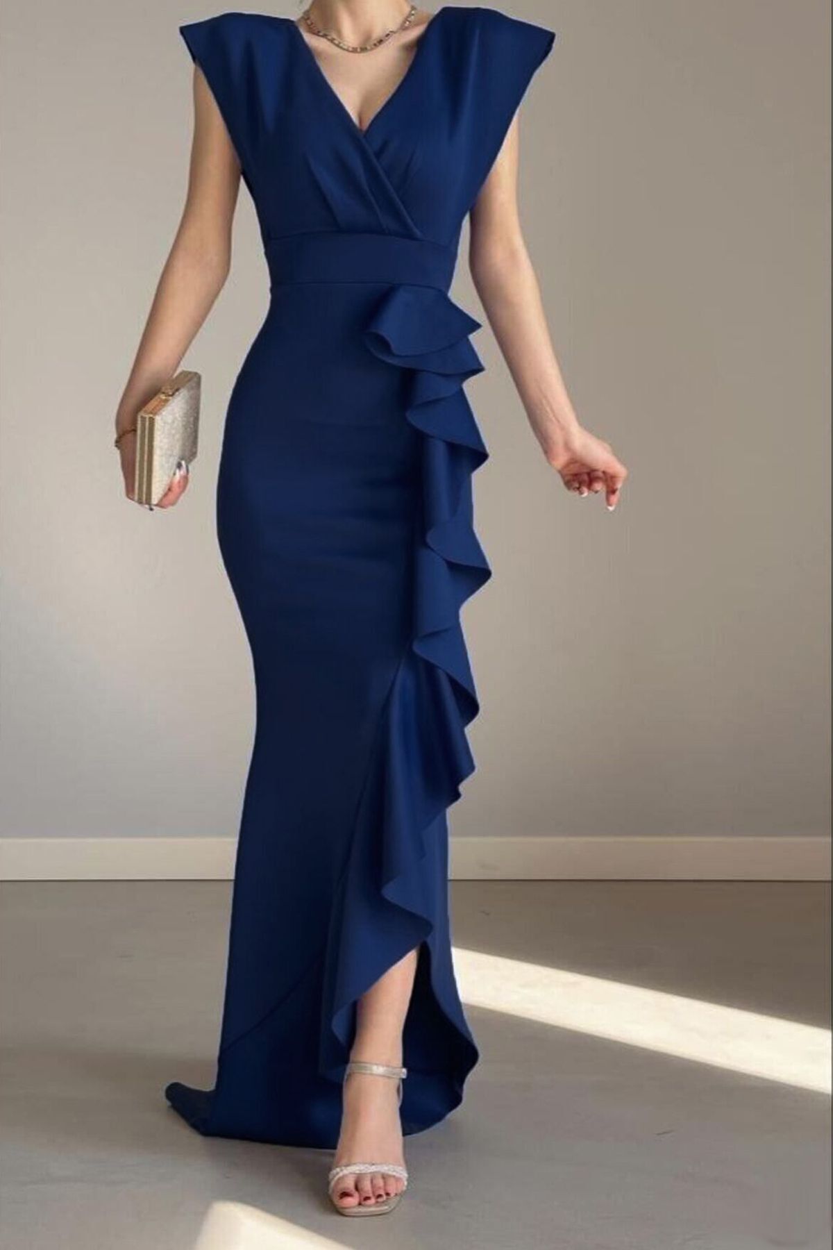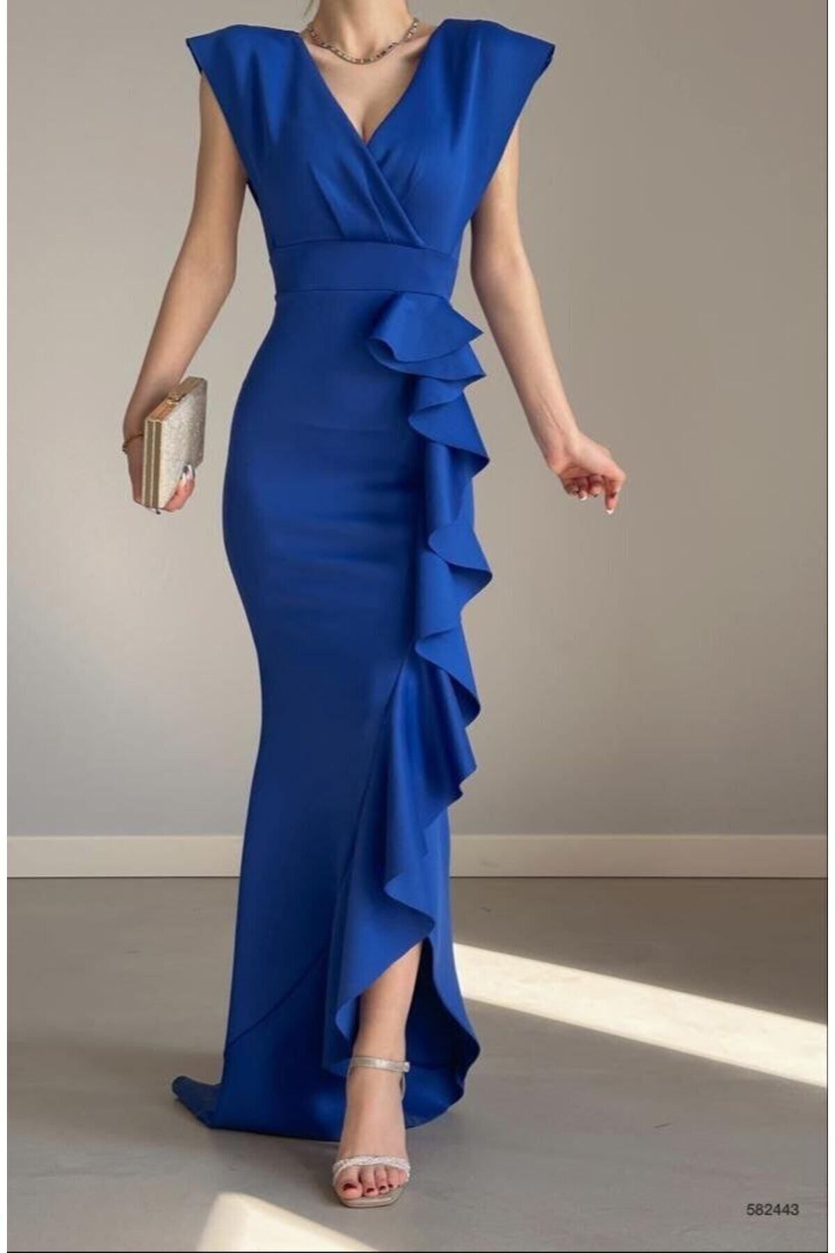 • Kadın Scuba Dalgıç Kumaş Kruvaze Yaka Eteği Volanlı Abiye Elbise (Renk Seçenekli)