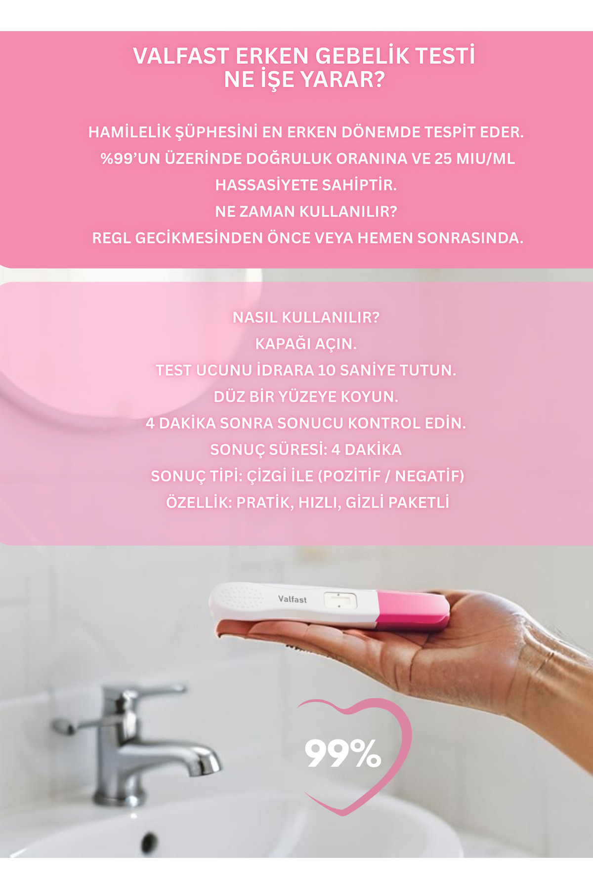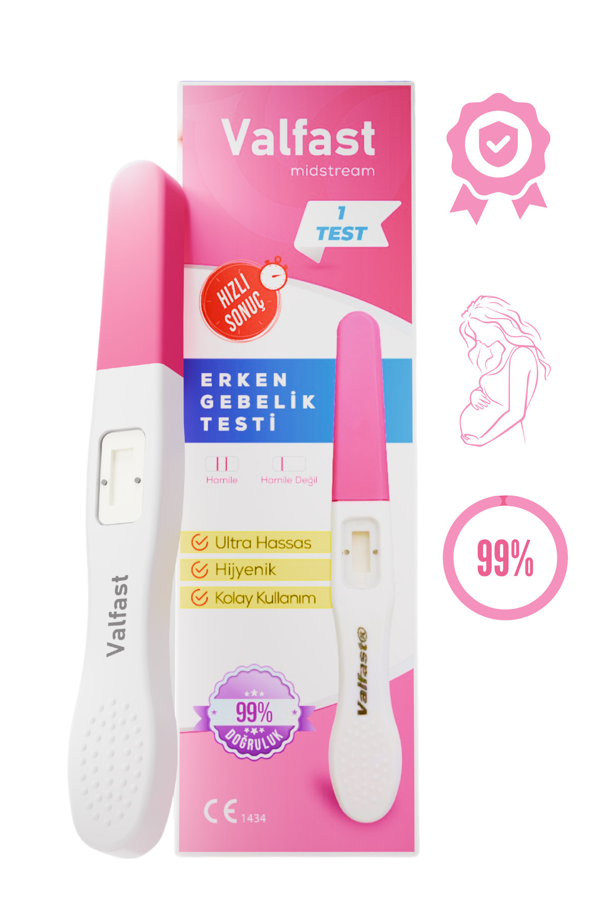 Valfast Erken Gebelik Testi Hızlı Hamilelik Testinin Kullanımı: 1: Paketin içindeki test kaleminin kapağını nazikçe çekerek açın. 2: Test kaleminin ucunu 10 saniye boyunca idrar akışında tutun ya da temiz ve kuru bir kapta toplanmış idrar örneğini testin ucundaki test bölgesine 10 saniye boyunca uygulayın. 3: Testi düz bir yüzeye koyun ve sonucuzunuzu görmek için dört dakika bekleyin. 4: Belirtilen süre sonunda sonucunuzu kontrol edin. Pozitif ya da negatif sonuç net ve kolay anlaşılır şekilde gösterilir. Uyarı:Bulanık çıkan ve beş dakikanın sonrasında beliren sonuçlar geçerli değildir.